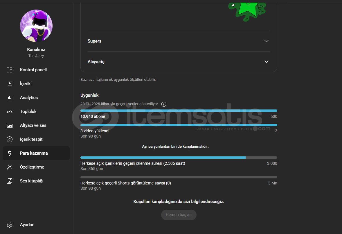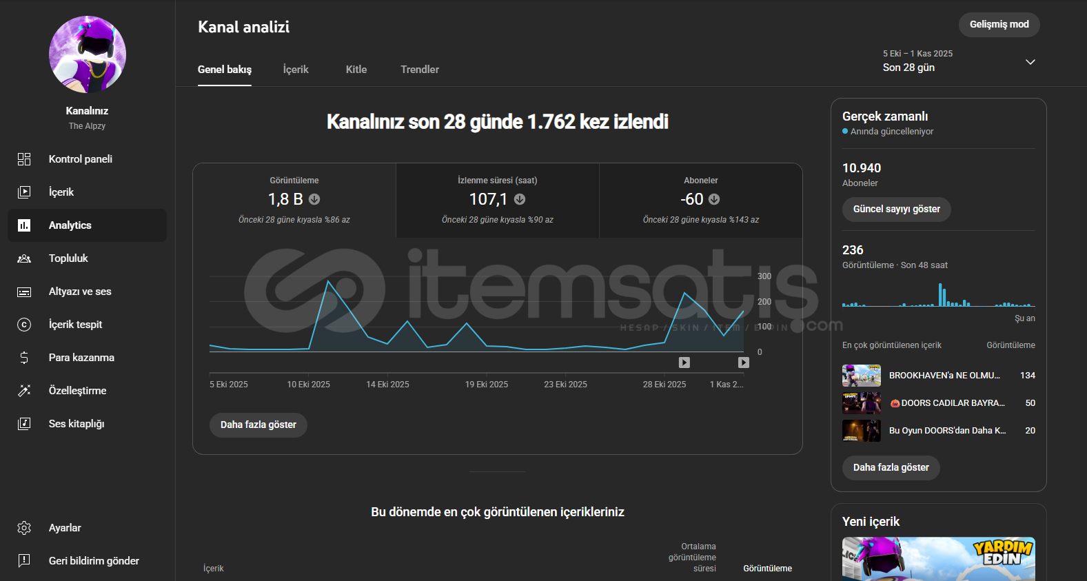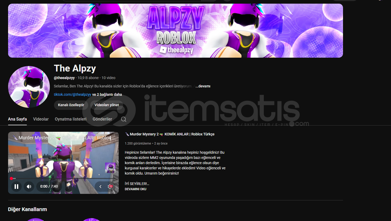 Kanal Detayları: Öncelikle kanalımız yaklaşık 3-4 aylık bir roblox kanalıdır. Kanalın ilk 8-10k abonesini shorts üzerinden kasıp geriye kanal 1k aboneyi yatay videolar aracılığıyla elde ettim. Kanalımda herhangi bir telif hakkı ihtarı bulunamamaktadır.Para Kazanma: Para kazanma saati 2.500 saattir. Açılmasına son 500 saat kalmıştır.Neden Satıyorum?: Önceli...