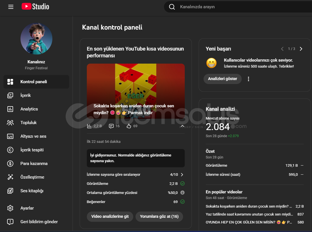 2.084 ABONE 595 SAAT İZLENME YAYINA UYGUN Para kazanma aktif edilebilir ,shotrs Videoların izlenme hacmi çok yüksektir,