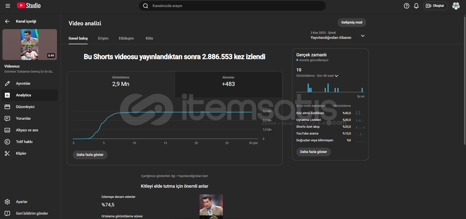 3 Milyon görüntülenmesi olan 555 aboneli kendi şahsi kanalımı satıyorum 13 14 gündür video atamıyom işten dolayı vakit ayıramıyorum para kazanamasını açmaya neredeyse ramak kaldı biraz uğraşan para kazanmayı açabilir alıcısına şimdiden hayırlı olsun