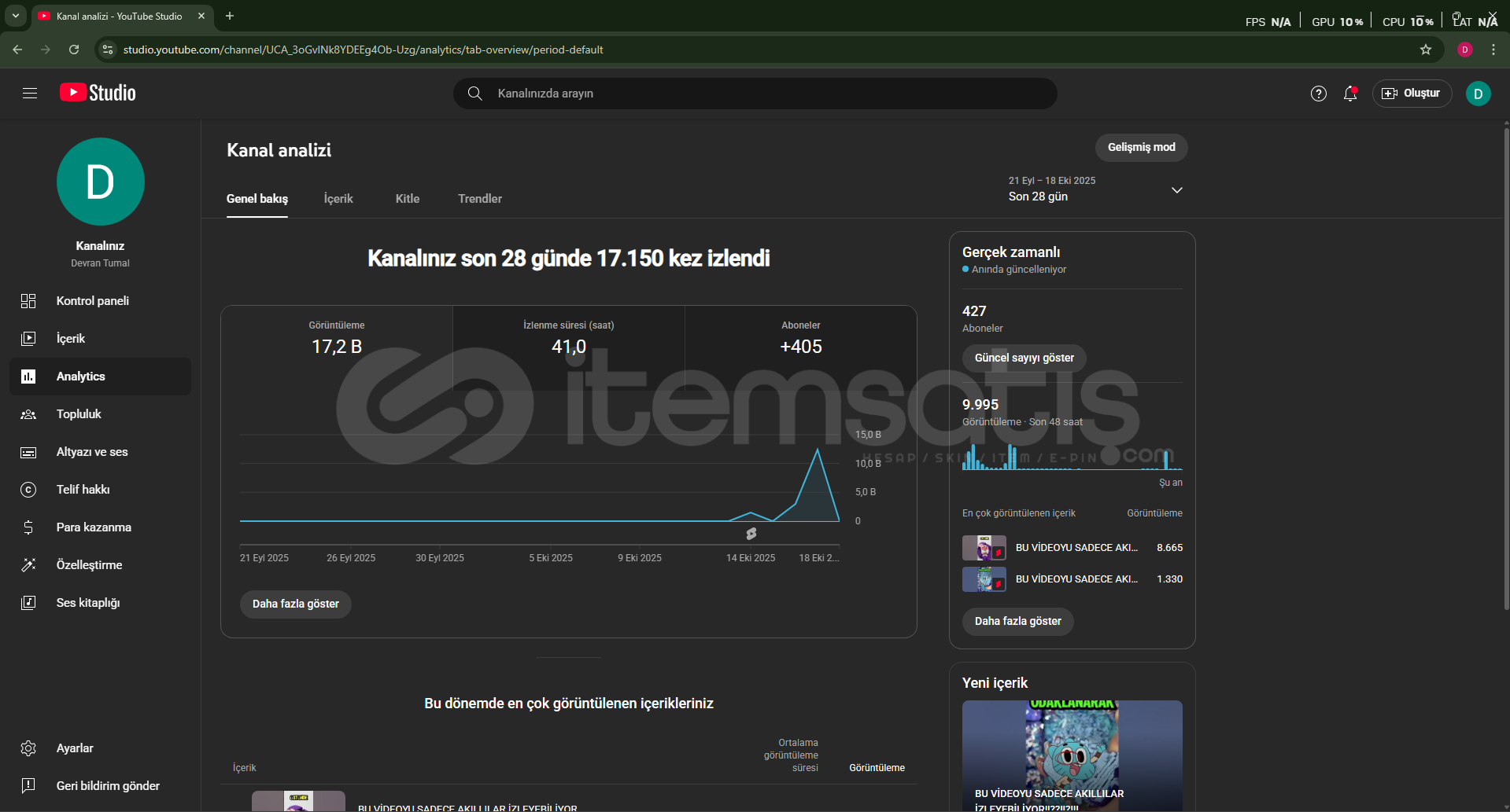 🎬 423 organik ve aktif aboneli YouTube kanalı satılıktır.