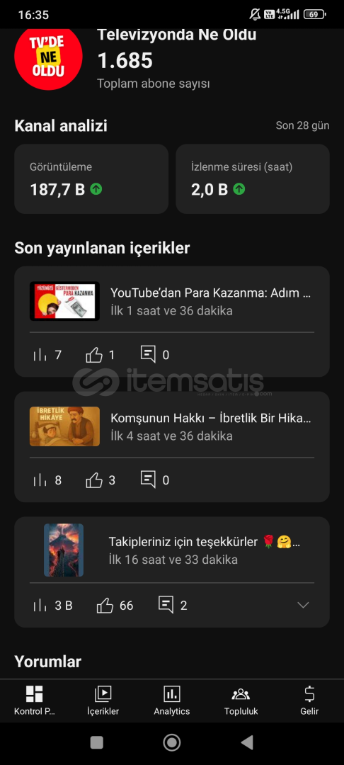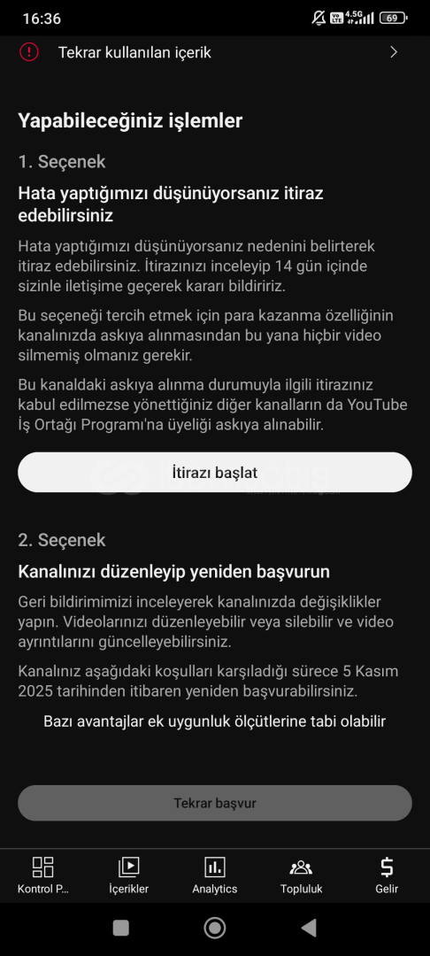 Kanal uzun video içerikleri ile yükseldi pk tekrar içerikten dolayı red yedi tüm içerikler silinip kanal organik tamamen kendi ürettiğimiz videolar yüklendi etkileşim güzel 5 kasım 2025 de tekrar başvuru yapabilirsiniz bu arada 1 telif var süreli 10 ocak 2026 da bitiyor bilginiz olsun fiyat cazip tutuldu alana hayırlı olsun