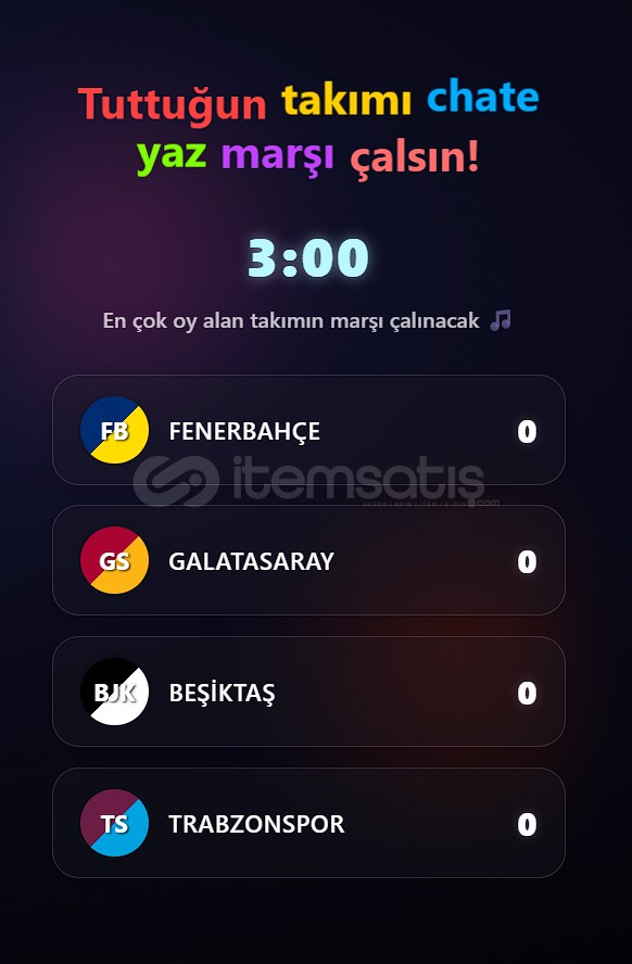 Youtube sohbetini anlık olarak takip eder ve oyları alır, kazanan takımı belirler ve marşını çalar. herşey otomatik olarak çalışır sadece Yayın ID girmeniz yeterli başlatmak için.