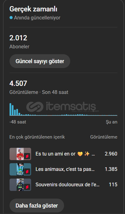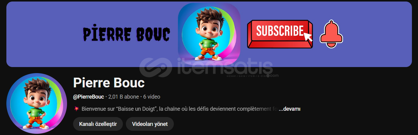 Kanal URL: https://www.youtube.com/@PierreBoucKanal Abone Sayısı:2000Son 1 Yıllık 4.000 saat izlenme süresi:350Toplam Görüntülenme: ömür boyu 64kSon 90 Günlük shorts görüntüleme sayısı: 64kKanal Kategorisi ve Dili: Eğlence-test Fransızca shortsHesap Durumu: TEMİZMarka hesabıHesap Kayıt Tarihi:2025Özel URL Uygunluk: DeğiştirilebilirKatıl Butonu: -Adsense Detaylar&...