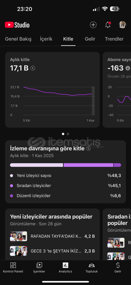 full aktif 5 yıllık youtube kanalı. kitlesi sabittir toplam 45 milyon görüntüleme vardır para kazanması açıktır İhlal Durumu: Tertemiz kanal sorunsuz