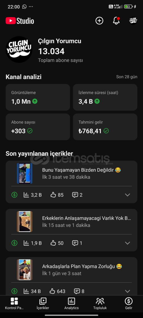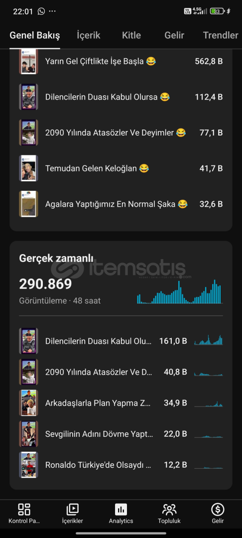 Kanalımin Günlük Getirisi 400₺ dir aylık ortalama 15-30k arası gelir üretebilir her videoların yapılışını ogreticem alan kişiye devam edilirse çok büyük kazançlar sağlarsınız yeminle aciliyetten krediyi kapatmak için satıyorum yoksa hiç satmam yanında Instagram ve tiktok hesabı ile beraber verilicek