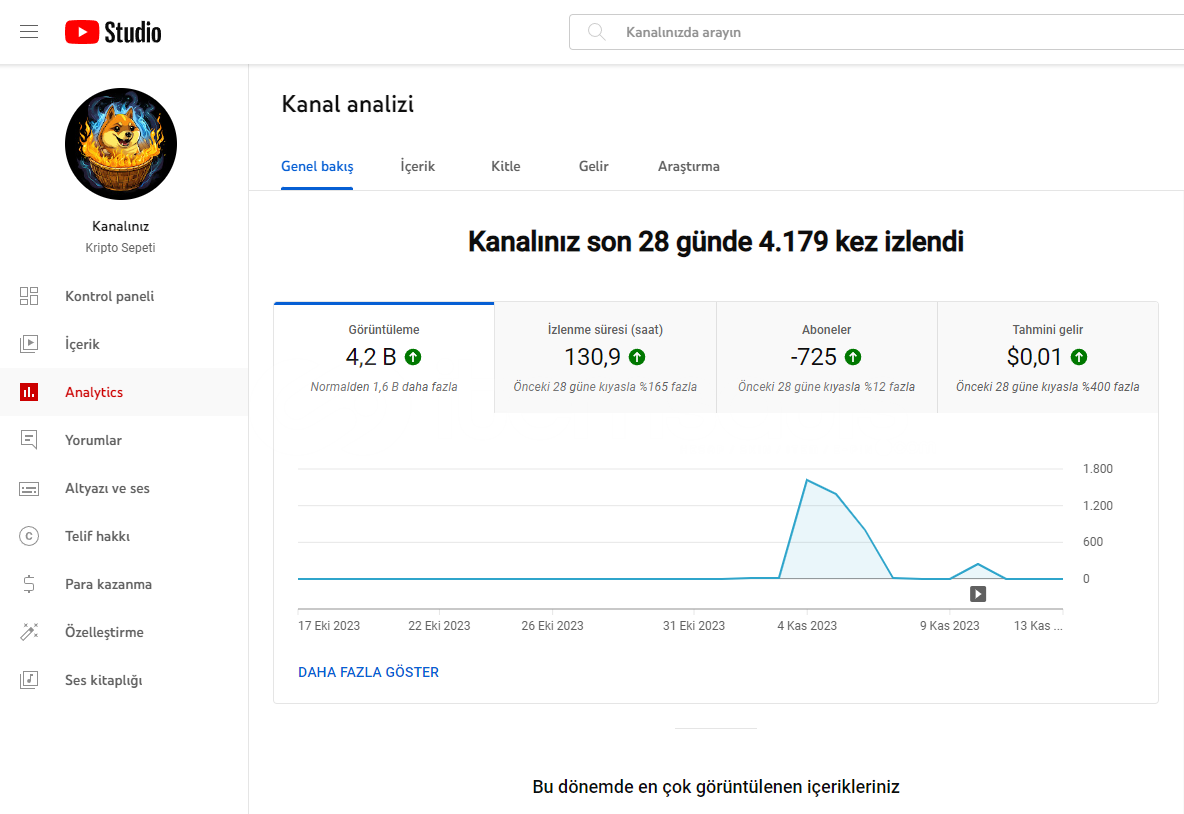 NOT : 1 AY BOYUNCA DÜZENLİ VİDEO İLE DAHA İLERİ SEVİYE HALE GİDER. ŞUANKİ DURUMUM KANALIN ÜSTÜNE DÜŞMEME İZİN VERMİYOR. KANALI CANLANDIRABİLECEK VE AKTİF VİDEO ATACAK ARKADAŞLAR İÇİN BÜYÜK BİR FIRSAT