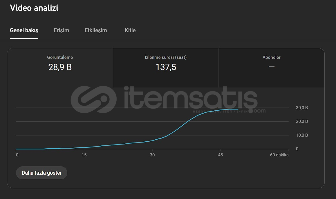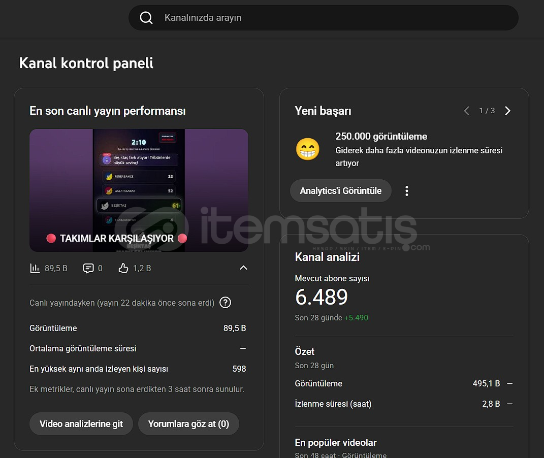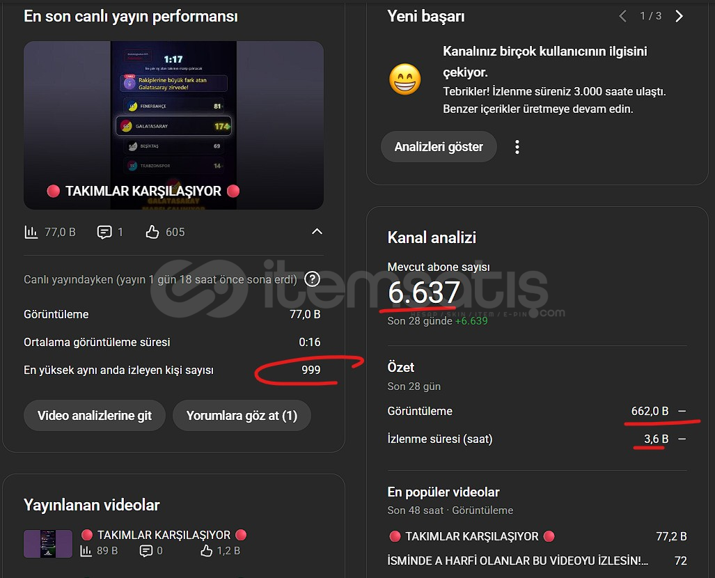 KEŞFET AÇIK ULTRA VIP HESAP----- Otomatik Teslimattır, Burada olmasam bile alabilirsiniz. ------------3600 Saat izlenmesi ile Para Kazanma açma eşiğindedir.Hesapta bot vesaire herhangi bir işlem kesinlikle yoktur. Tamamen kendi scriptim ile ( Yakında satışa sunulacak olan Canlı Yayın Premium Edition ) doğal olarak kasılmıştır. Her bir abone her bir izleyici doğaldır ve 7040 Abonesi bulunmaktadı...