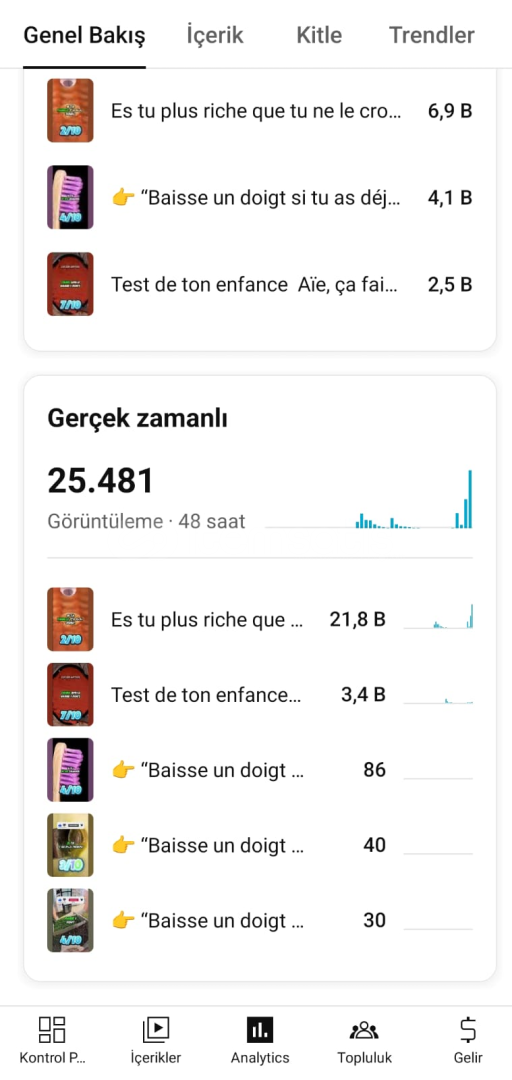 Kanal ÖzetiÜlke: FransaOluşturulma / Katılım Tarihi: 19 Ekim 2025Abone Sayısı: 2.270Video Sayısı: 8Toplam Görüntüleme: 28.997Son 48 Saat Görüntülenme: +25.000 (keşfet mekanizmasında güçlü aktivasyon)Momentum: 1 haftalık süreçte abone ve izlenme hızla yükseliyor; 3.000 abone bandına kısa sürede ulaşma potansiyeli mevcut.