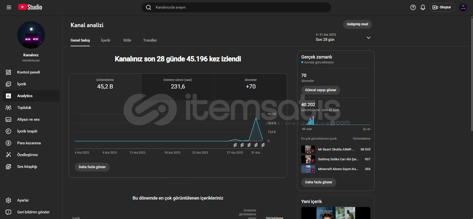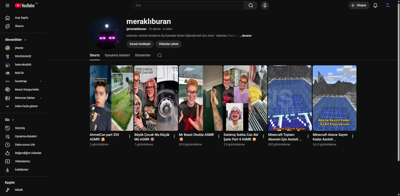 kanalda toplam 6 video vardırhergün saat 12de video atılıyorkanal satılana kadar video atılmaya devam edilicektirönce mc sonra asmr atılmıstırmail sifre olarak teslim edilirtel no bağlı değildir hesap bilgileri geçirildikten sonra iade olmazherhangi bir sorunuz varsa bana yaza bilirsinizömer03 güvencesiyle