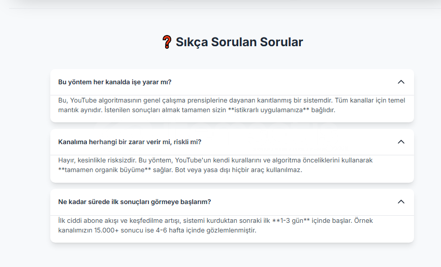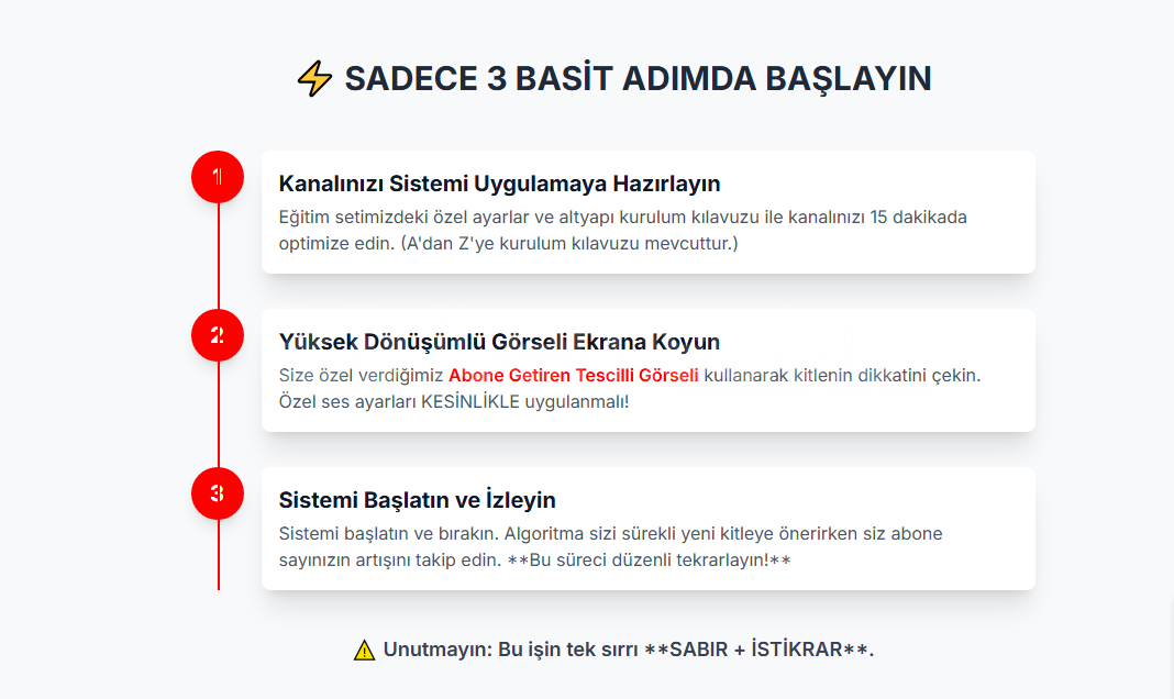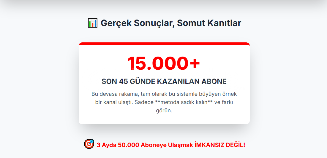 KANITLANMIŞ YÖNTEM1 Ayda 20.000+ ORGANİK Abone Kazanmanın Sırrını Keşfet!Saatlerce süren video kurgularını unutun. YouTube algoritmasının en sevdiği, %100 risksiz ve garantili yöntemle kanalınızı hızla büyütün.Gerçek Sonuçlar, Somut Kanıtlar15.000+SON 45 GÜNDE KAZANILAN ABONEBu devasa rakama, tam olarak bu sistemle büyüyen örnek bir kanal ulaşt...