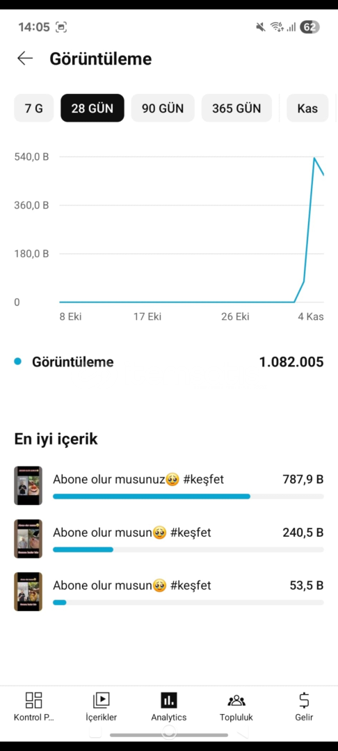 Hesap üç günde 1m izlenme 11.348 abone kazanmıştır