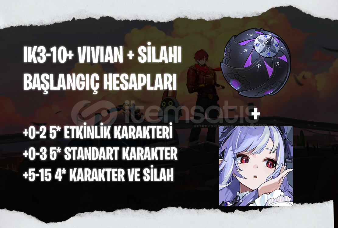 Bu ilanı satın aldığınızda IK3+ seviyesinde içerişinde Vivian + Kendi silahı (Flight of Fancy) bulunan bir hesap tarafınıza iletilecektir.Hesapların içerişinde 0-3 adet 5* standart karakter içerebilir.Hesapların içerişinde bir miktar polychrome bulunabilir.Tüm hesaplarımız garantilidir  ve alım sonras eposta bilgile...