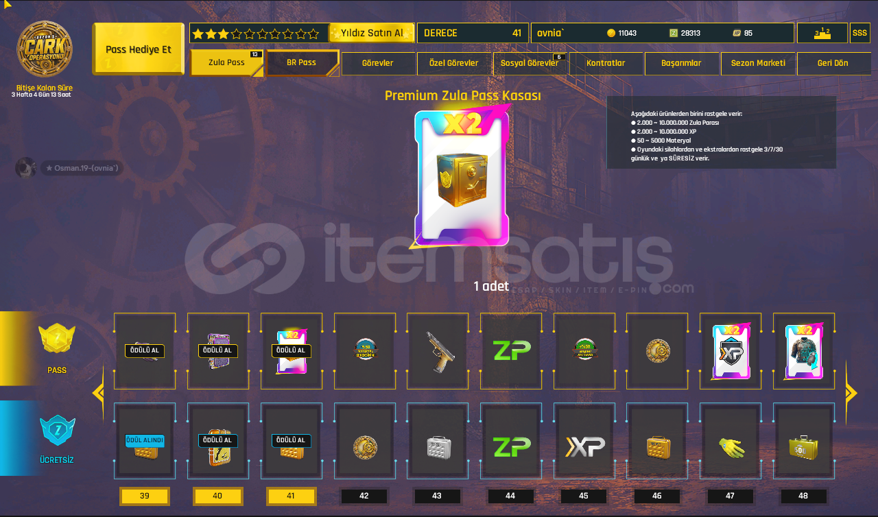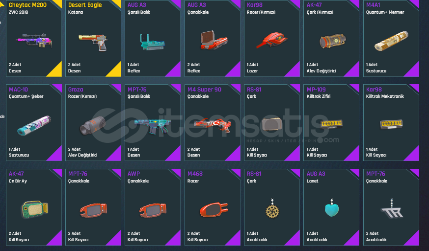 Seviye: 90zula pass da var Silahları full + basabilirsiniz2.KDA11000 za varNADİR ZWC DESEN 2 ADETİkili bomba (+6)[Sınırsız] MehmetçikMPT~76 (+6)AUG A3 (+7)L115A3 (+6)M93R (+6)GLOCK 18 (+6)KELEBEK (+7) SINIRSIZUSTURA (+7)KARAMBİT (+6)İKİLİ C5 (+6)KAR98+7RSR1+5ÖNEMLİ + YAZILMIŞTIR9 TANE sınırsız SPREY7 TANE İSİM DEĞİŞTİRME4 TANE İSTATİSTİK SIFIRLAMAUZUN ÖMÜR...