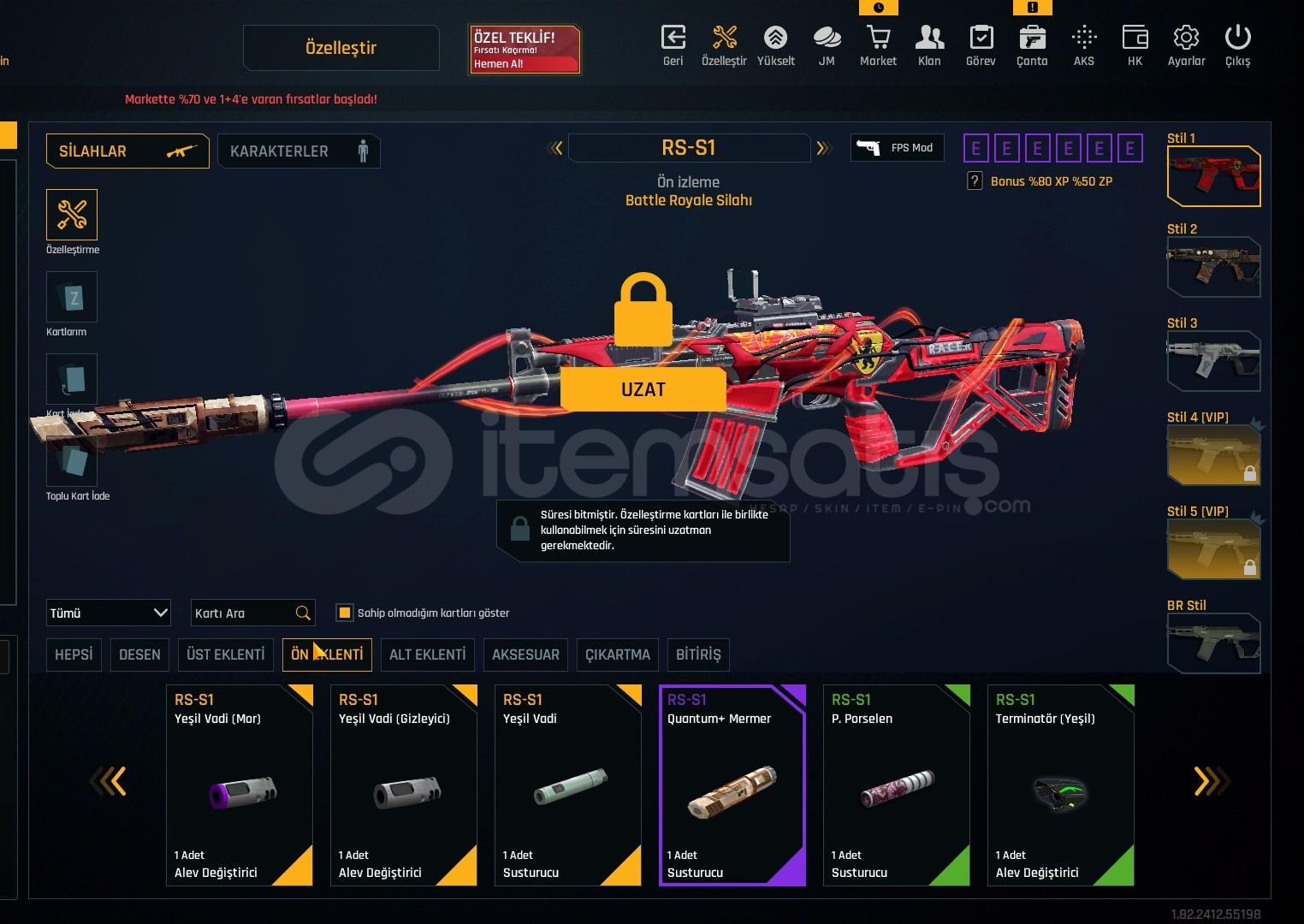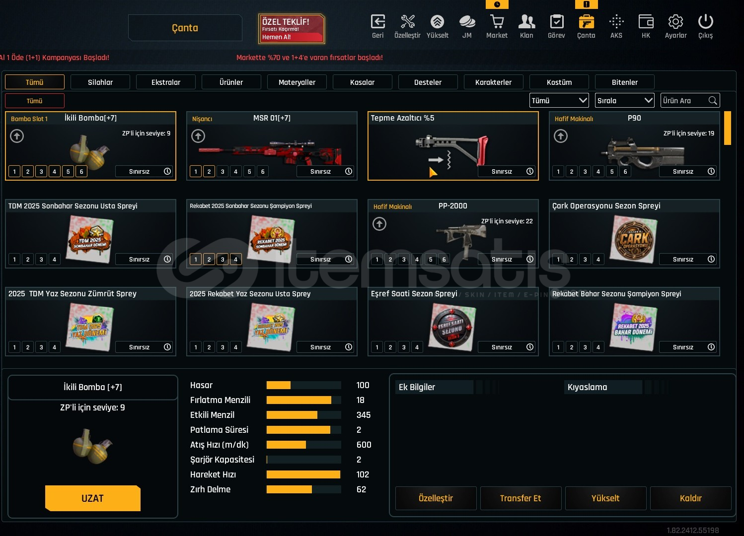 LEVEL: P-5REKO RANK: USTA 94KD: 1.91ŞANSLI BALIK DESENLERRACER DESENLERMETA SİLAHLARDA QUANTUM+ VE REFLEX+ZSL SEZON 3 KARAMBİT10. YIL AUG A3REKABET ŞAMPİYON DESENLERİ ( 2 AY )İKİLİ BOMBA ( HASAR GÖSTEREN )[ SINIRSIZ ] +7 MSR 01[ SINIRSIZ ] +7 İKİLİ BOMBA[ SINIRSIZ ] TEPME AZALTICI %5[ SINIRSIZ ] REKABET ŞAMPİYON SPREYİ 2X+7 KAR98+7 MPT+6 AUG+7 RS-S1+6 ATAK+7 MSR01+7 AWP+7 L115A3+7 CNK+7 M93R+7 WİLDCATSUSTURMA YO...