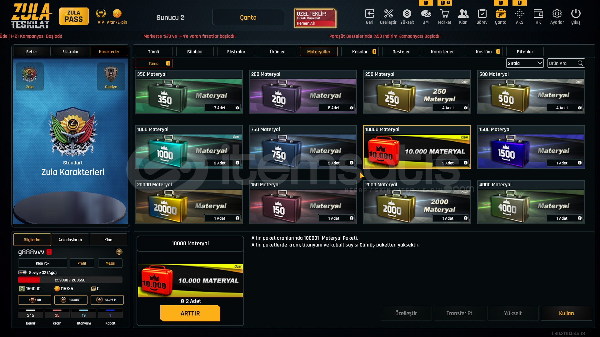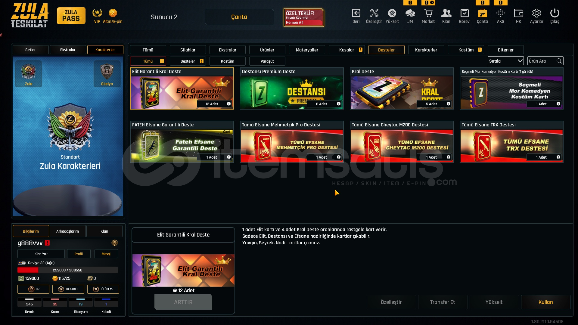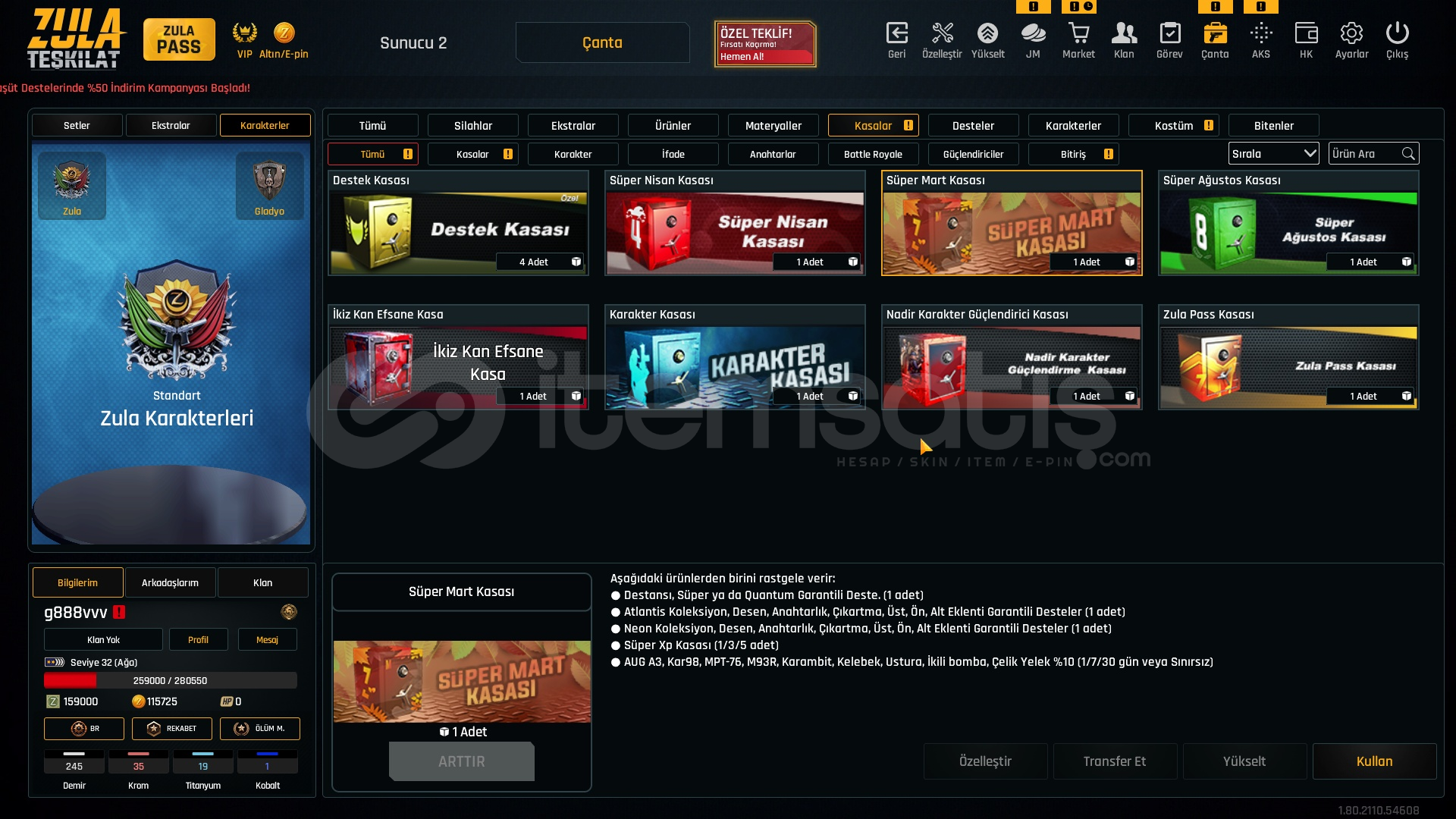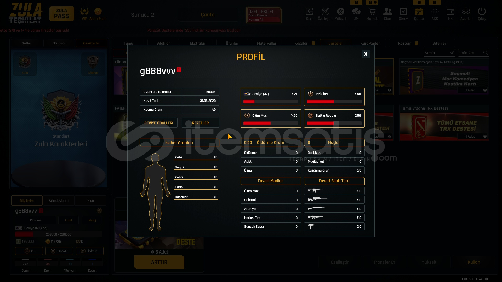 🍹 Bu ilanı görüyorsanız hesap henüz satılmamış demektir, satın alabilirsiniz.🥙 Silah yükseltmeleri size bırakıldı! Kullanmak istediğiniz ekipmanları bolca materyal ile yükseltin.🍊 Hesap 31.05.2020 tarihinde kuruldu ve hesap 5 yıllık rozete sahip.🍓 Hesap herhangi bir ceza almamış, hiç maça girilmemiş sadece kasa açılı...