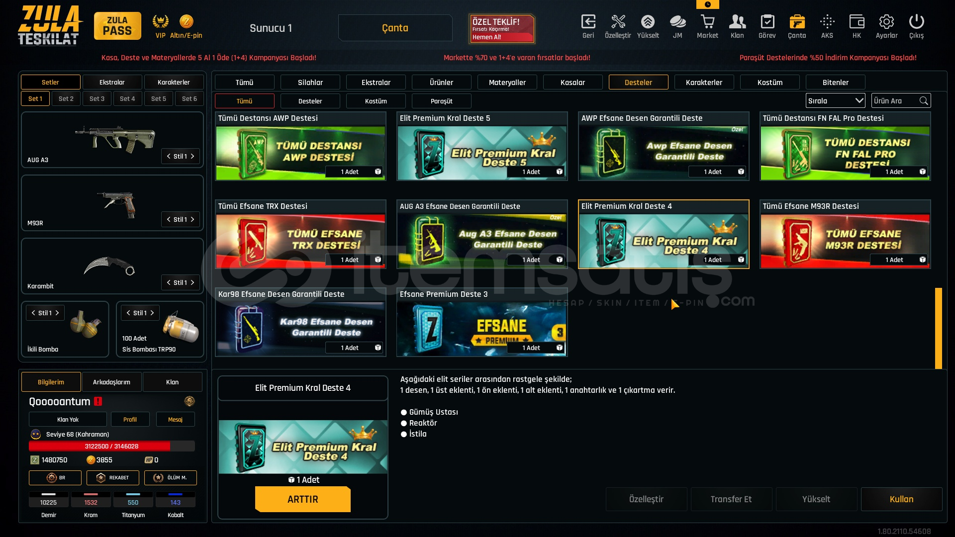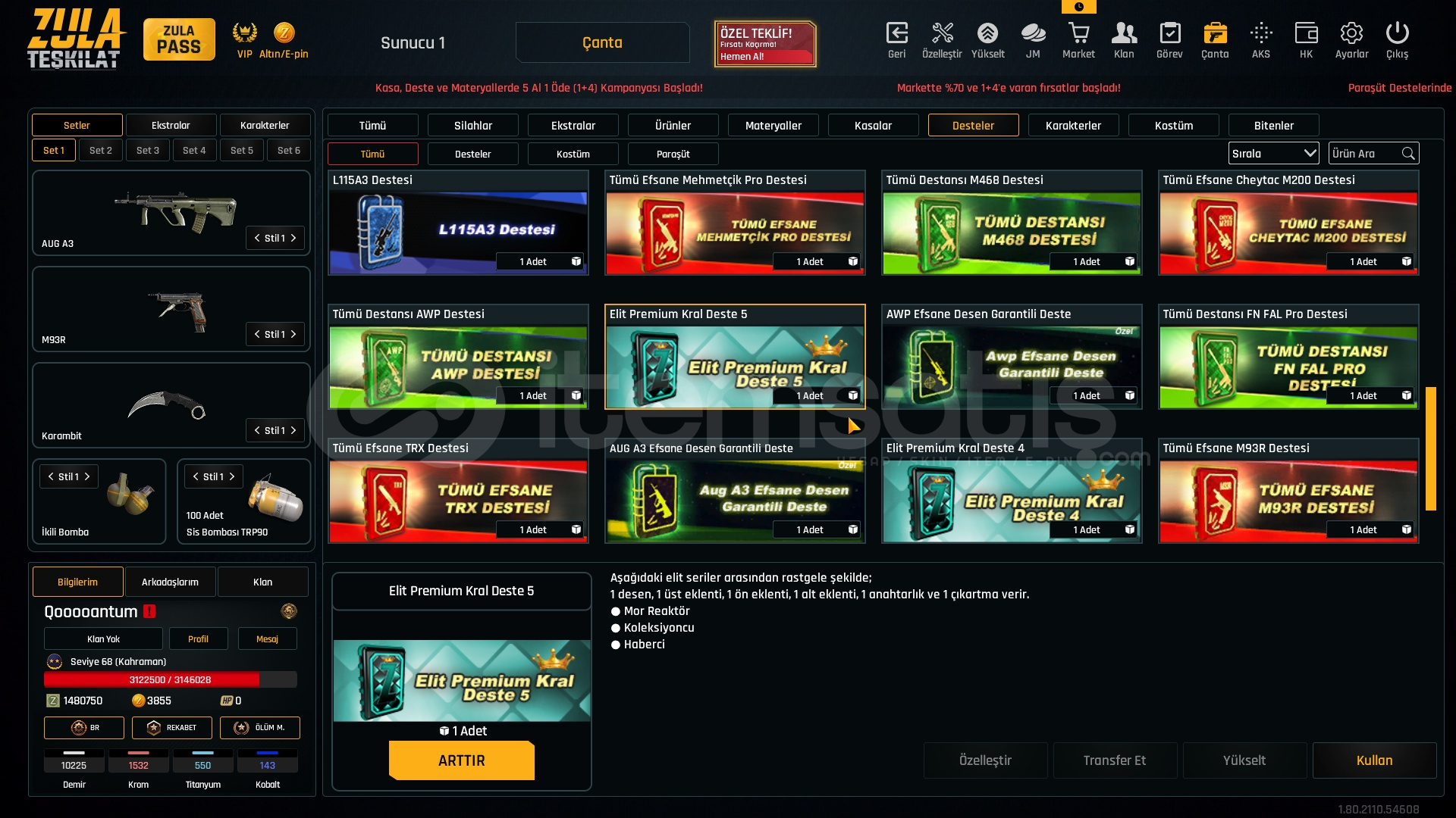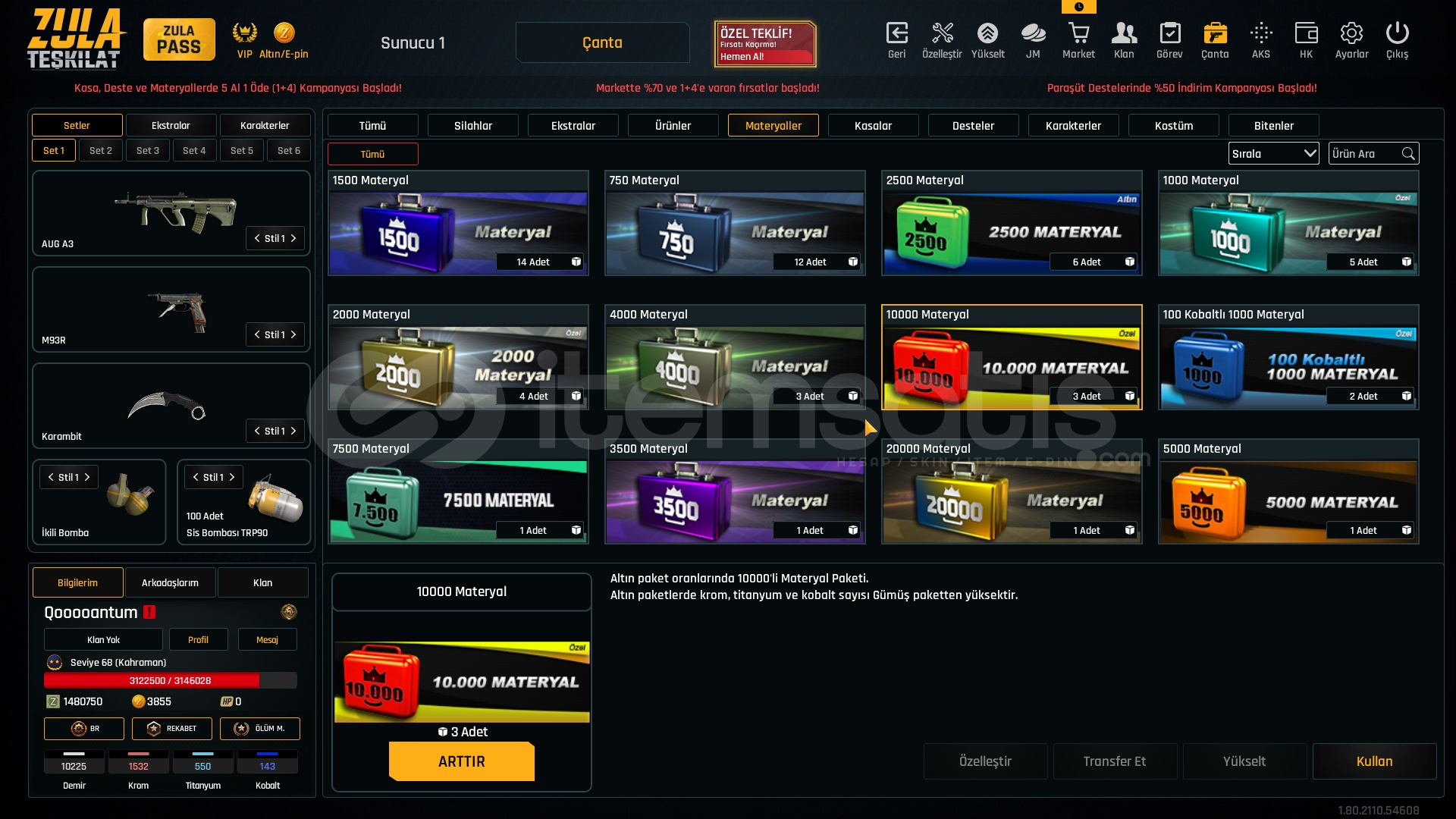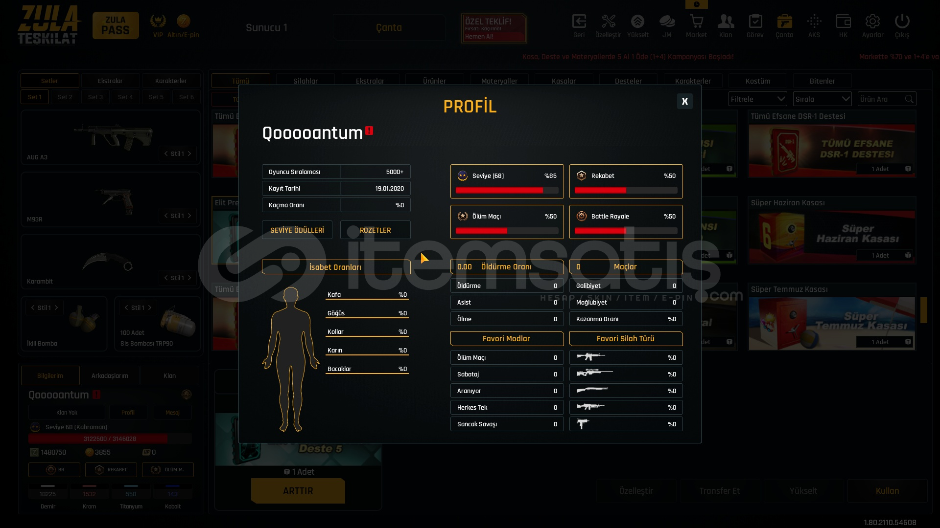 1.5M ZP + 150K Materyal + 68 Seviye Zula Hesabı