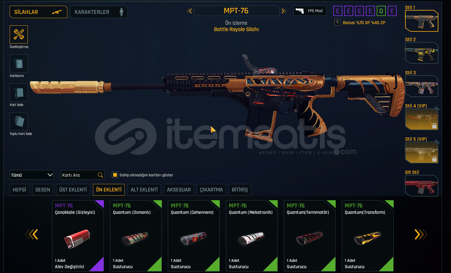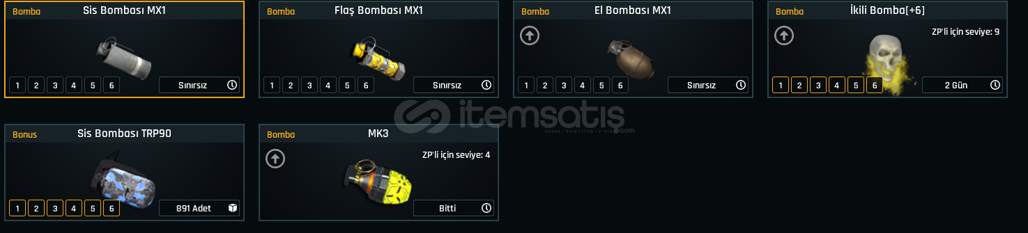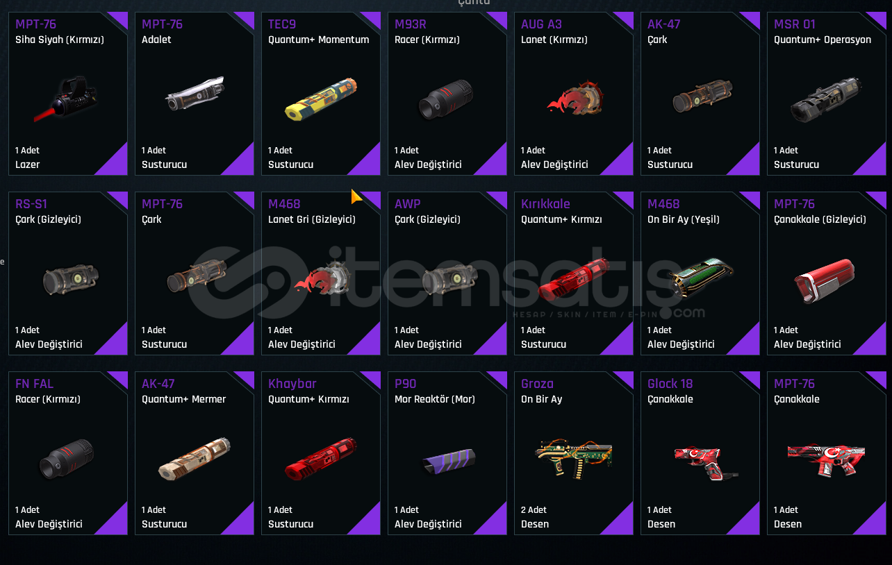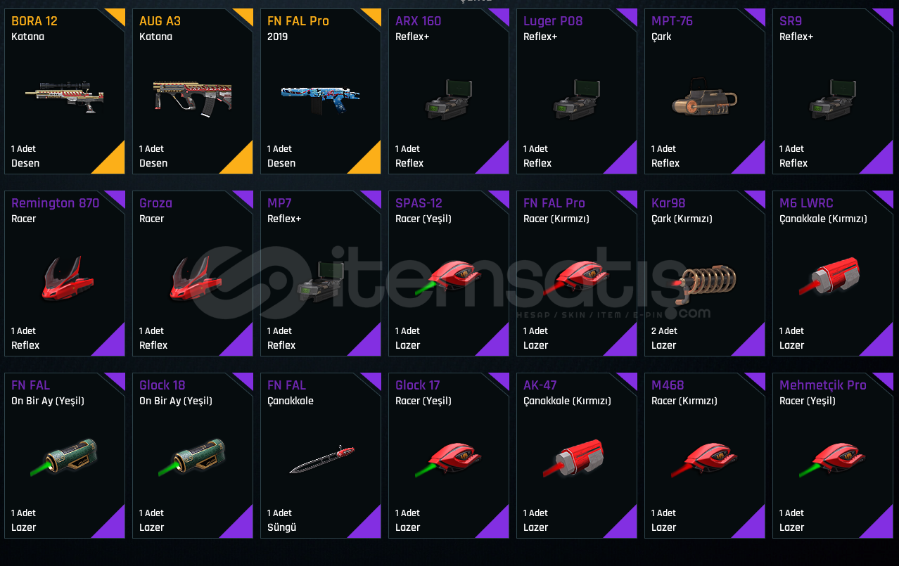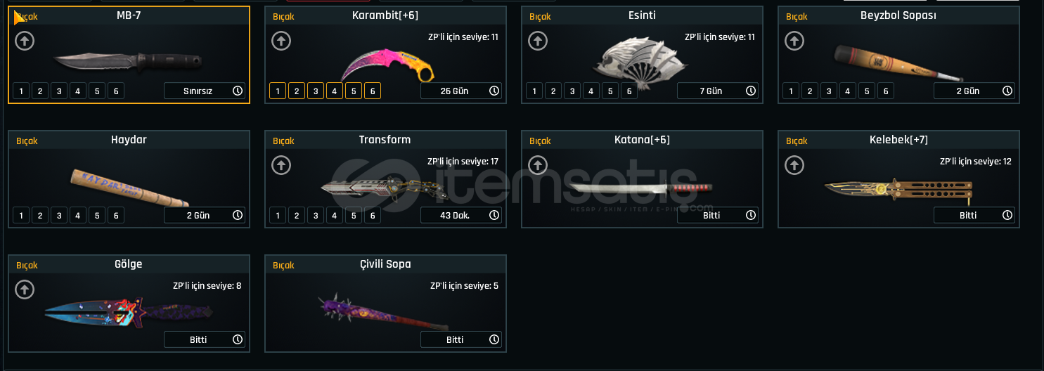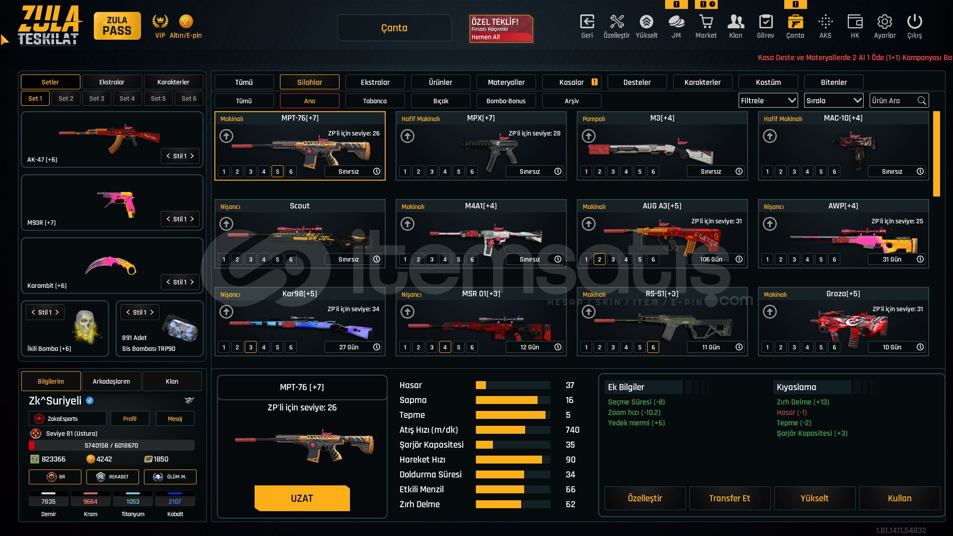 (SINIRSIZ)TEPME AZALTICI %5(SINIRSIZ) MPT-76 +7 (SINIRSIZ)MPX +7(SINIRSIZ)GLOCK 18 +6M93R +7 KELEBEK +7İKİLİ BOMBA +6KARAMBİT +6AK-47 +6KAR98 +5AUG A3 +5GROZA +5 AWP +4RS-S1 +3MSR-01 +3-Hesabın zula passı açıktır.-Hesapta 1 Adet isim değiştirme bulunmaktadır.-34 Adet Odadan Atma Oylaması bulunmaktadır.-Hesapta 840KZP 4350ZA 1850HP BULUNMAKTADIR.