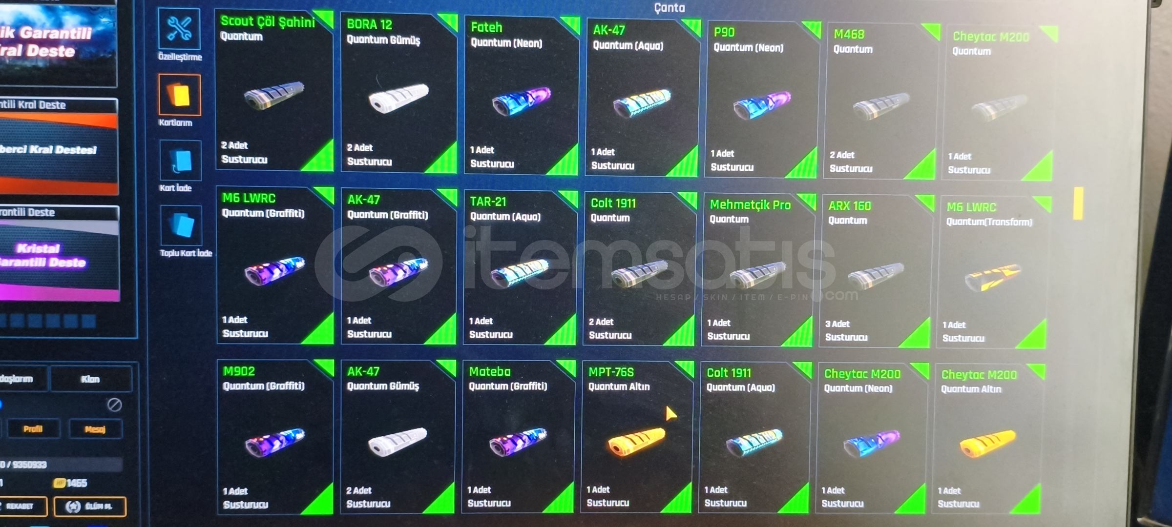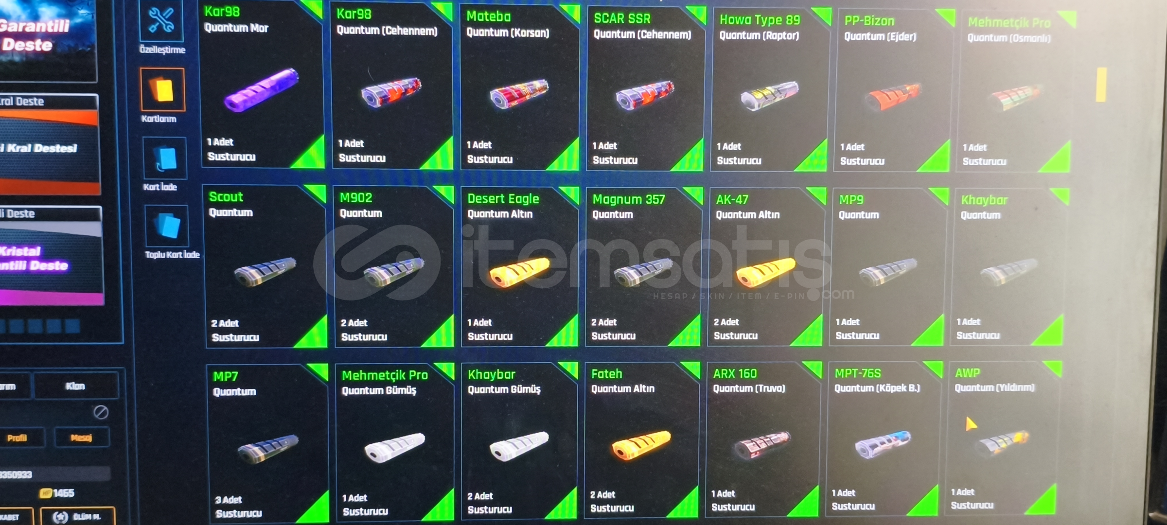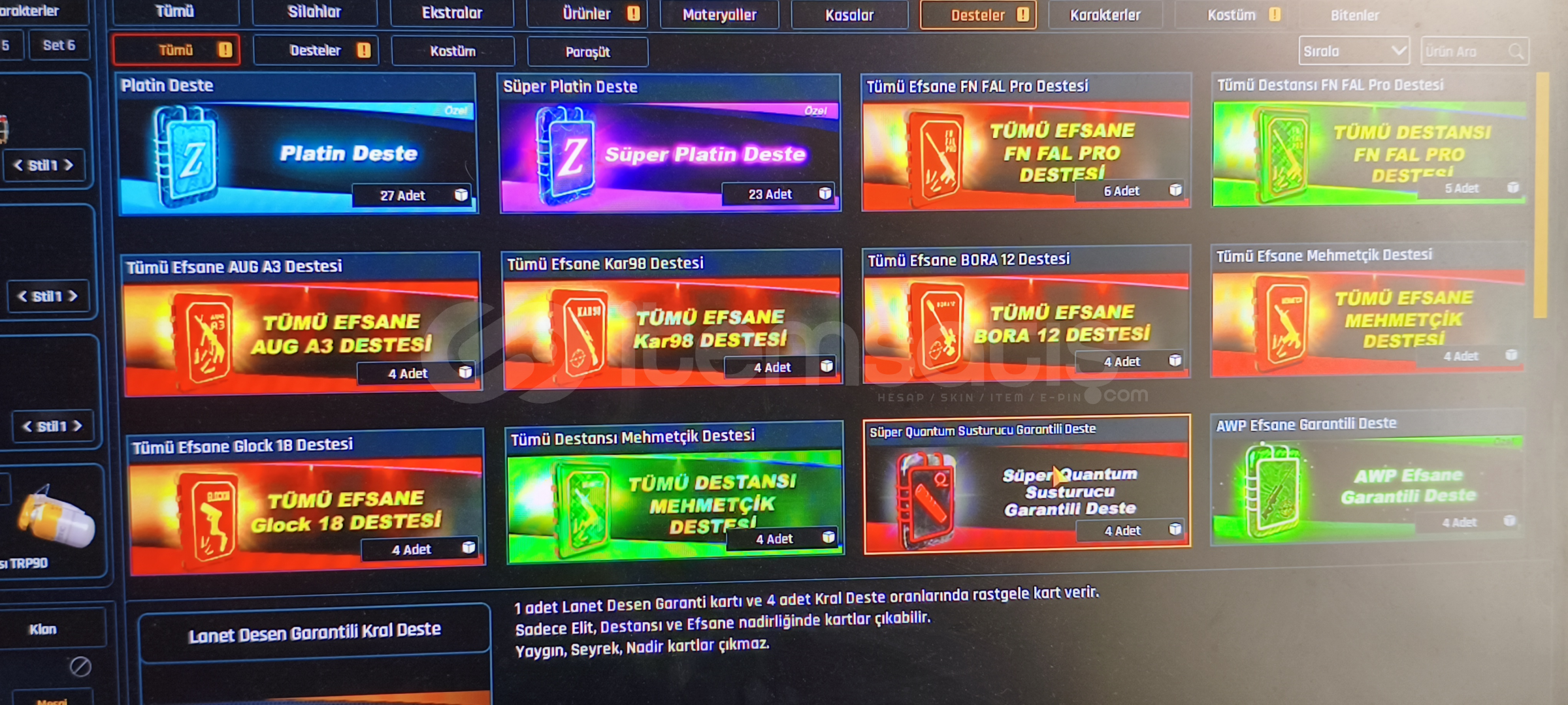 Tel değişir indirim sünnettir sorusu olan DM içindeki destekler kasalar bile hesaptan değerlidir öyle soyliyim mataryel dolu dolu var girdiğinizde 2 adet +6 yı 7 yapabilirsiniz çok değerli kasalar vardır açılmamış desteklerden 20 tanesi Quantum destesi dir alana hayırlı olsun200 + Quantum vardır 47 adet set görüntüleme kartı vardır isim değiştirme kartı var kaç tane olduğunu hatirlamiyom 1 den fazla her silahta 4 5 tane Quantum vardır