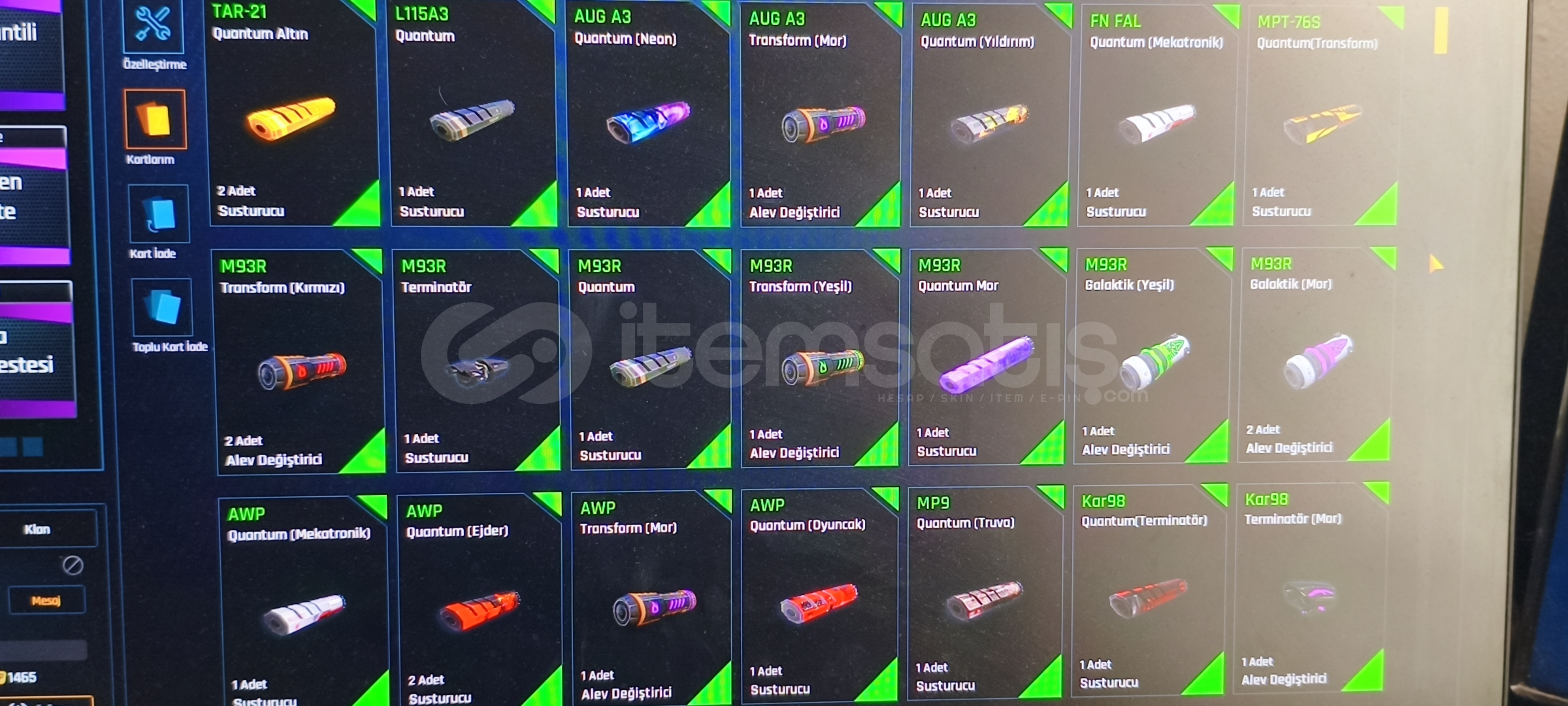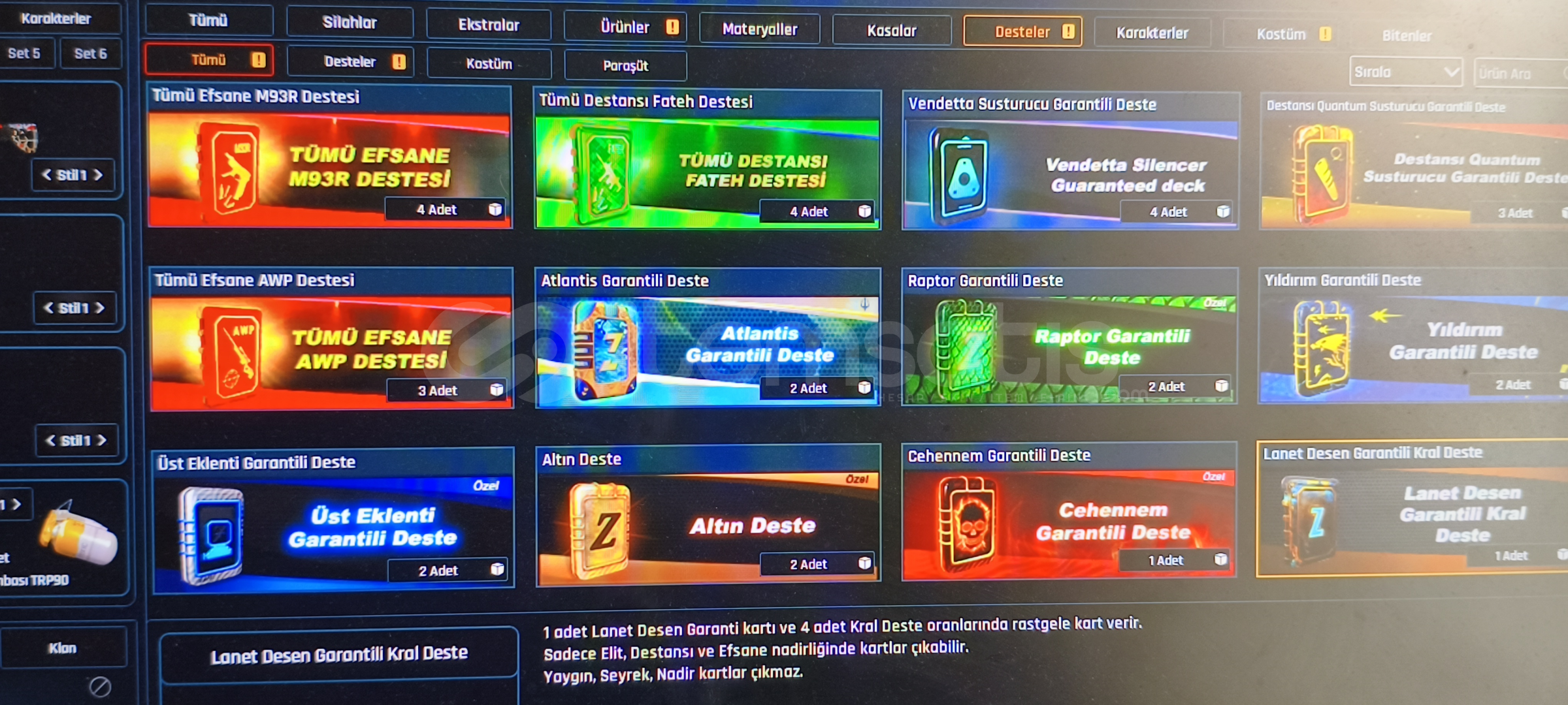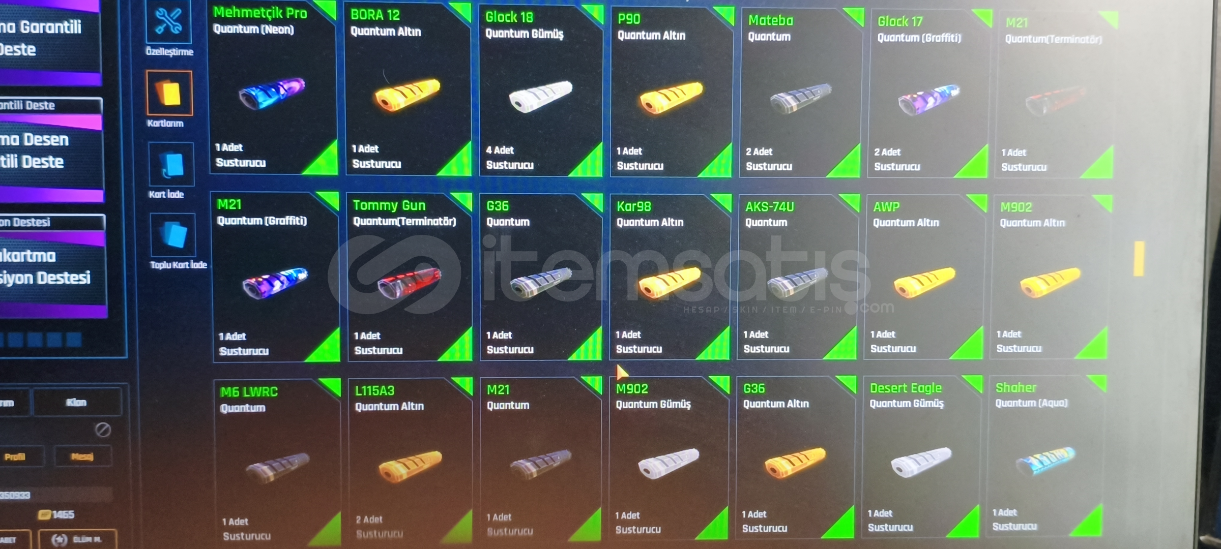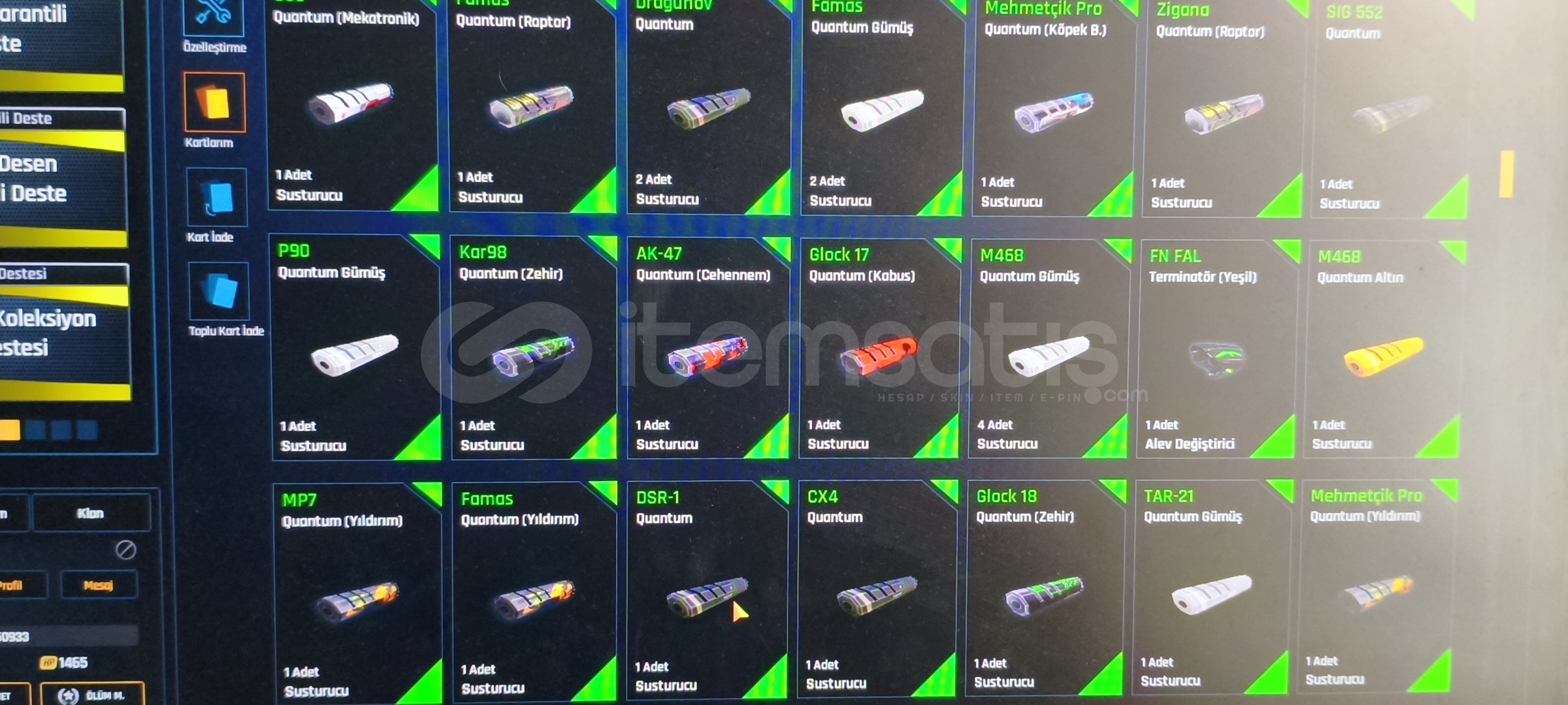 Tel değişir indirim sünnettir sorusu olan DM içindeki destekler kasalar bile hesaptan değerlidir öyle soyliyim mataryel dolu dolu var girdiğinizde 2 adet +6 yı 7 yapabilirsiniz çok değerli kasalar vardır açılmamış desteklerden 20 tanesi Quantum destesi dir alana hayırlı olsun200 + Quantum vardır 47 adet set görüntüleme kartı vardır isim değiştirme kartı var kaç tane olduğunu hatirlamiyom 1 den fazla her silahta 4 5 tane Quantum vardır