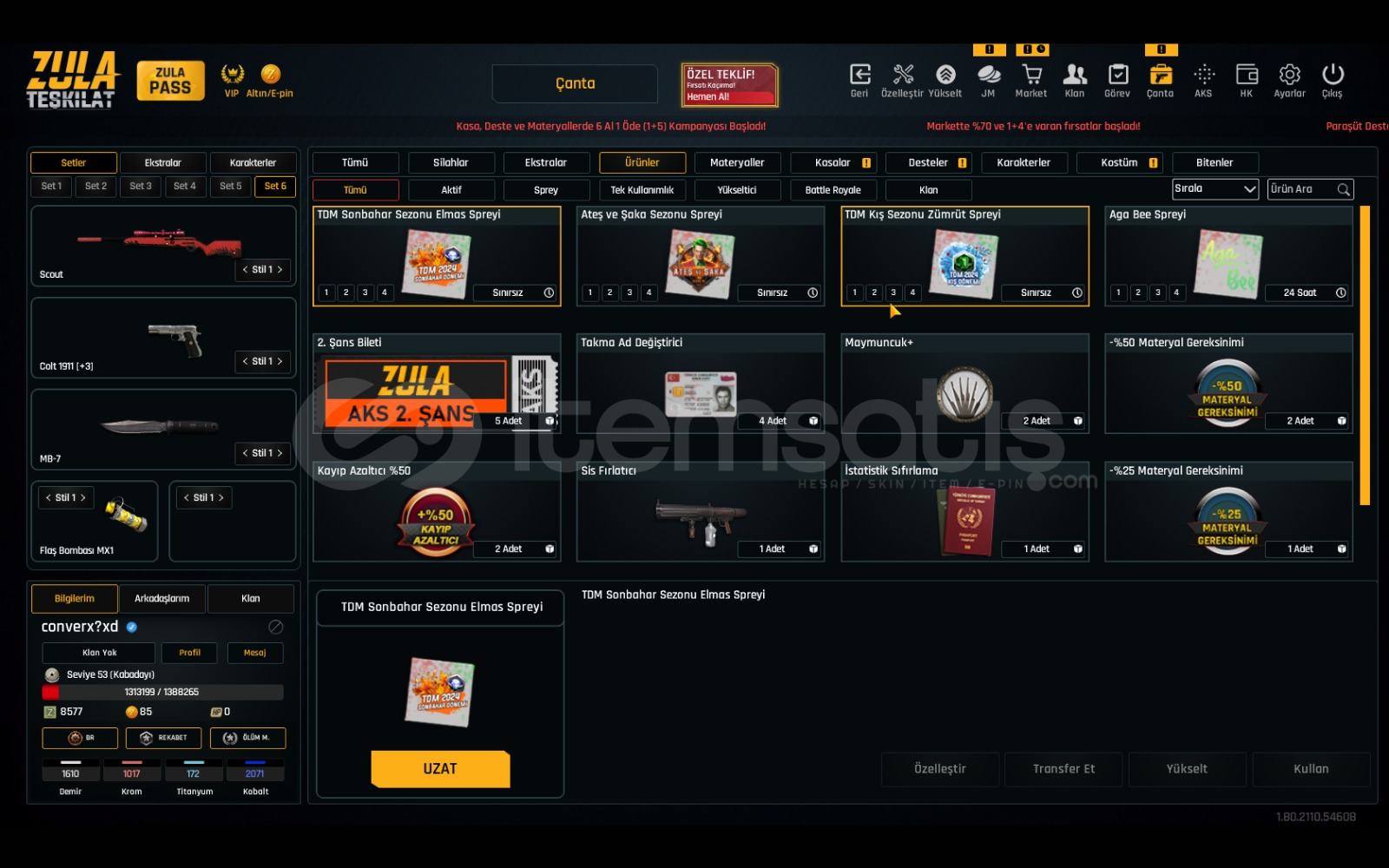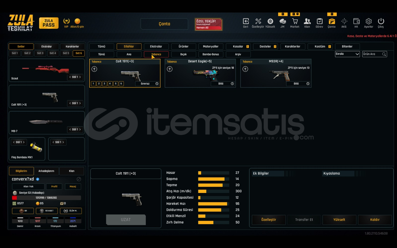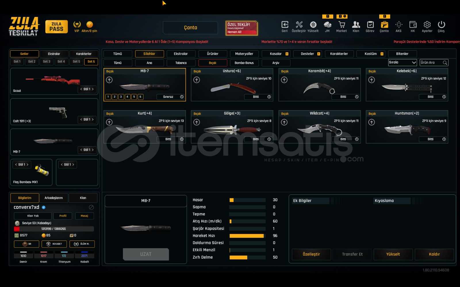 hesapta 4 adet isim değiştirme 1 adet istatik sıfırlama mevcuttur groza +5 m468+2 mpt76+4 mehmetçikpro+2 aug+1 /yeni yükseltildi kar98 +3 ll1a153+5 awp+2ustura+6 karambit+6 kelebek+6 kurt+4 gölge+3 wildcat+4 hunstman+2 m93r+4 deagle+5 silahlarda özelleştirmeler mevcuttur detaylı bilgi için dm üstünden mesaj atabilirsiniz