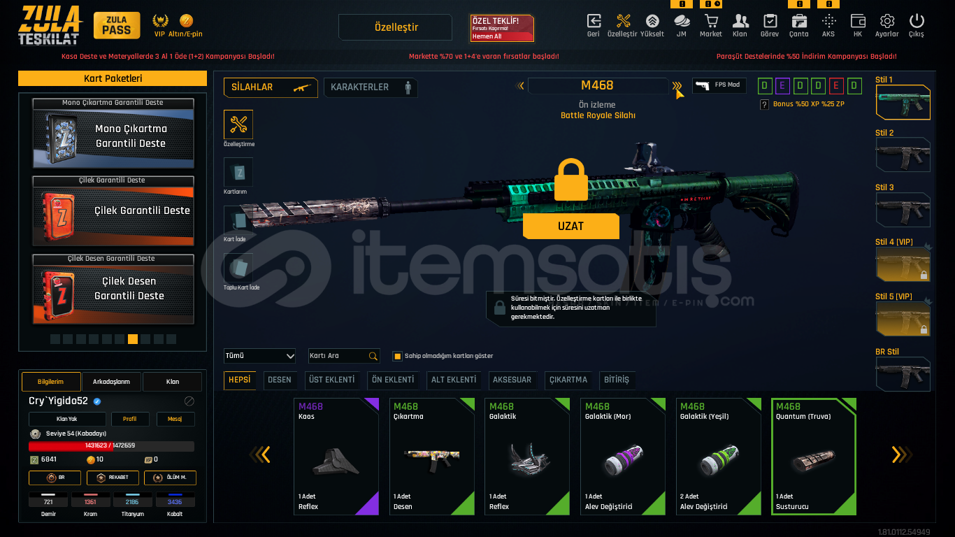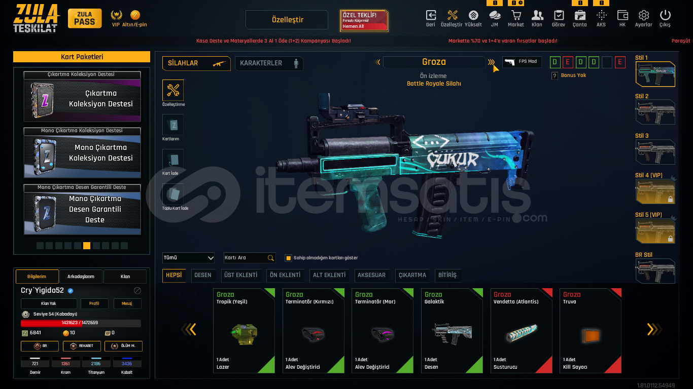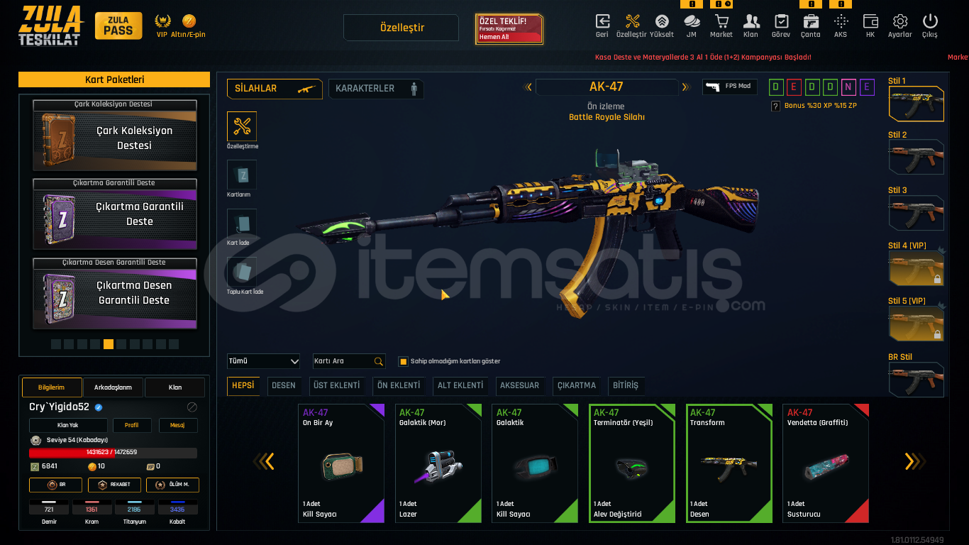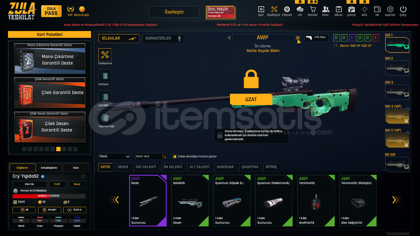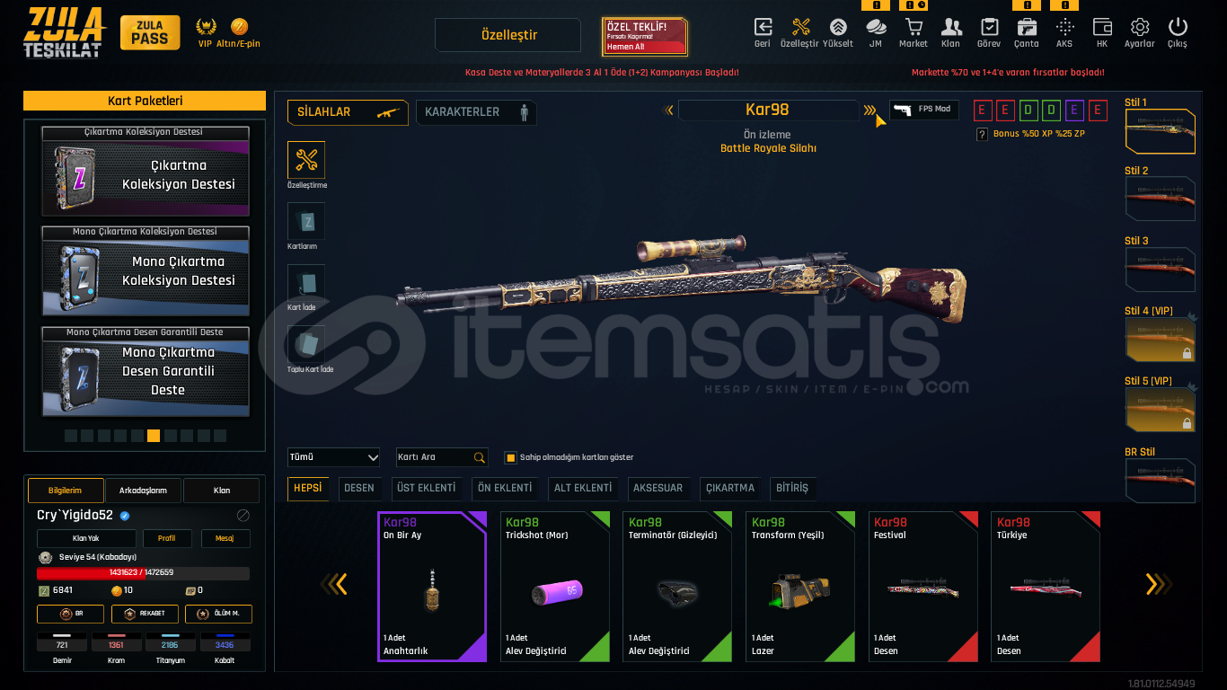 54 LEVELDİRTEL MAİL SAĞLAMDIR ALICI KİŞİYE DEVREDİLECEKTİREŞSİZ DESENLERDESTANSI KARTLAR EFSANEVİ KARTLAR BOLCA BULUNURGÜZEL ÖZELLEŞTİRMELİ HESAPTIR---SİLAH ARTILARI---MPT-76 +6AUG A3 +5L115A3 +6GROZA +6KAR98 +1BORA 12 +6AK47 +6MAC10 +5SCOUT +6M93R +6GLOCK 18 +3KARAMBİT +6USTURA +6İKİLİ BOMBA +5EL BOMBASI +5YAZILMAYANLAR VARDIR2 ADET İSİM DEĞİŞTİRME KARTISINIRSIZ...