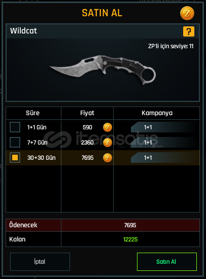 Oyun içinden arkadaş ekleyip Wildcat-Esinti-Kurt-Exo bıçaklarından istediğini toplamda 60(30+30) günlük göndereceğim.