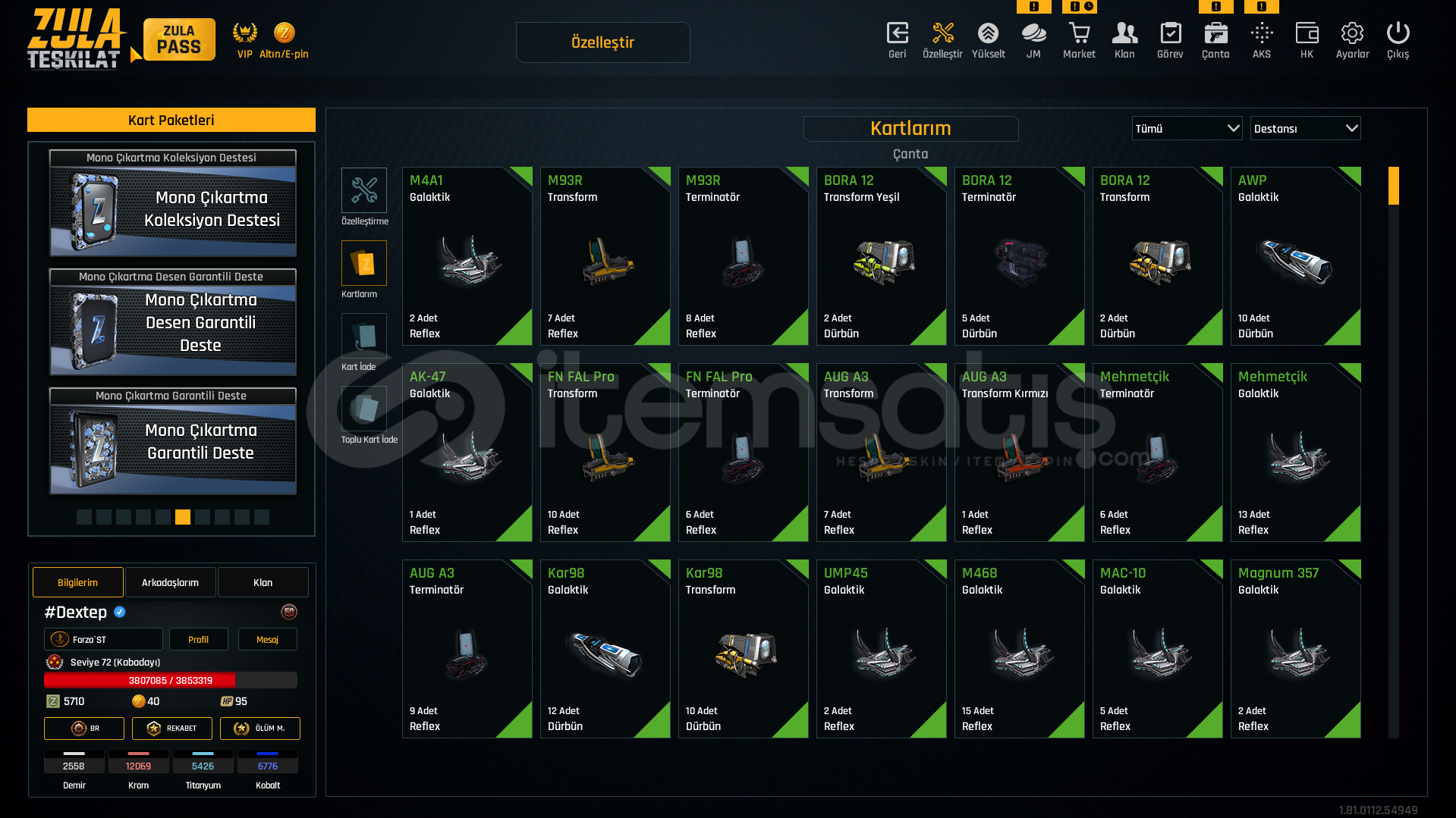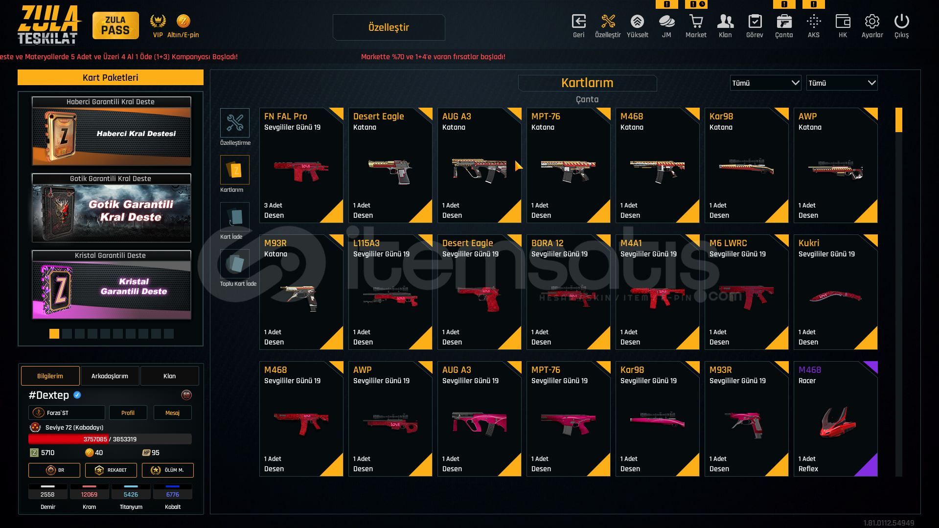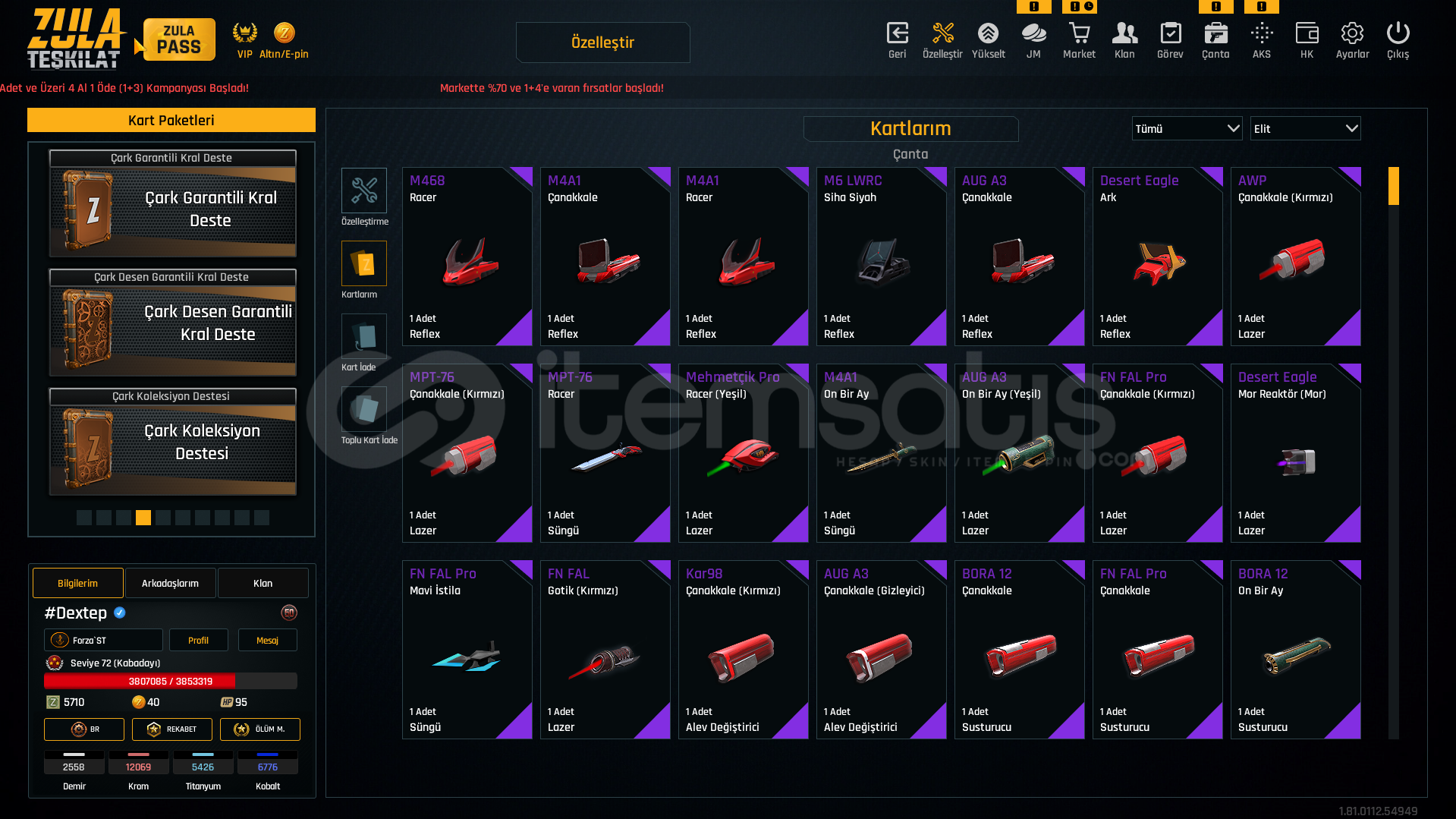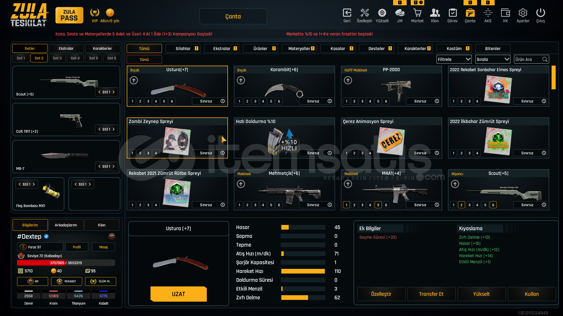 YÜKSELTİLMİŞLER :+6 M93r+6 AUG+6 İkili Bomba+6 L115a3+6 Deagle+3 M468+6 Glock-18+7 MPT-76+7 KELEBEK+6 GroZa+6 MPX+6 m6 LwrC+6 Tommy Gun+6 p90+7 kriss Wektor+7 USTURA+6 KARAMBİTSINIRSIZLAR :UsturaKarambitMehmetçikPP-2000