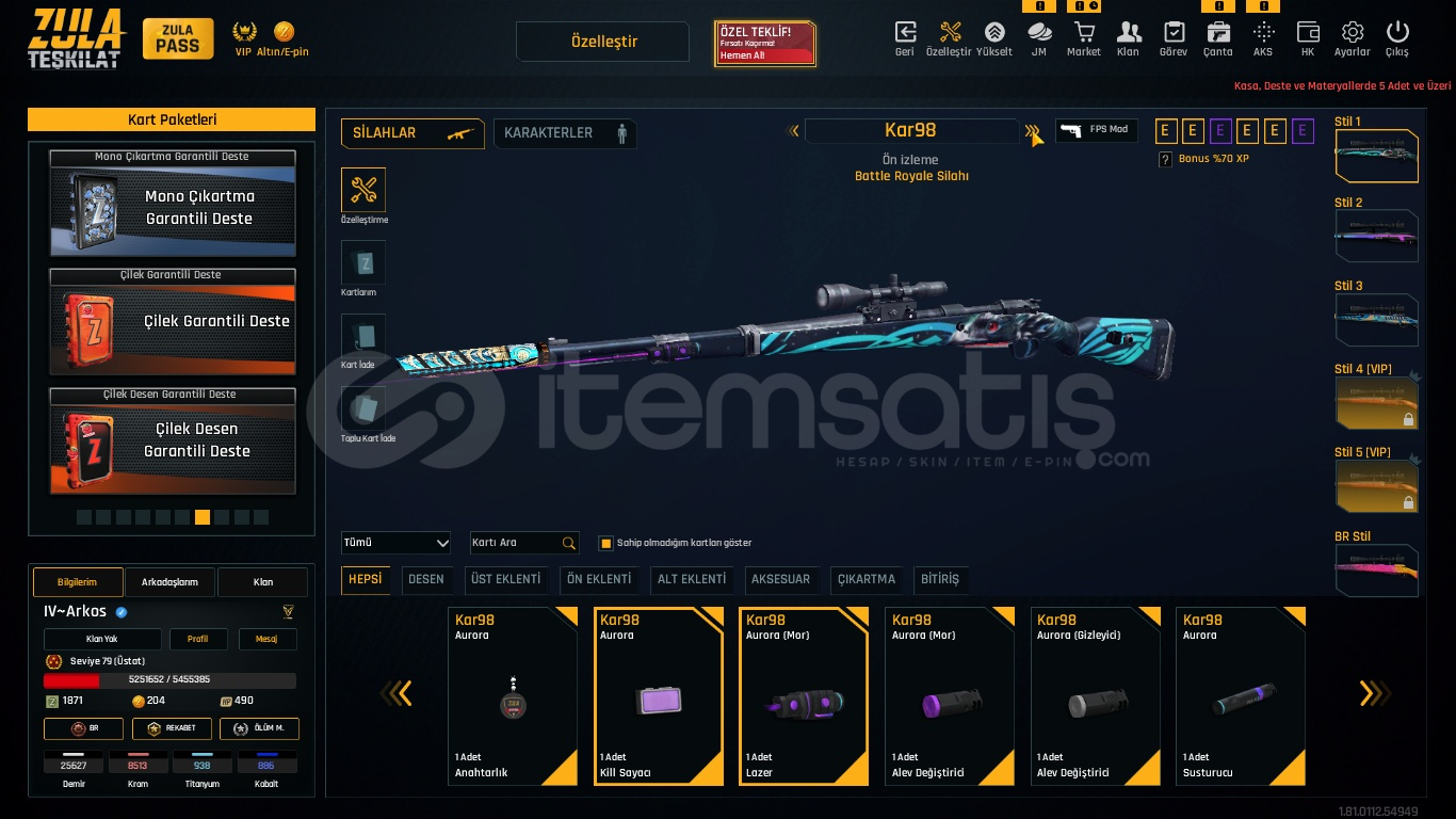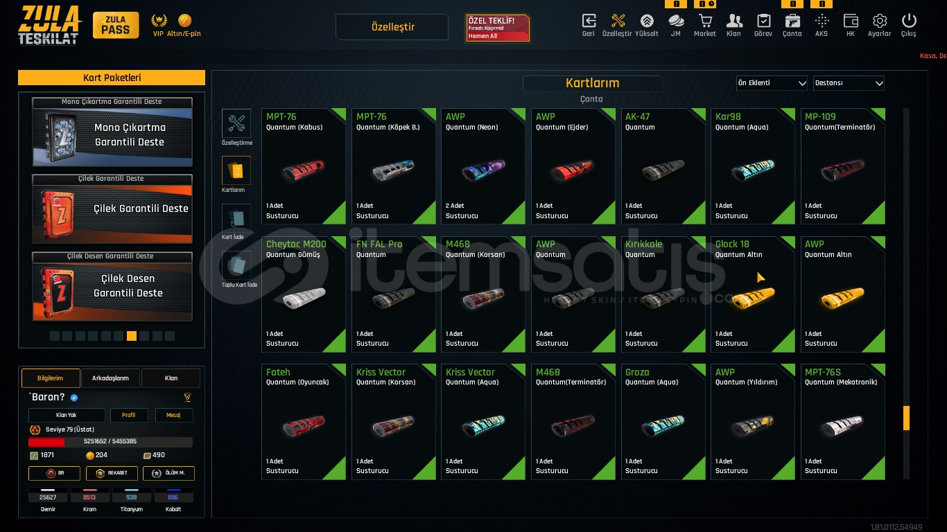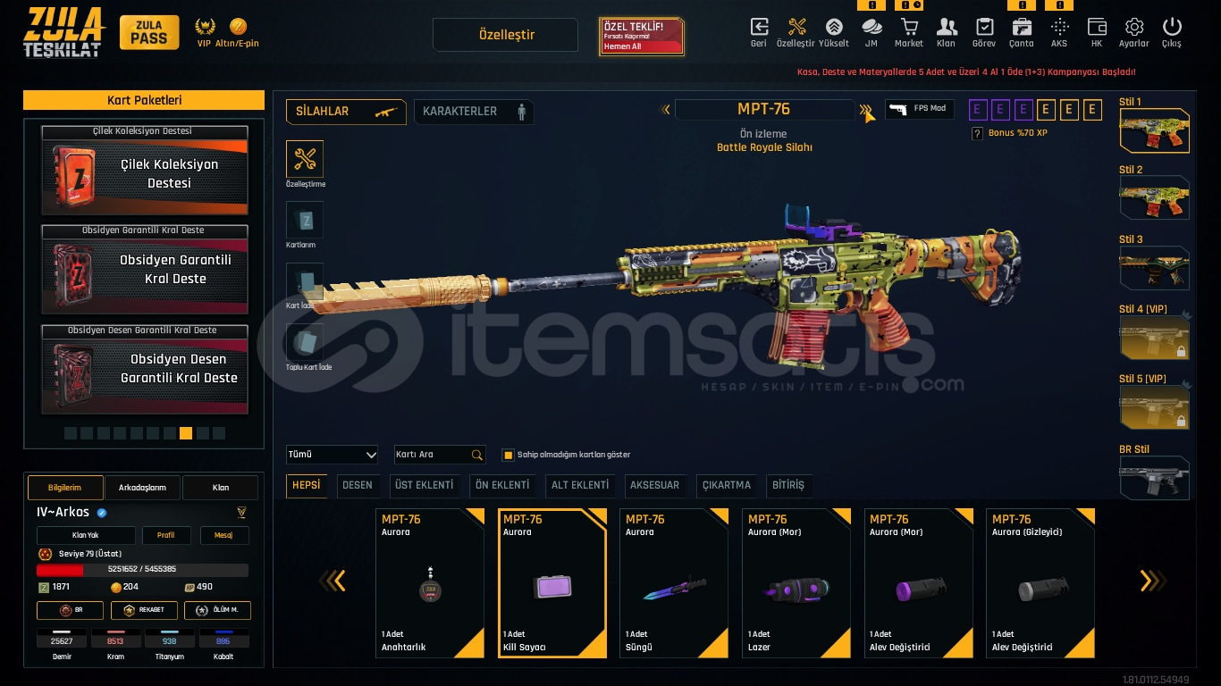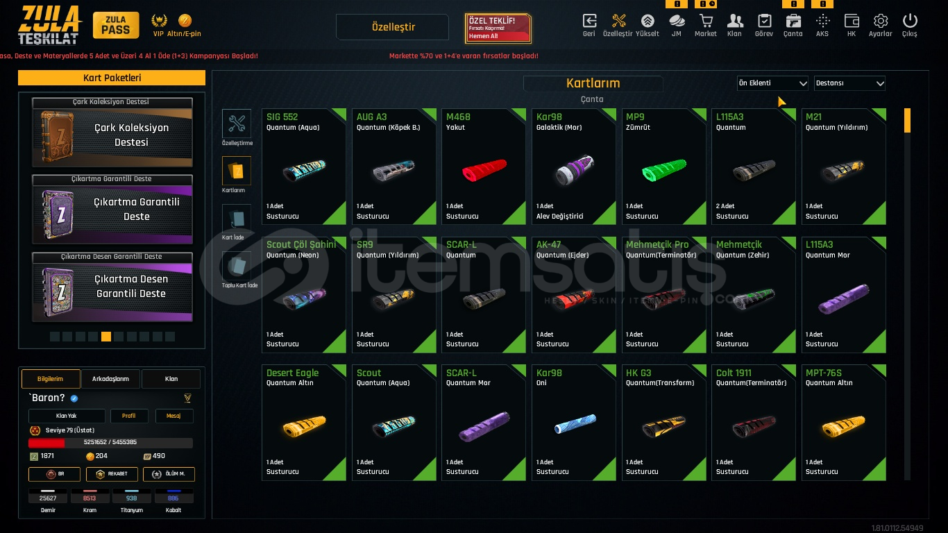 🔥 79 level, temiz, sorunsuz ve birçok yüksek seviye silaha sahip 🔥🔫 Deagle +6 (Sınırsız)💣 İkili Bomba +6 (Sınırsız)⚡ MPT-76 +7⚡ MK-3 +7🔪 Karambit +7💥 İkili C5 +7🗡️ Kelebek +7🔫 GROZA +6🔫 M93R +6🎯 L115A3 +6🎯 AWP +6🔫 Glock 18 +6🔪 Ustura +6🎯 BORA 12 +6🎯 KAR98 +5🔫 AUG A3 +4🎯 RS-S1 +4🎯 MSR-...