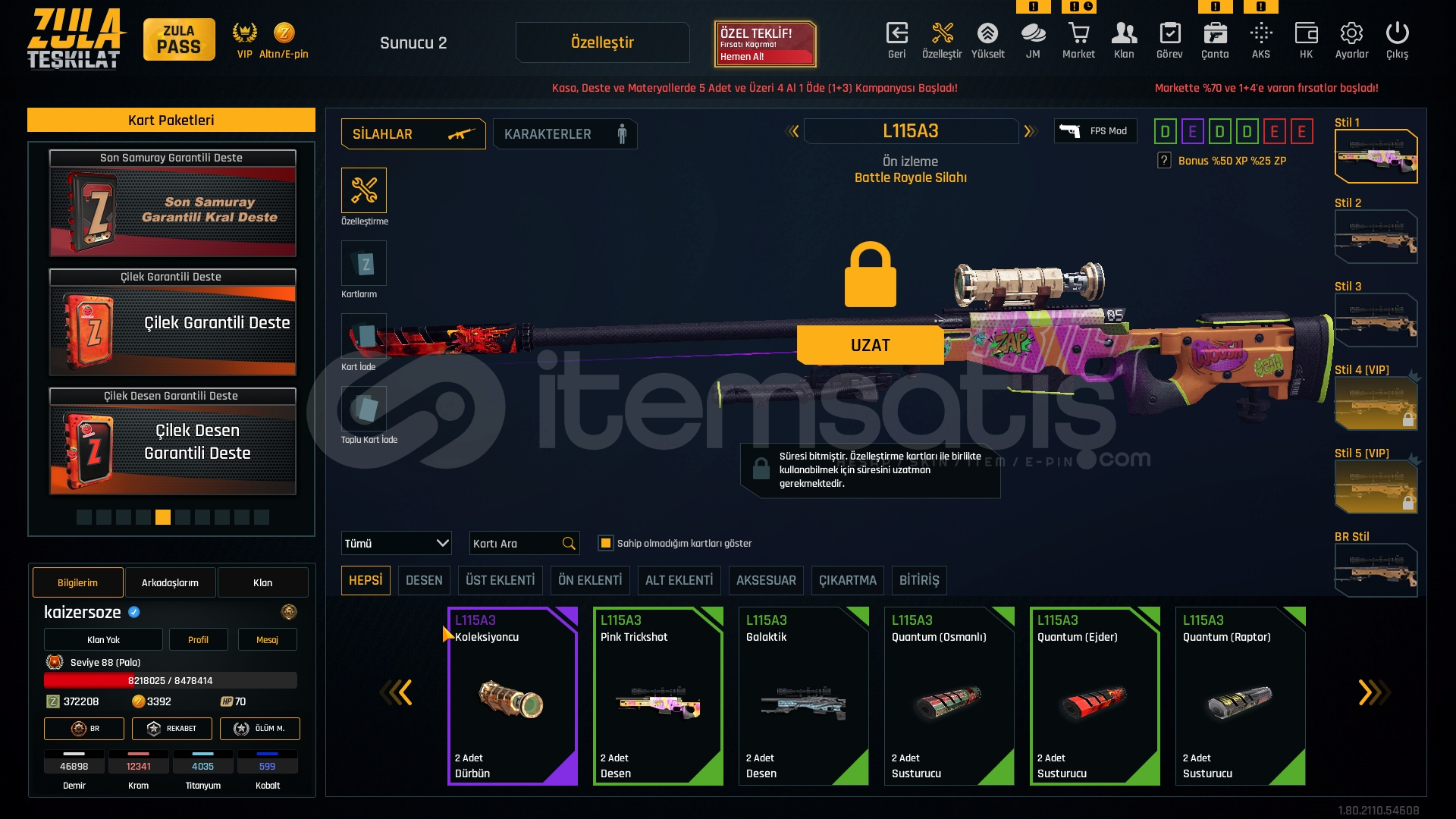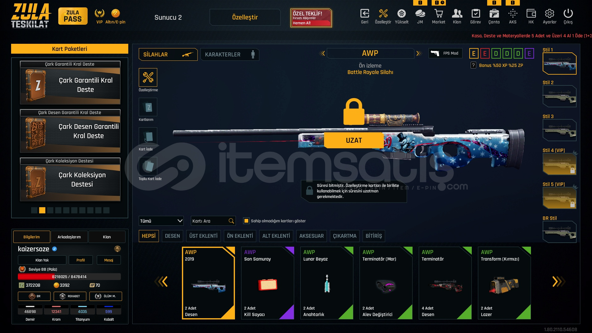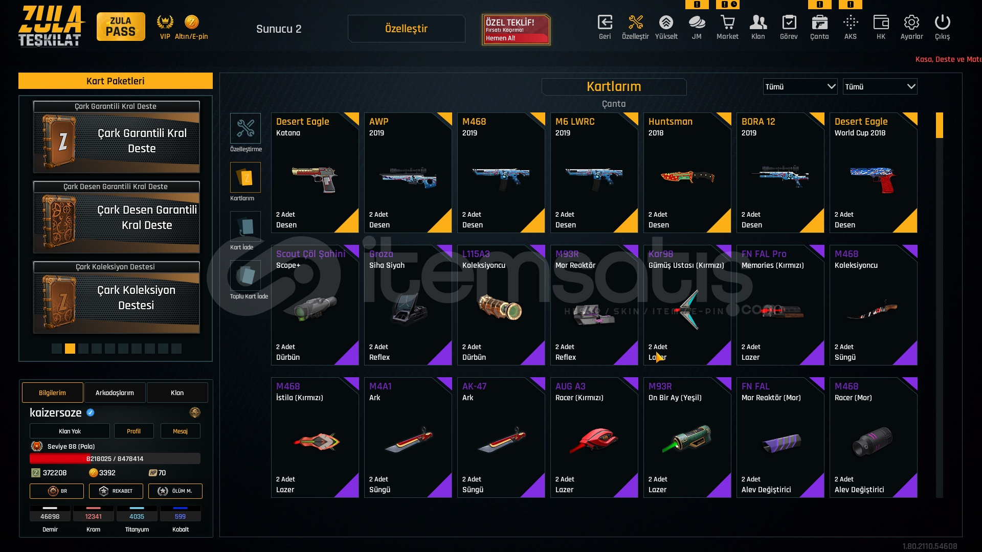 88 LEVEL 370K ZP 3.400 ZA MEVCUTTUR 50 K ZA HARCANMIŞTIR SINIRSIZ TRANSFER EDİLEBİLİR.!SINIRSIZ HANÇER +1SINIRSIZ KARAMBİT +1SINIRSIZ BORA 12 +6SINIRSIZ GLOCK 18 +7SINIRSIZ MEHMETÇİK +6SINIRSIZ HIZLI CANLANMA %25SINIRSIZ 2 KARMA SPREYM468 +7AUG +6MPT +6KAR98 +6L115A3 +6AWP +6M93R +6İKİLİ BOMBA +6