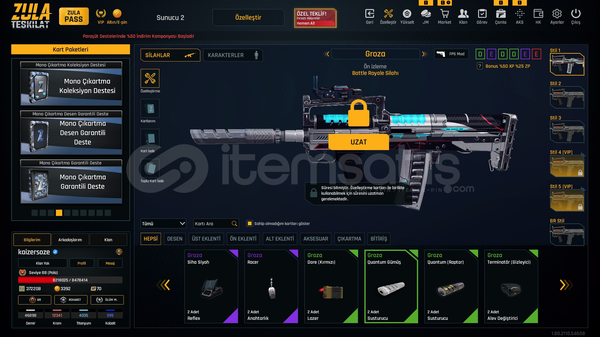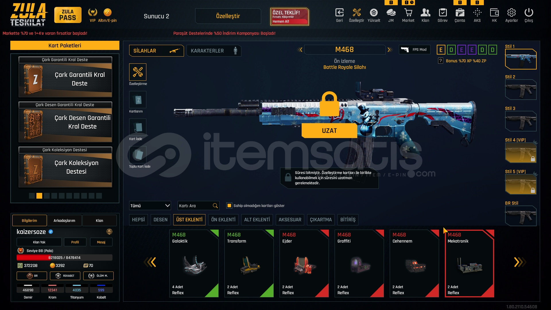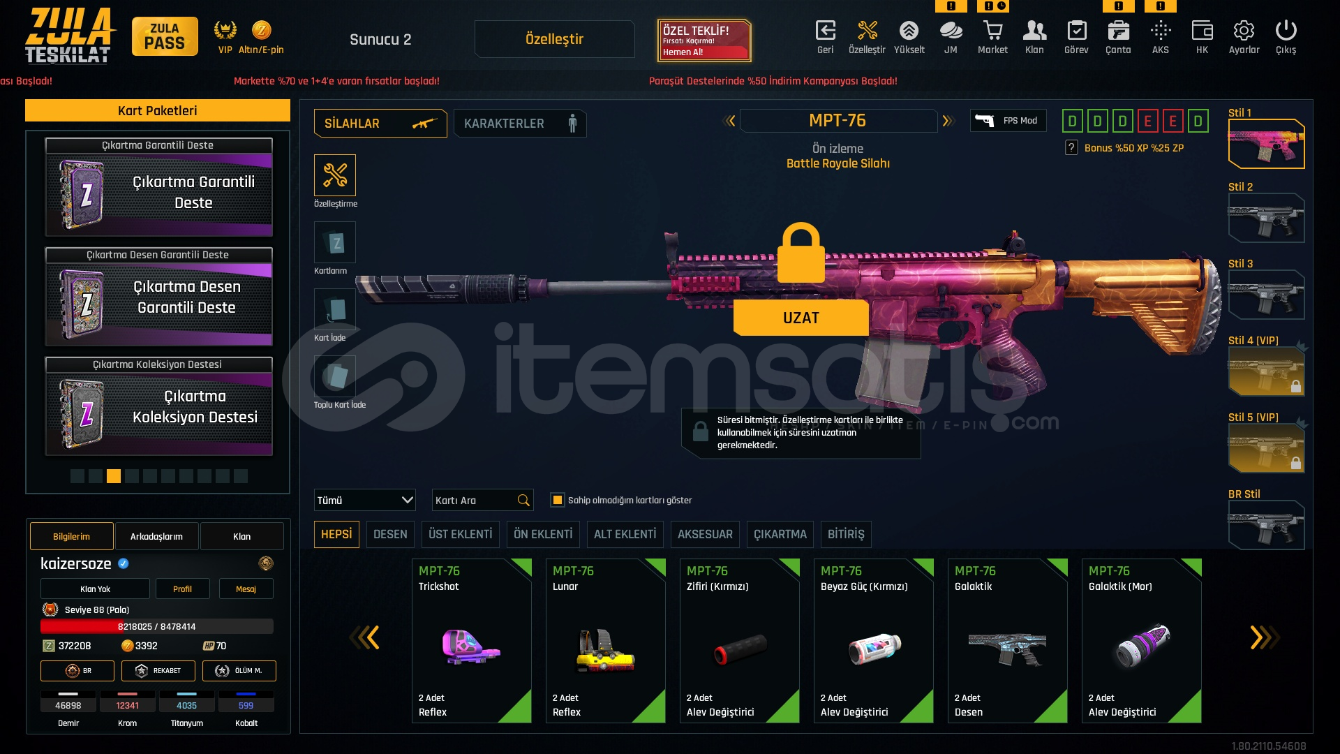 88 LEVEL 370K ZP 3.400 ZA MEVCUTTUR 50 K ZA HARCANMIŞTIR SINIRSIZ TRANSFER EDİLEBİLİR.!SINIRSIZ HANÇER +1SINIRSIZ KARAMBİT +1SINIRSIZ BORA 12 +6SINIRSIZ GLOCK 18 +7SINIRSIZ MEHMETÇİK +6SINIRSIZ HIZLI CANLANMA %25SINIRSIZ 2 KARMA SPREYM468 +7AUG +6MPT +6KAR98 +6L115A3 +6AWP +6M93R +6İKİLİ BOMBA +6
