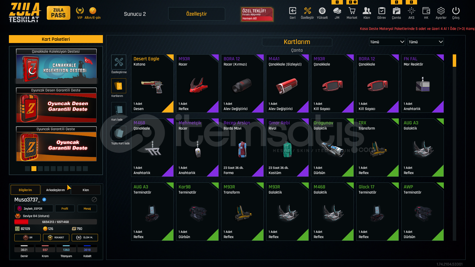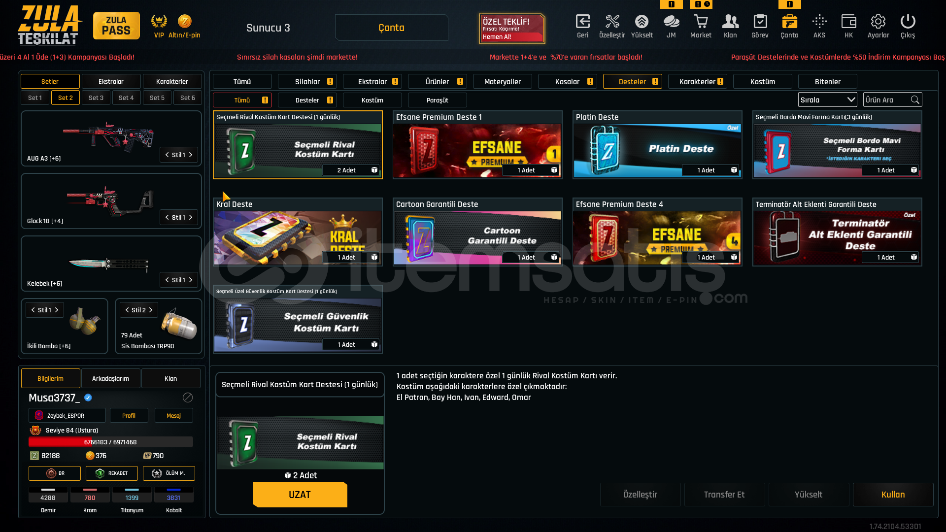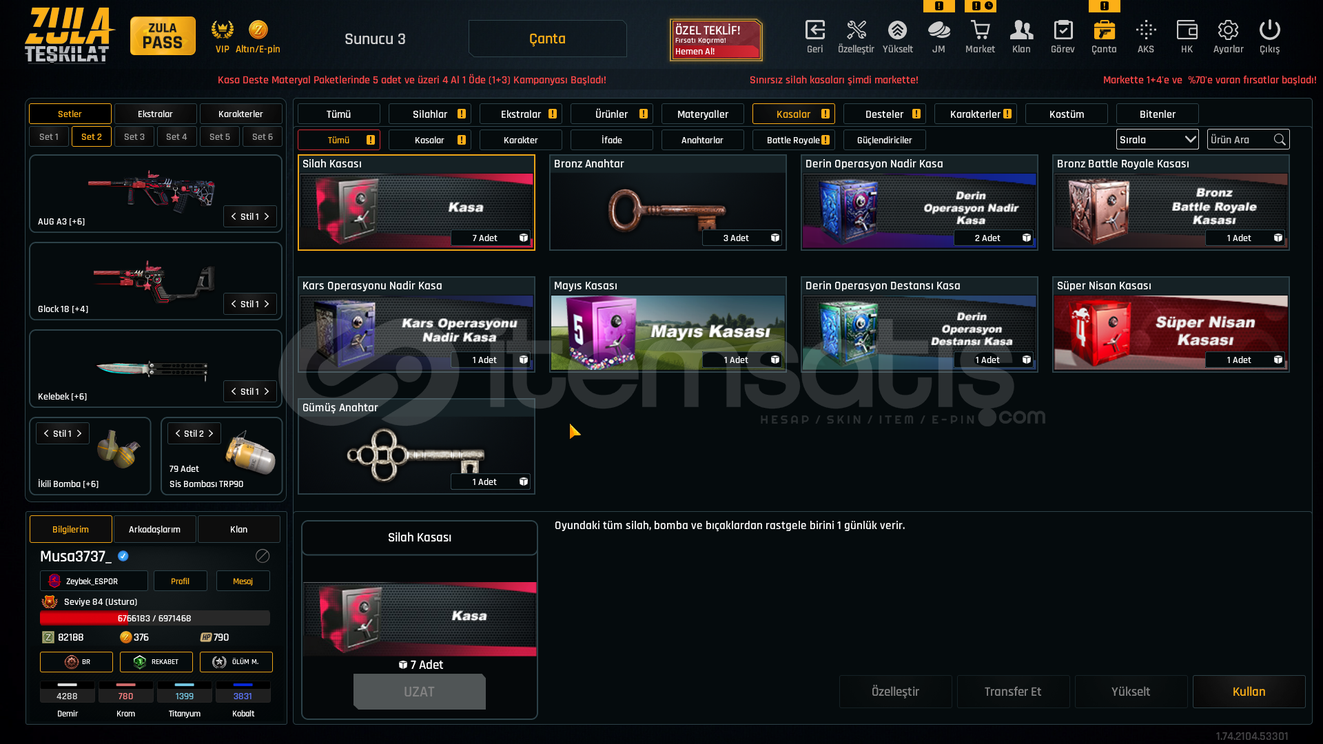 +6 Aug A3 SINIRSIZ +4 Glock 18 SINIRSIZ +6 AK-47 +5 Kar98 +6 ikili bomba +6 Karambit +6 M93R +5 Desert Deagle +6 Khaybar +5 M4A1 +6 Colt 1911 +6 Kelebek1 Adet Eşsiz desen10 Adet Elit desen430 Adet Destansı desenFULL Hesap