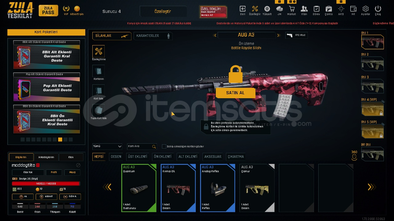 ⭐️AUGA3 SİYAH QUANTUMLU TEL MAİL DEĞİŞEN HESAP⭐️LVL- 26⭐️AUGA3 - SİYAH QUANTUM⭐️+3 M4A1⭐️+2 USTURA⭐️1 ADET İSTATİSLİK SIFIRLAMA⭐️TELEFON NUMARASI DEĞİŞİYOR⭐️MAİLİ DEĞİŞİYOR