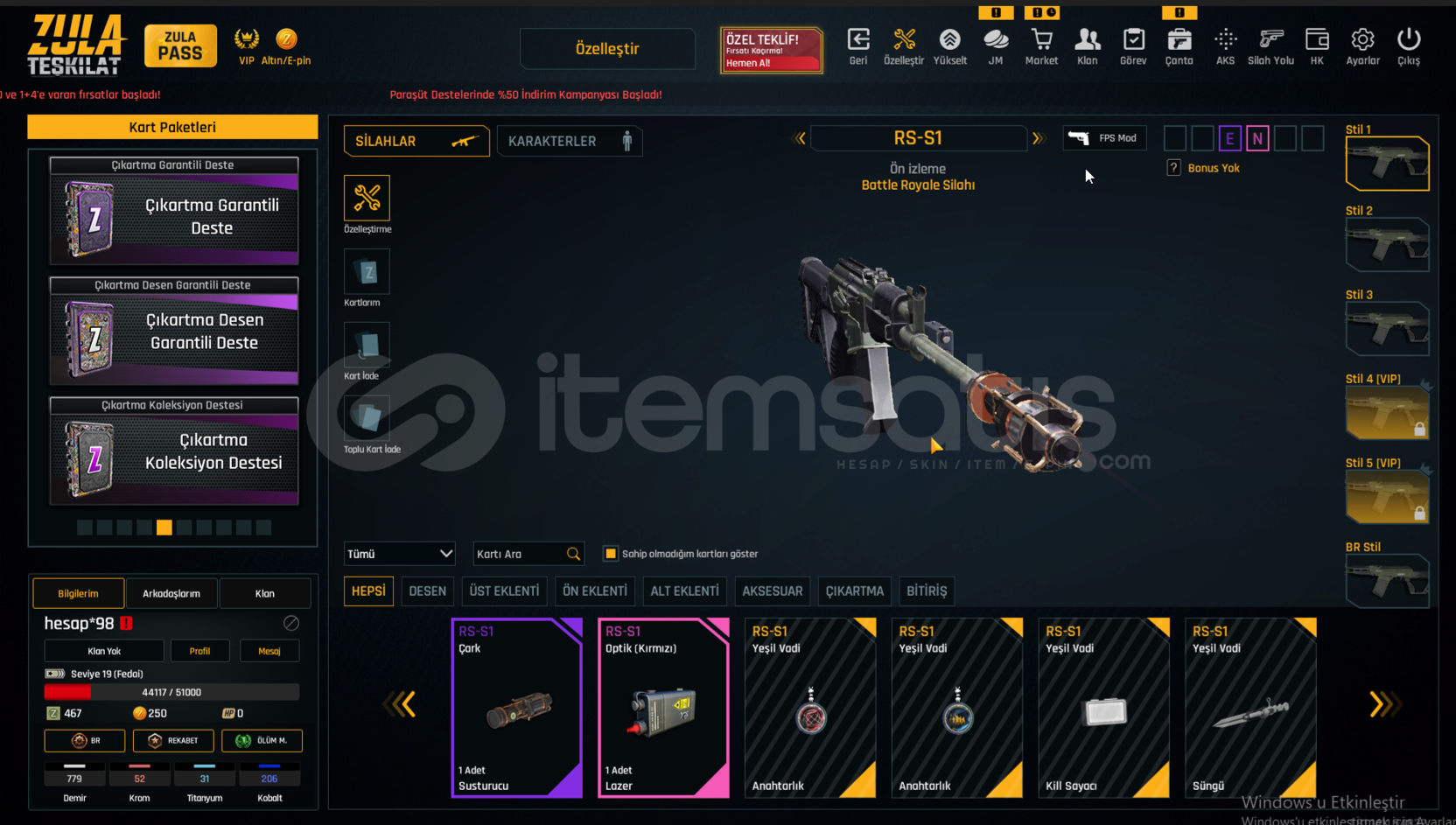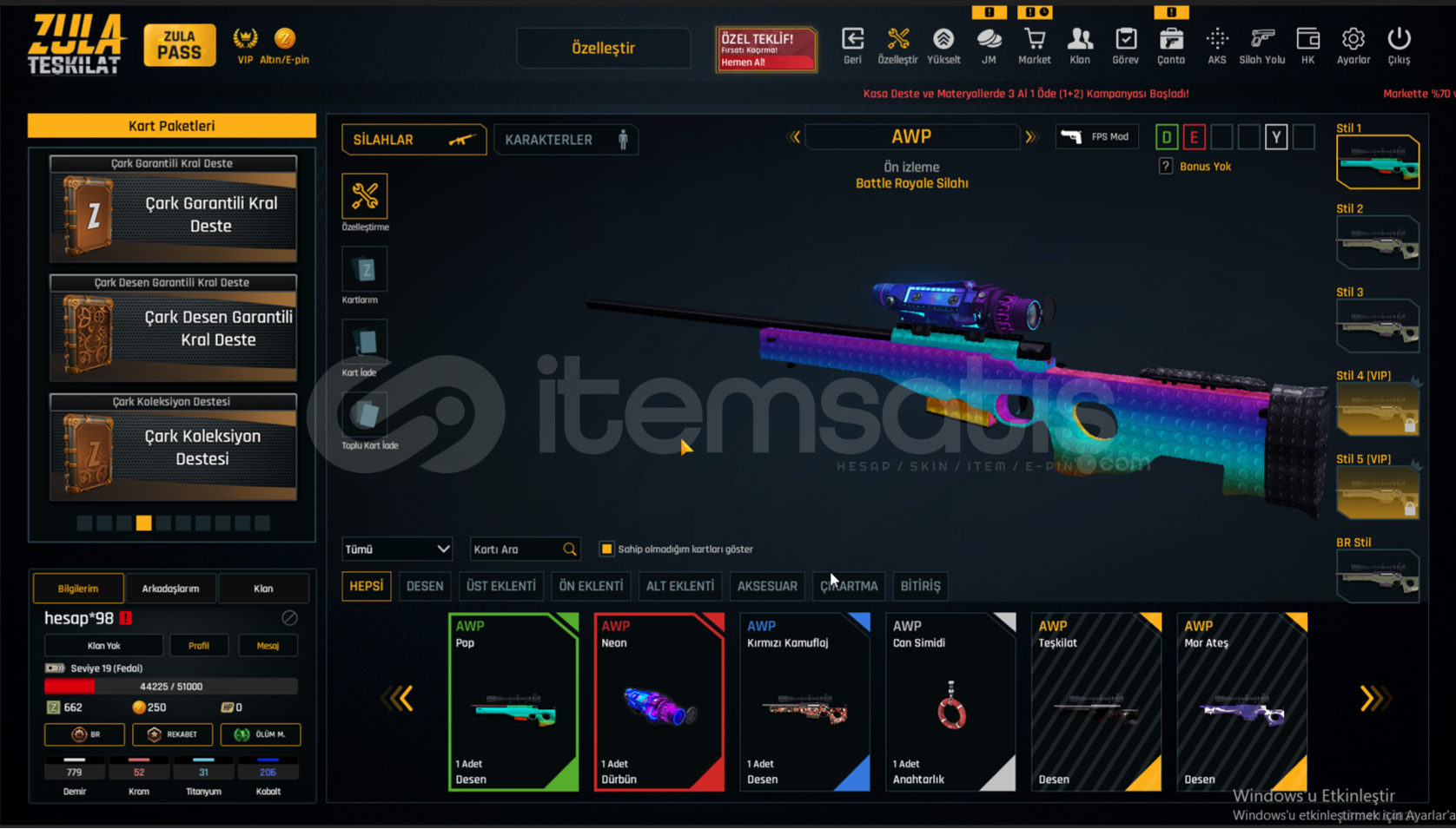 AWP +4 30+ GÜN +5 GROZA +5 KELEBEK +3 İKİLİ BOMBA+3 MPT 76RS -S1DE QUANTUM SESLİ SUSTURUCU VAR19 LEVEL OLUP KİLİT ALINMIŞTIR YANİ HER SİLAHI ZPLE ALINABİLİYORTEL VE MAİL BAGLI DEĞİLDİR YANİ ÜSTÜNÜZE ALABİLİRSİNİZ OTOMATİK TESLİMAT