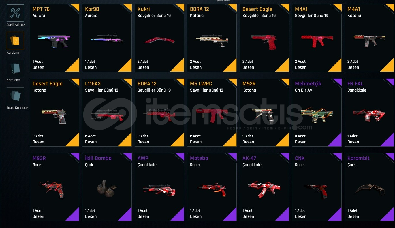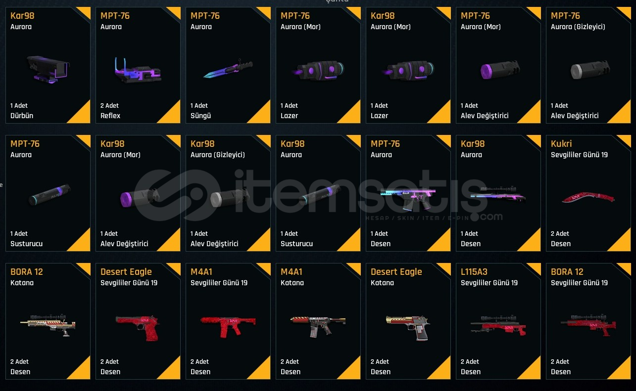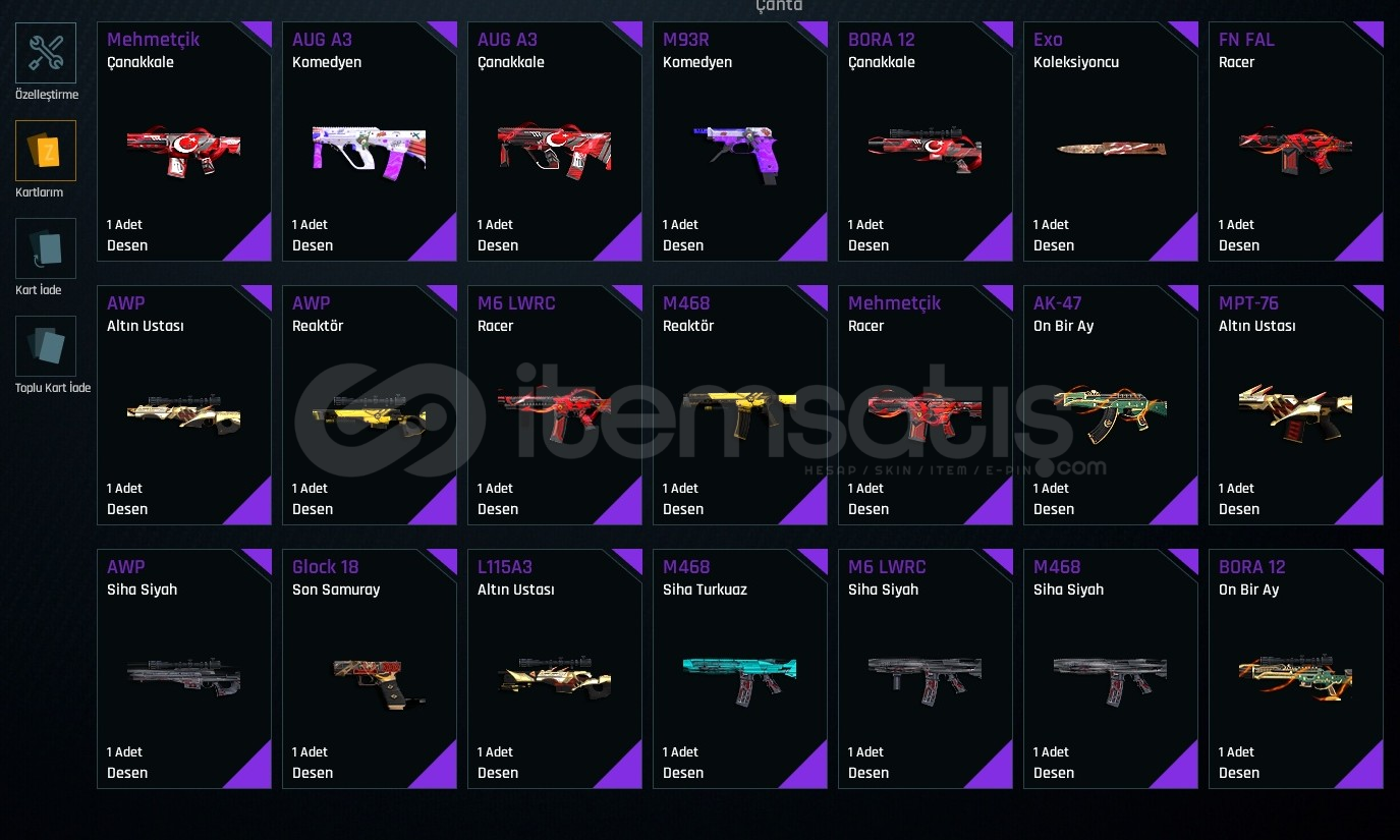 Hesapın İçinde Ful elit desen koleksiyon Dolu Elit Quantum Her silahımda vardır. Her Silah +7 Geri kalan silahların çogu hiç oynanmayan silahlarım çogu +6.dır Fiyat Konusunda Anlaşabiliriz.Güvenli Alış Satış Yaparız.Fakat ilk elden alınır.Bıçakların Bir kısmı +6 Bombaların bir kısma +6Aug +7Mptyt76 +7Rs s1- +7Storm +7m468 +7Groza +7Awp +7L11 +7kar98 +7...