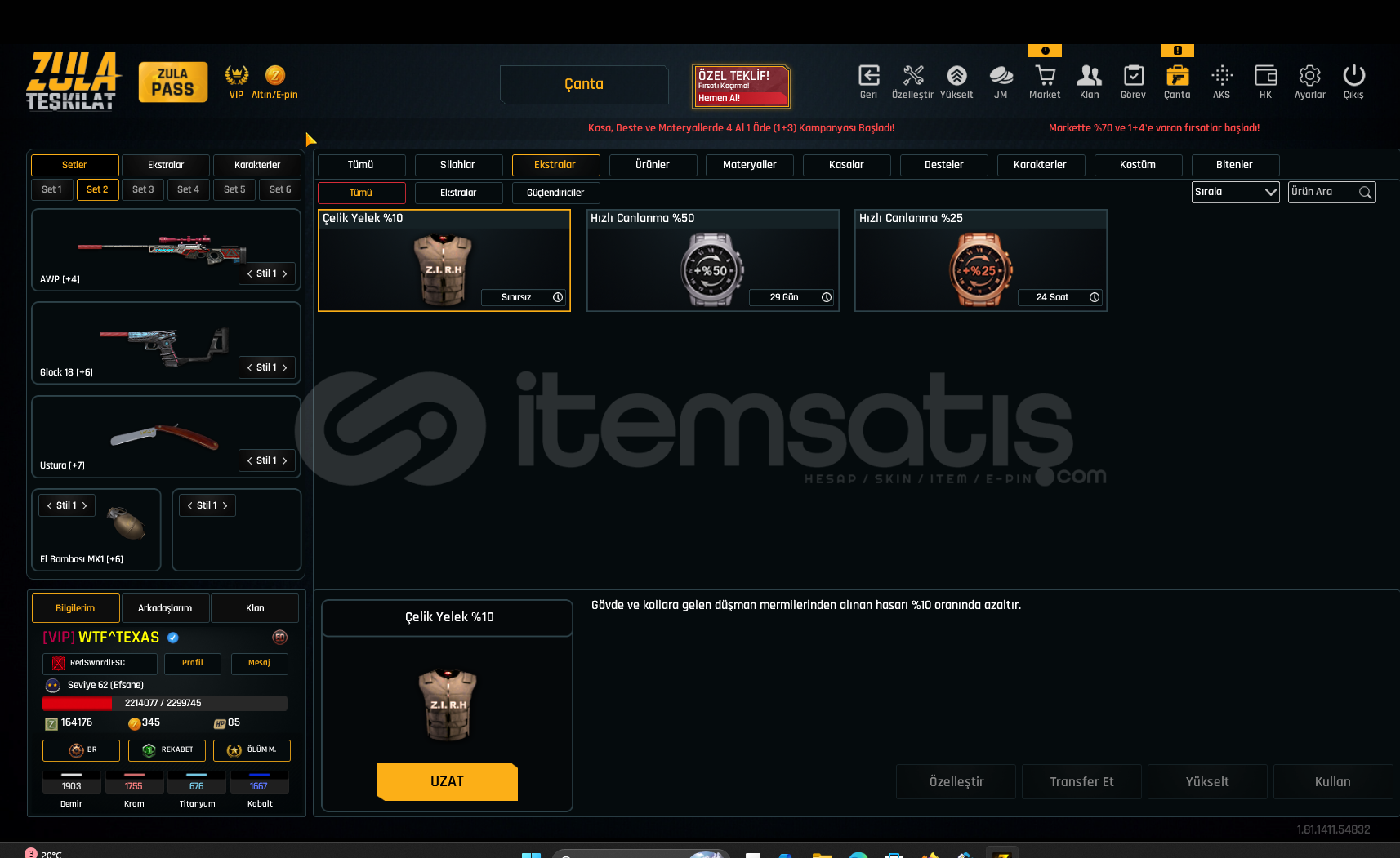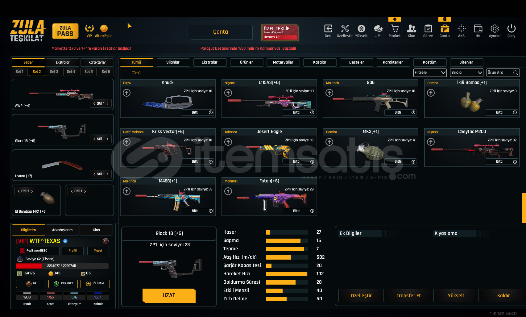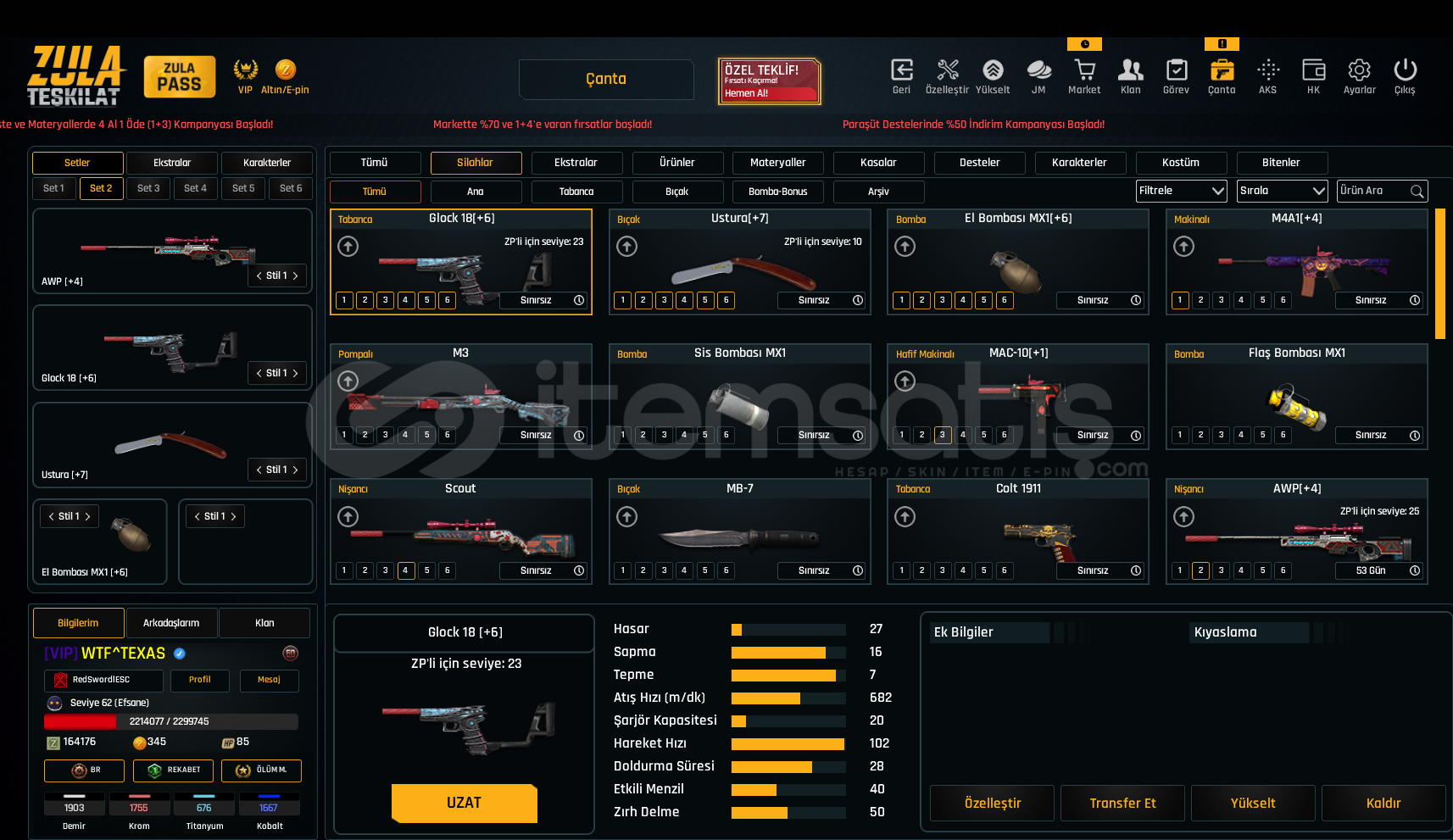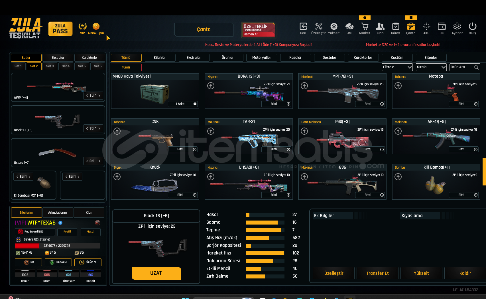 SINIRSIZ GLOCK 18 SINIRSIZ USTURA SINIRSIZ %10 ÇELİK YELEK DOLU KARTLARHesap Seviyesi 62 Bitmemiş vip var dır160 K ZP VARDIRDaha detaylı bilgi için yazabilirsiniz