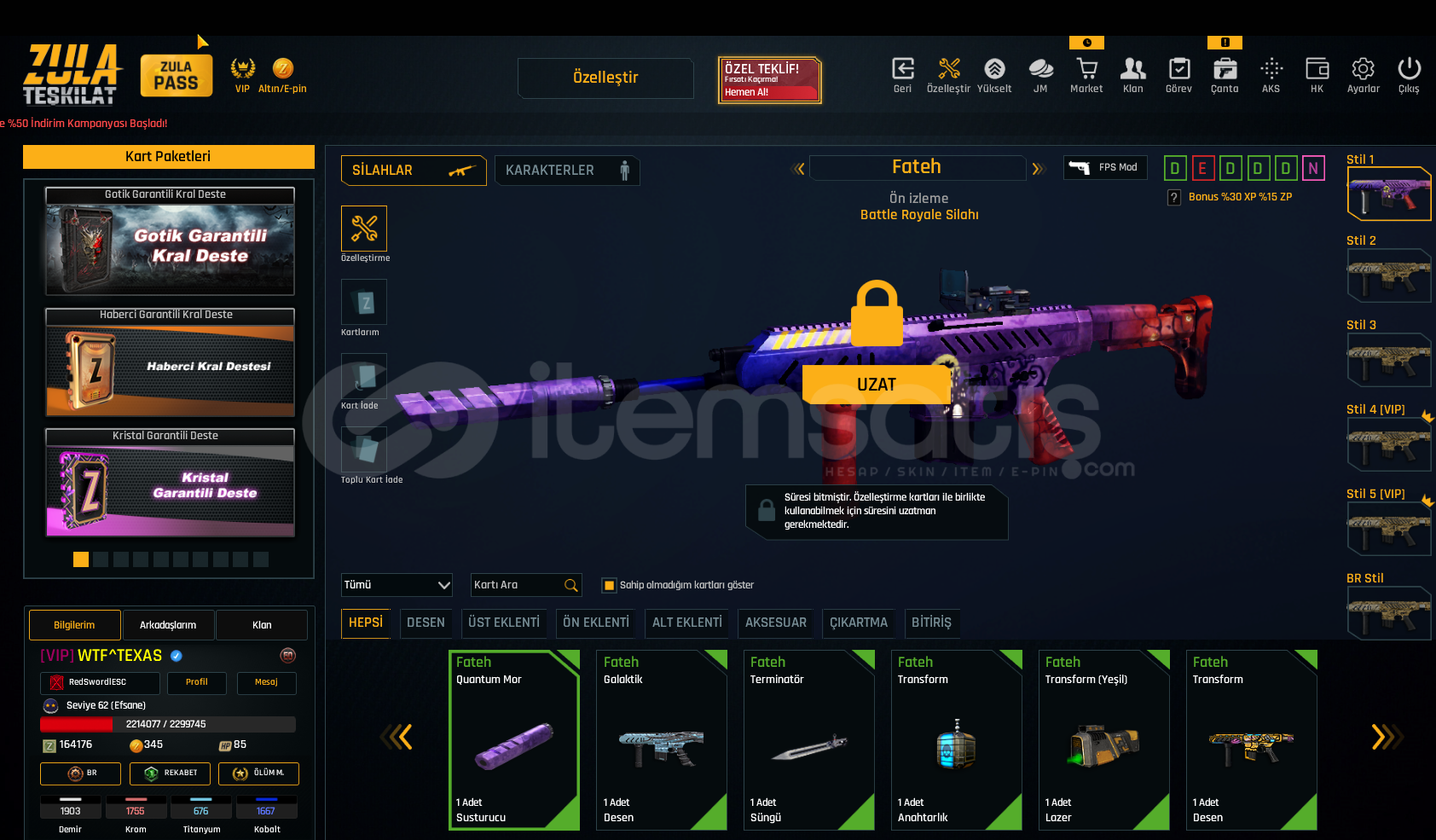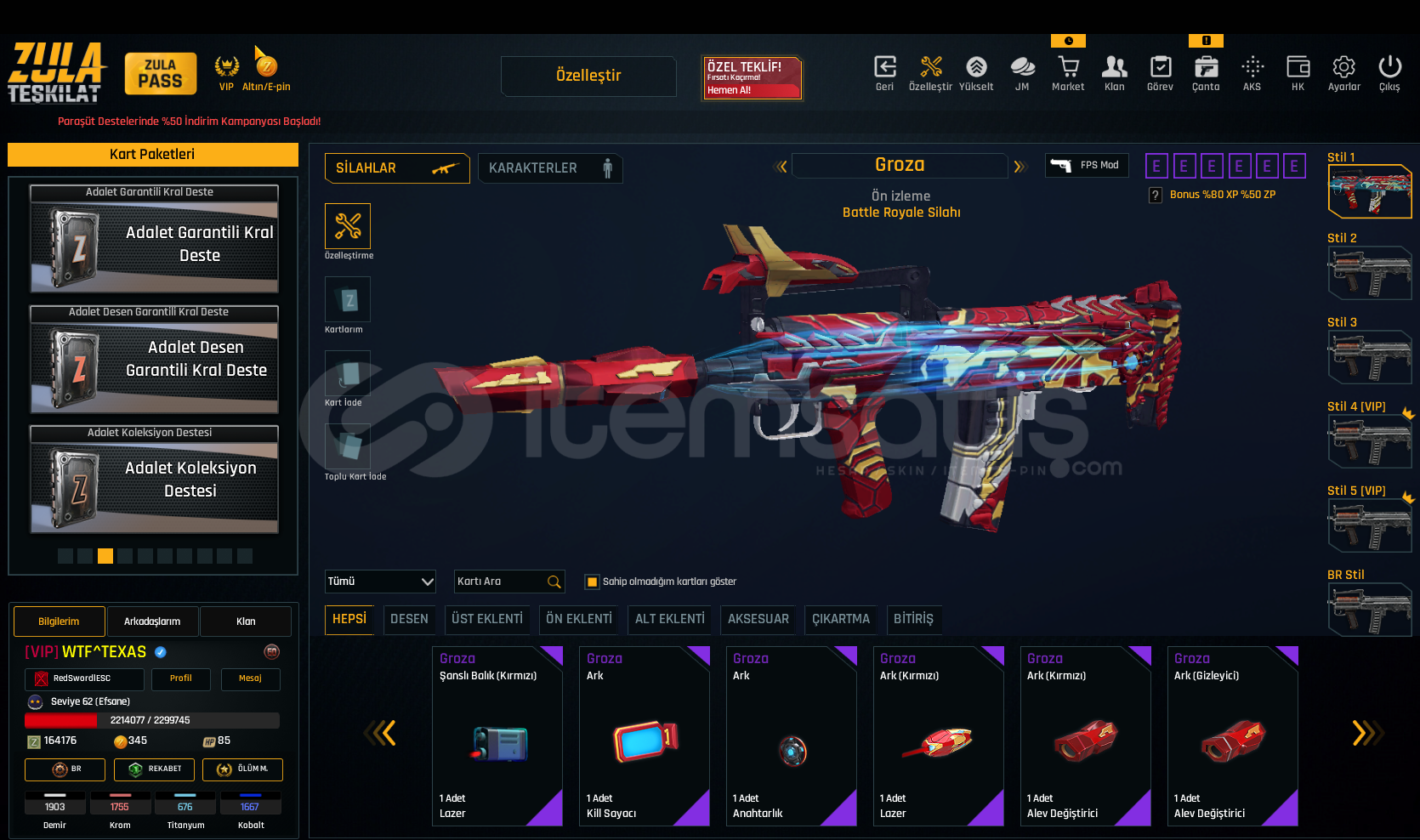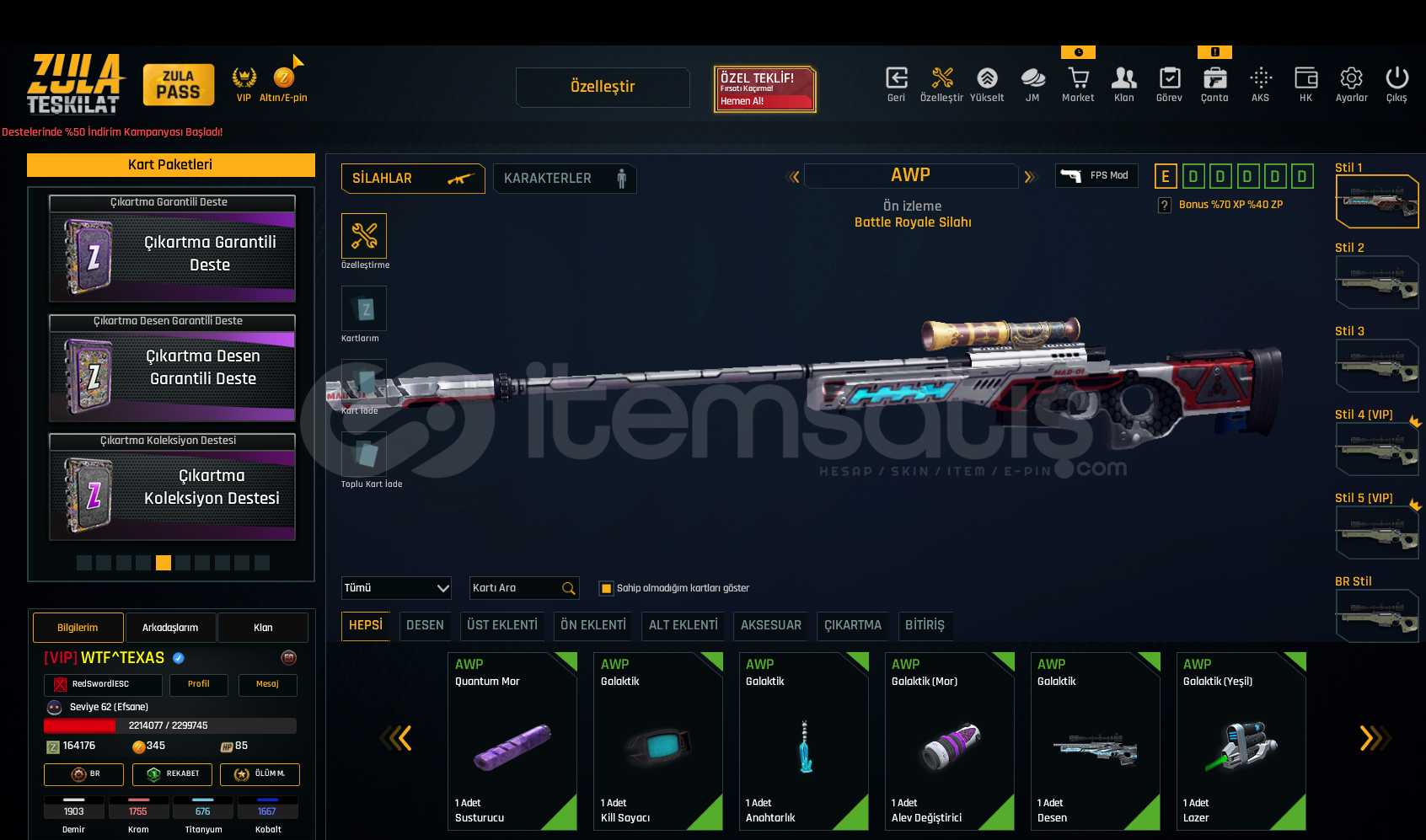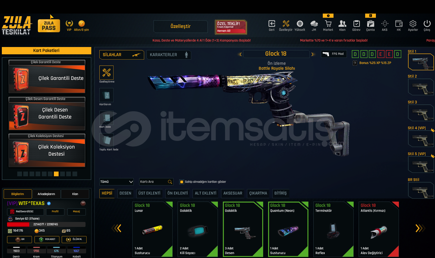 SINIRSIZ GLOCK 18 SINIRSIZ USTURA SINIRSIZ %10 ÇELİK YELEK DOLU KARTLARHesap Seviyesi 62 Bitmemiş vip var dır160 K ZP VARDIRDaha detaylı bilgi için yazabilirsiniz