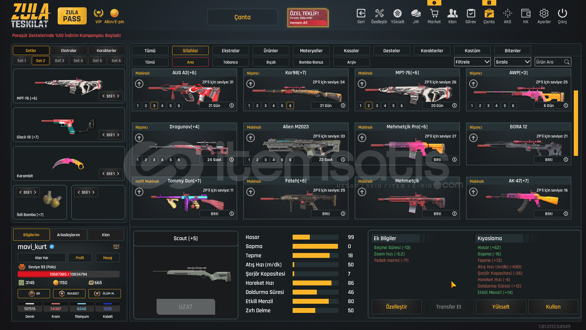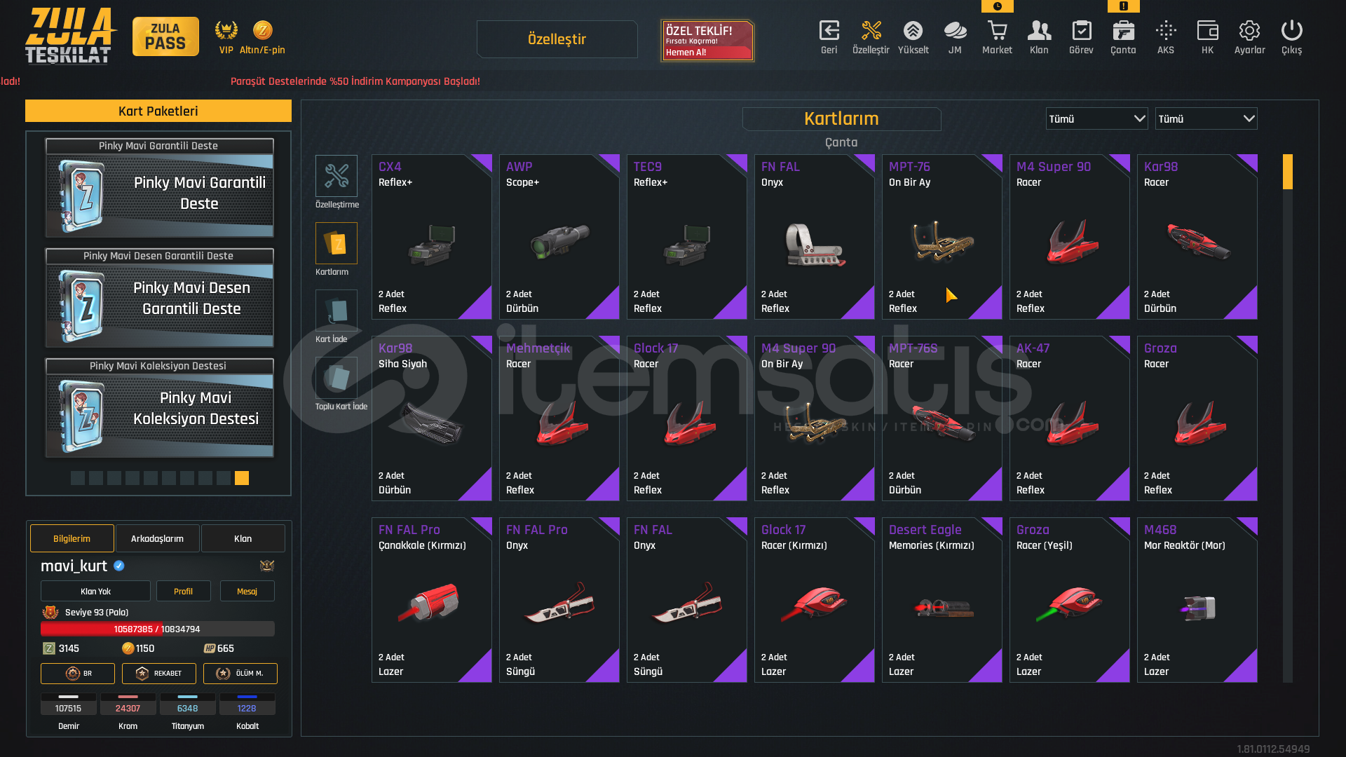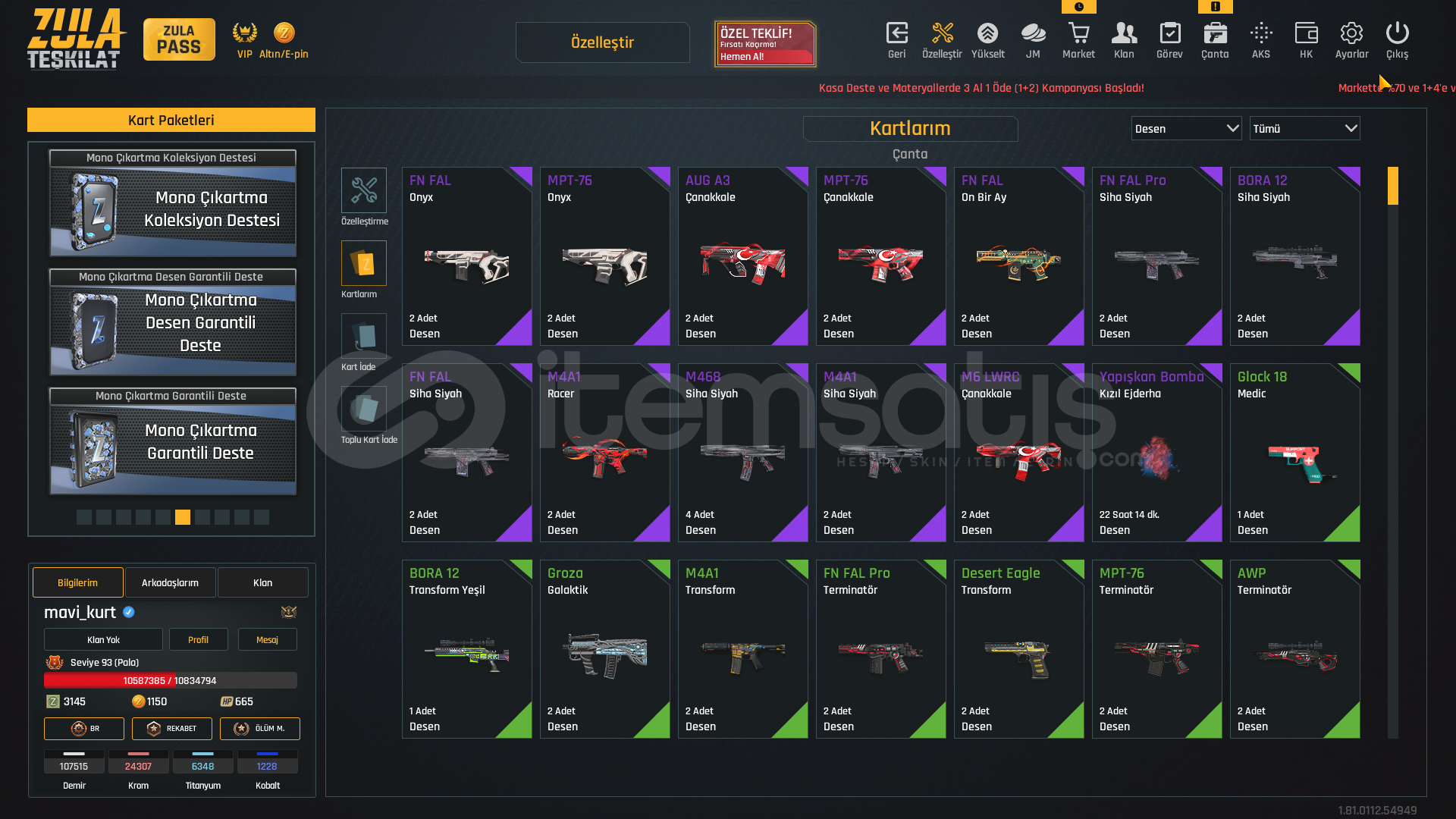 HEMEN HEMEN BÜTÜN SİLAHLARDA NADİR SKİNLER VAR93 LEVELSINIRSIZ KARAKTER ELDİVENLER VE KOSTÜMLERİ107K DEMİR 24K KROM 6K TİTANYUM 1K KOBALT%10 ÇELİK YELEK SINIRSIZ+7 İKİLİ BOMBA SINIRSIZ+7 KAR98+7 TOMMY GUN+7 AK-47+7 M4 SUPER90+7 TRX+7 DSR-1+6 MPT-76+6 AUG A3+6 M4A1+6 M468+6 MEHMETÇİK PRO+6 FATEH+6 GROZA+6 P90+6 MSR 01+6 SHAHER+6 NOVAGERİ KALAN +4 +5
