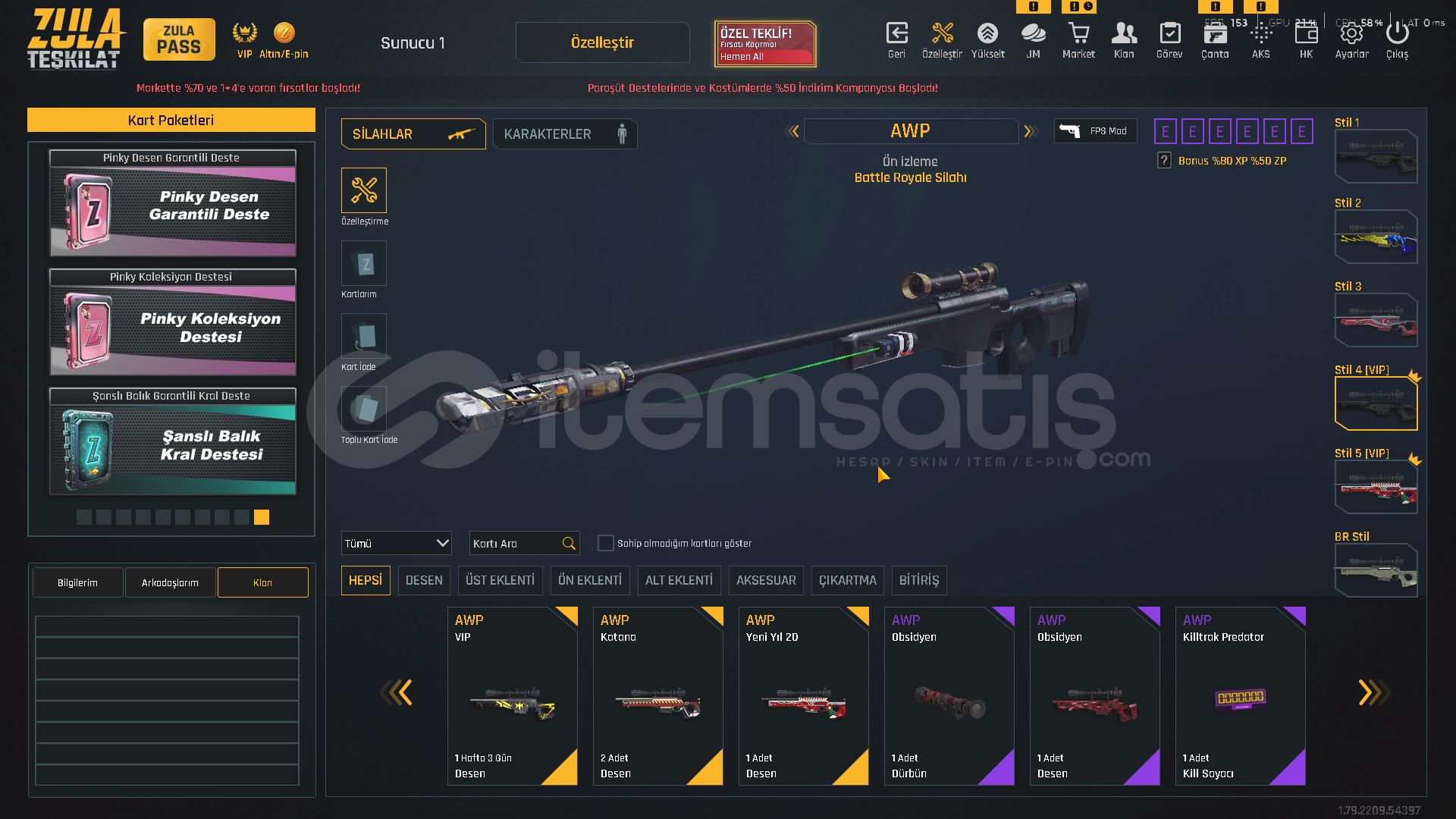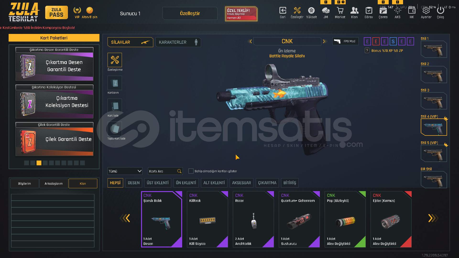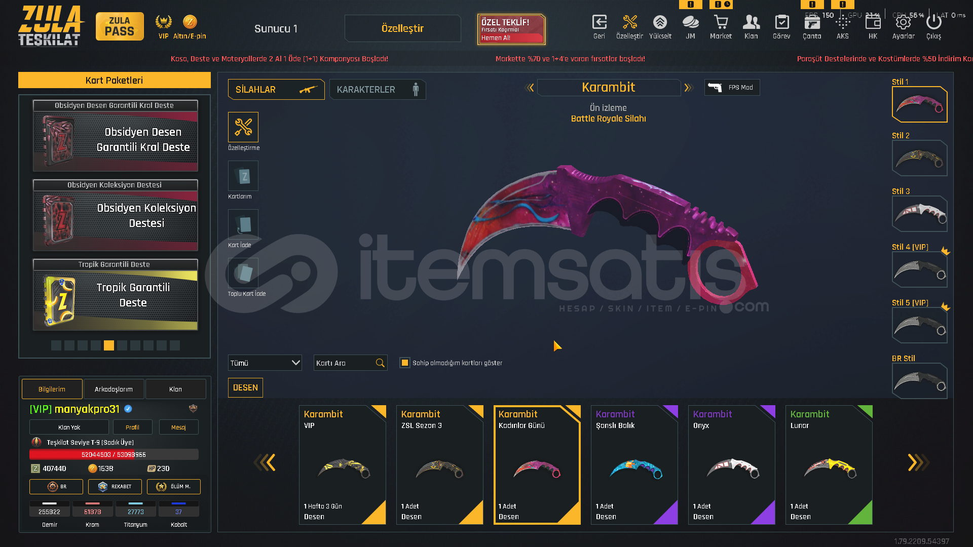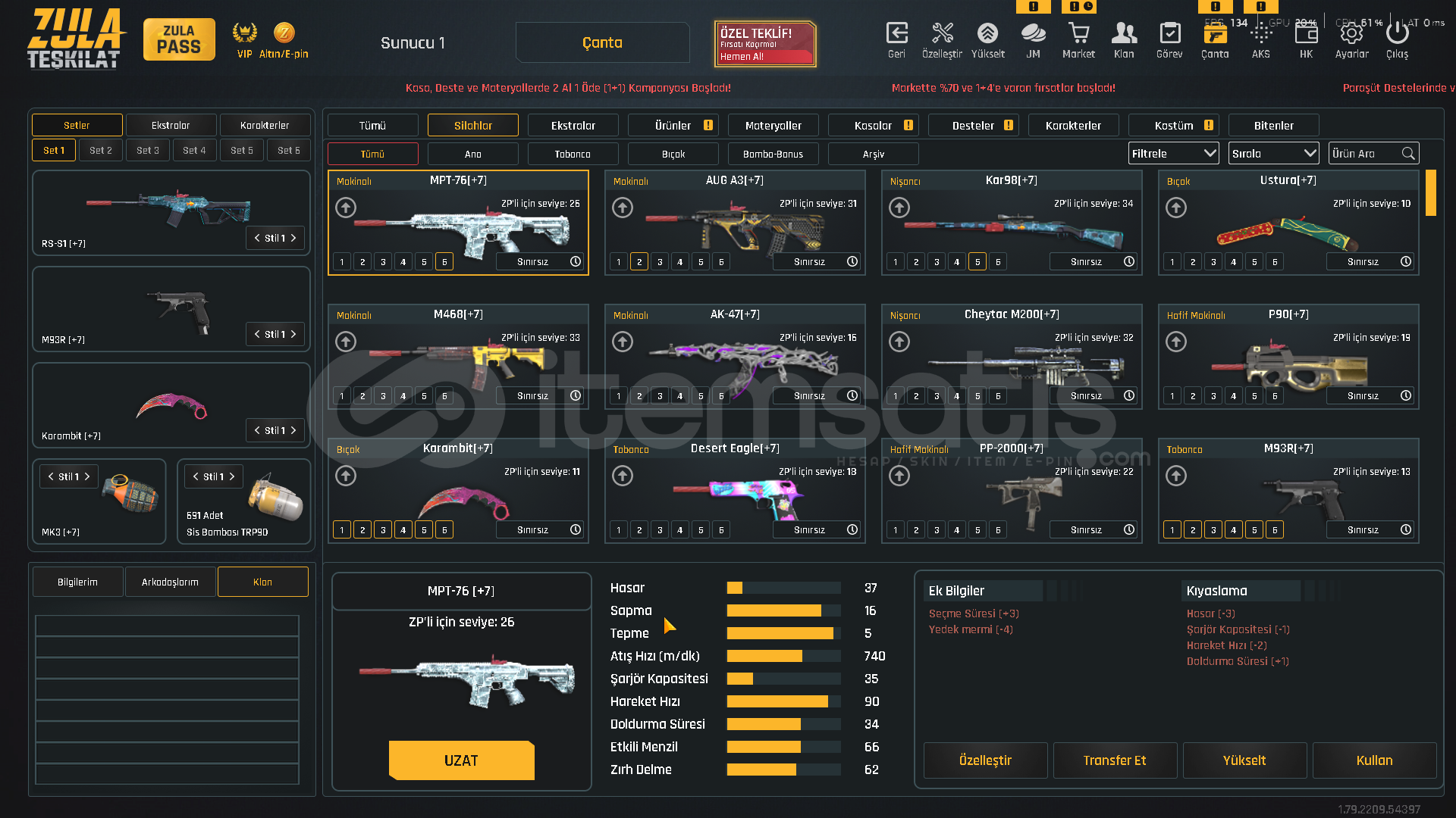 TEŞKİLAT SEVİYE T-9100.000 ZULA ALTINI500.000 ZP MEVCUTZULA PASS AKTİF!VİP AKTİF!⚡ KARAMBİT KADINLAR GÜNÜ DESENİ⚡ USTURA 2018 DESENİ⚡ ZSL SEZON 3 DESENLERİ [ TAM SET ]⚡ YENİ YIL 20 DESENLERİ⚡ 5 ADET TAKMA AD DEĞİŞTİRİCİ💧 AUG QUANTUM+ CEHENNEM💧 M468 QUANTUM+ CEHENNEM💧 GROZA QUANTUM+ CEHENNEM💧 AWP QUANTUM+ OPERASYON💧 DEAGLE QUANTU...