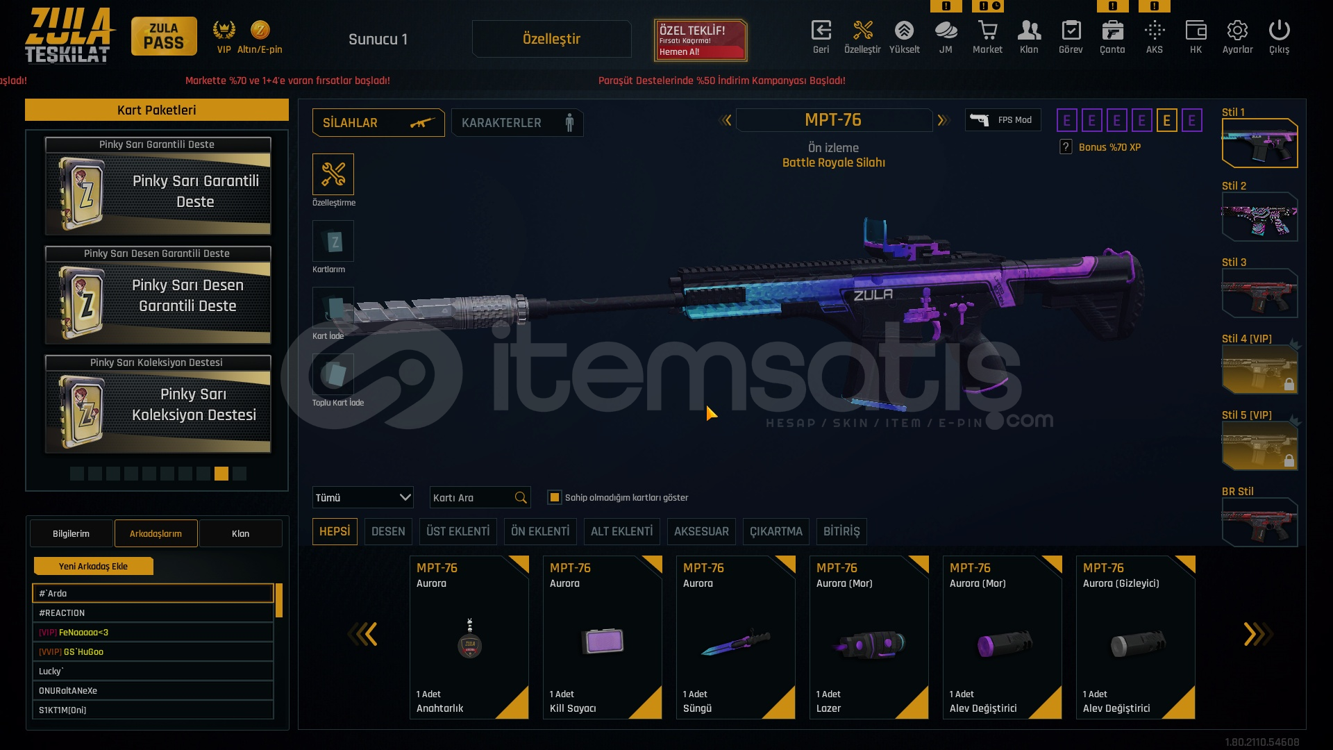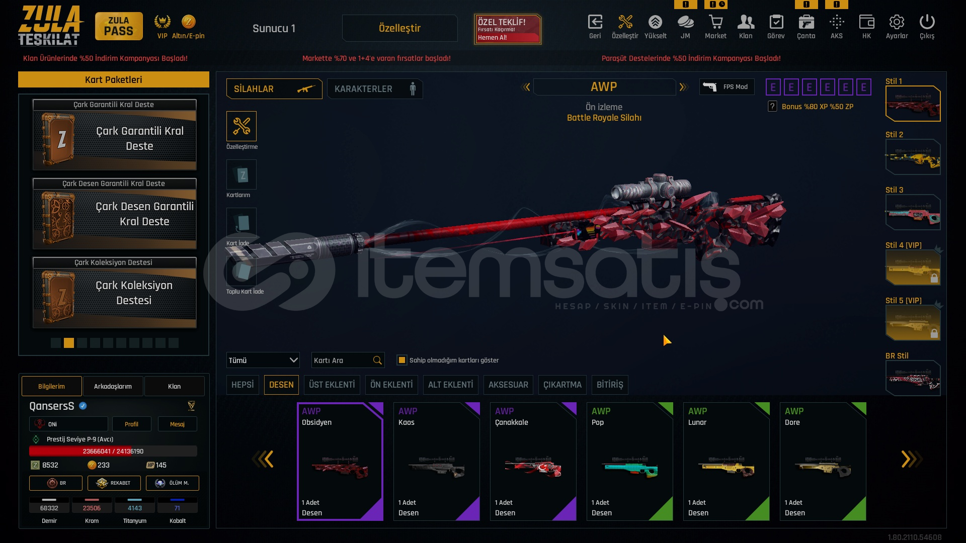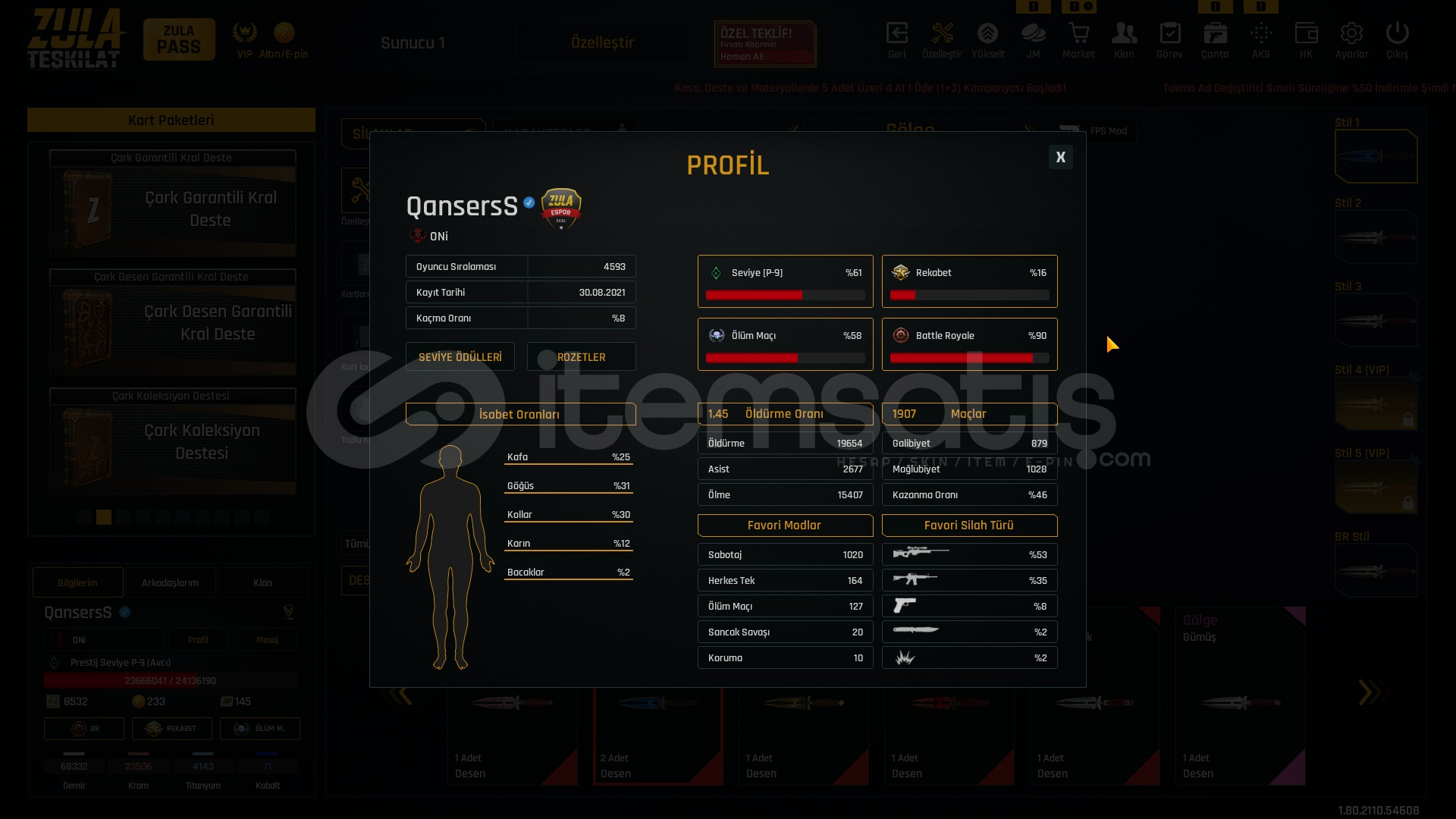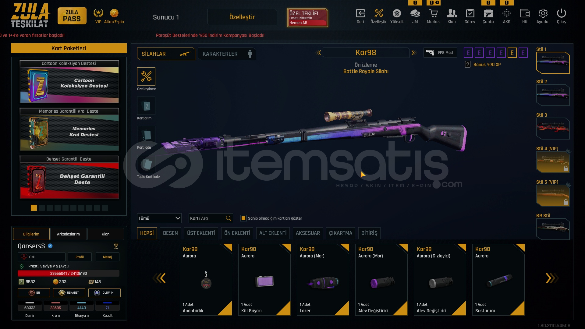 Prestij seviyesi P-9 (109)Bütün Metalar +7***+7 ler ***Kar-98 (quantum +)aug-a3MPT-76GROZA ( QUANTUM +)AWP L115A3İKİLİ BOMBA USTURAM93R***SINIRSIZ***hızlı ateş %5tepma azaltıcı %5takma ad değiştirici (5 adet)istatik sıfırlama (1 adet) ve bol özelleştirme dolusu hesap