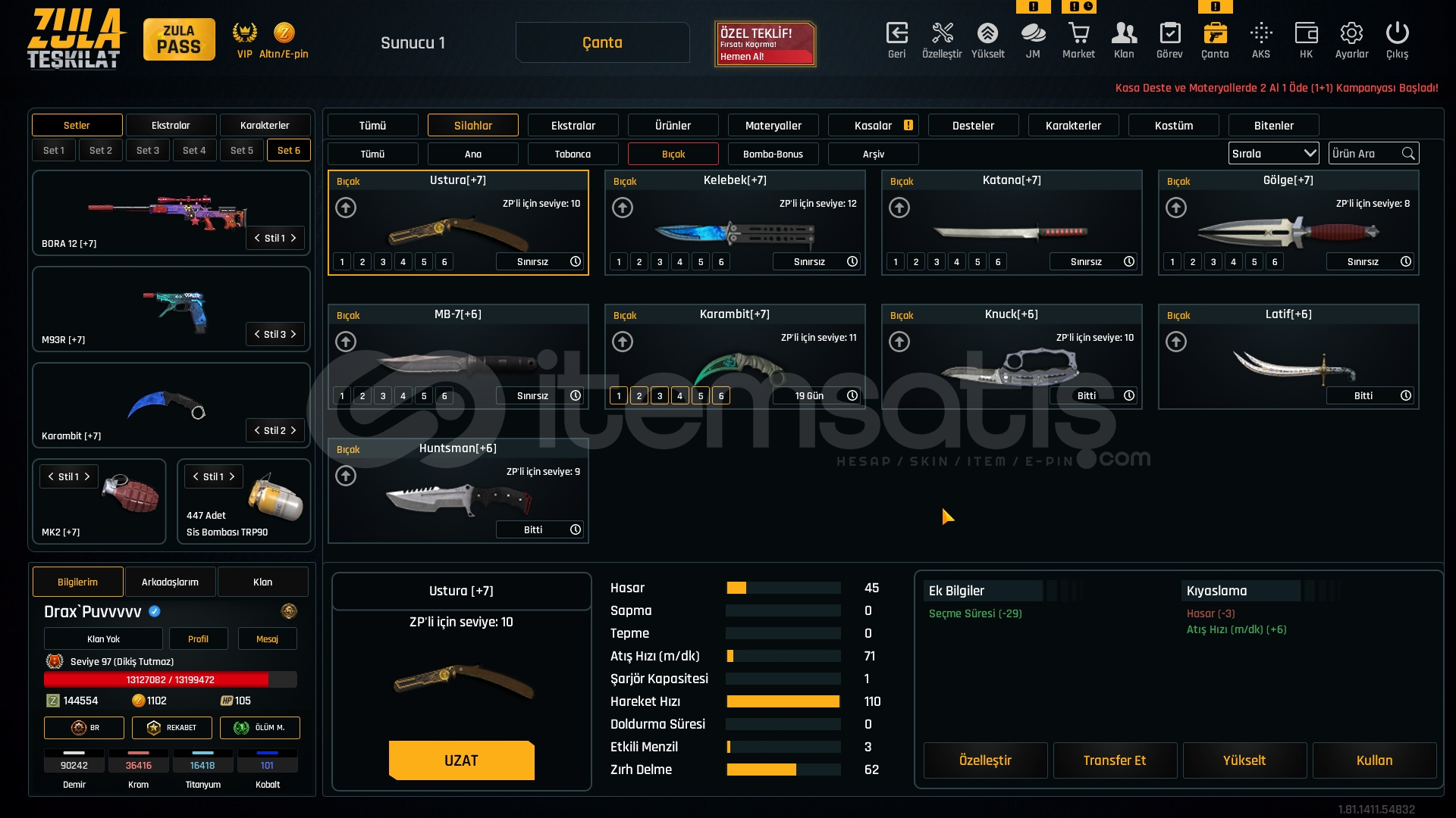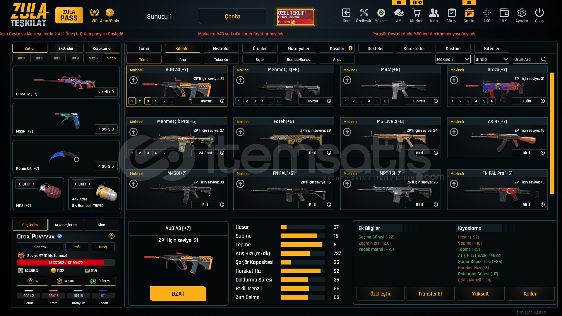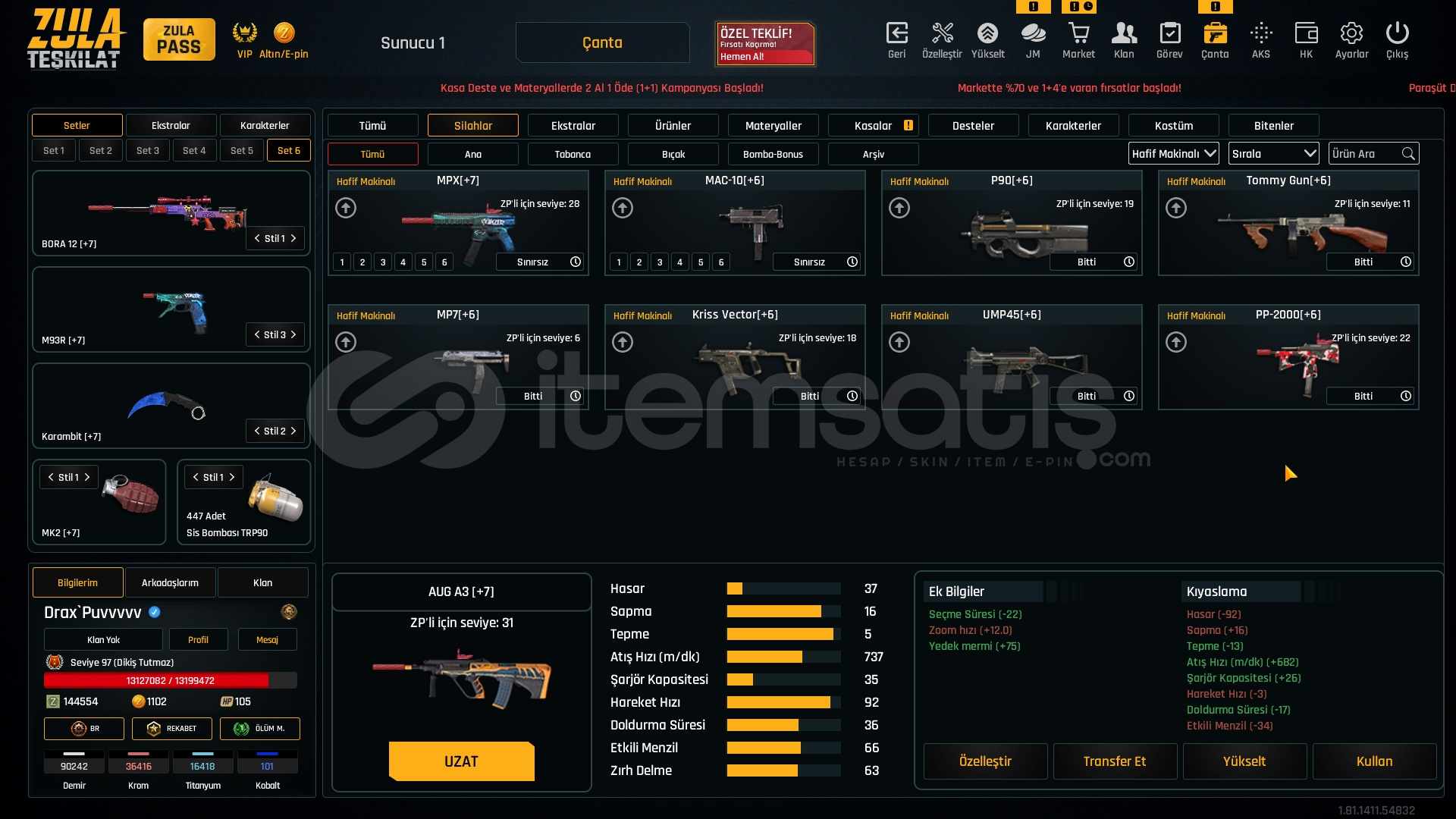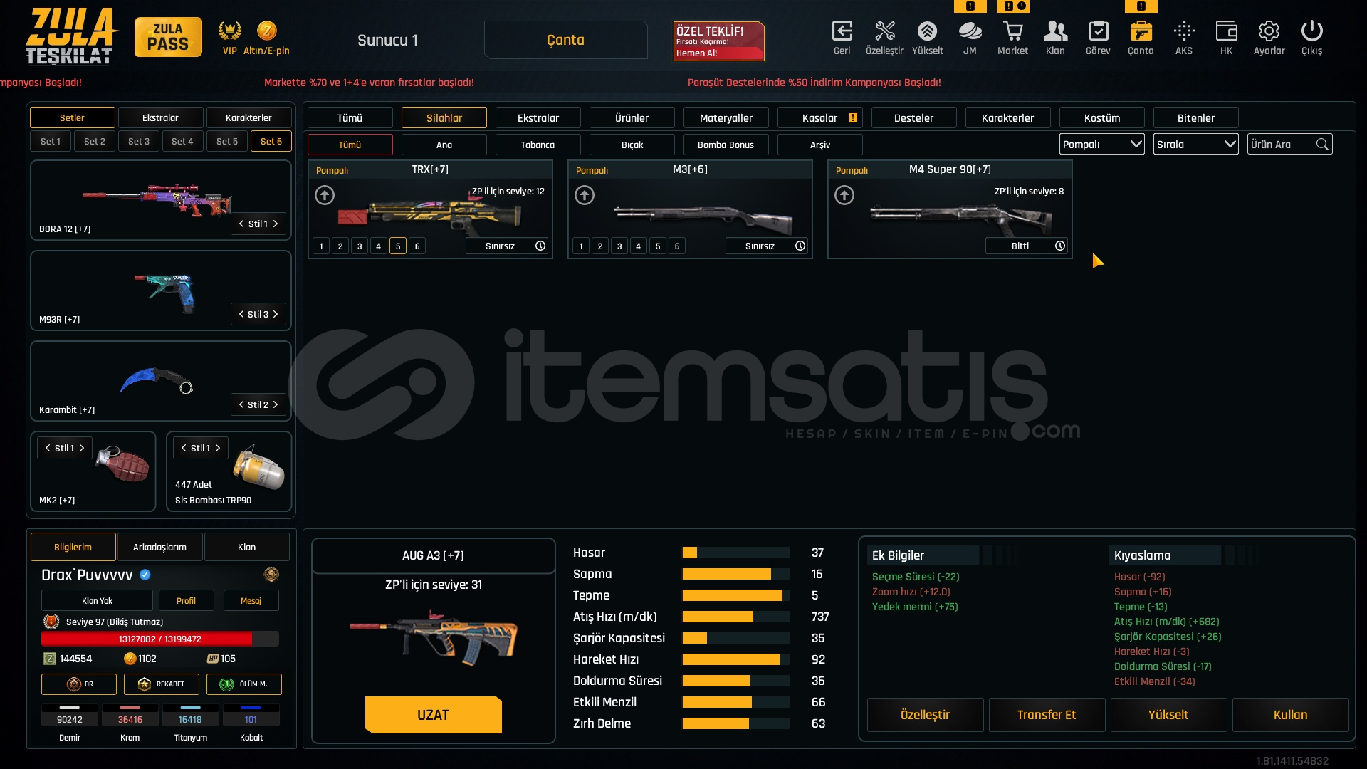 Oyunu 3 yıla yakın süredir oynamıyordum dolular dolusu bir hesap özelleştirme olarak quantum , desenler , dürbünler doludur . Alanı üzmeyecek bir hesap . 97 seviyenin sonlarında 2019 yılında açılmıştır. 4 tane istasitik ve isim sıfırlama kartı vardır . Hesapta 90 bin demir 36 bin krom 16 bin titanyum ve 112 tane kobalt vardır dileyen silahlarına + basabilir isteyene detaylı resmi atılır. Hesabın maili tek kullanımlık girilmiştir kimsenin erişimi bulunmamakta herhangi bir sorun çıkarsa kefil olurum telefon numarası ile devredilecektir.