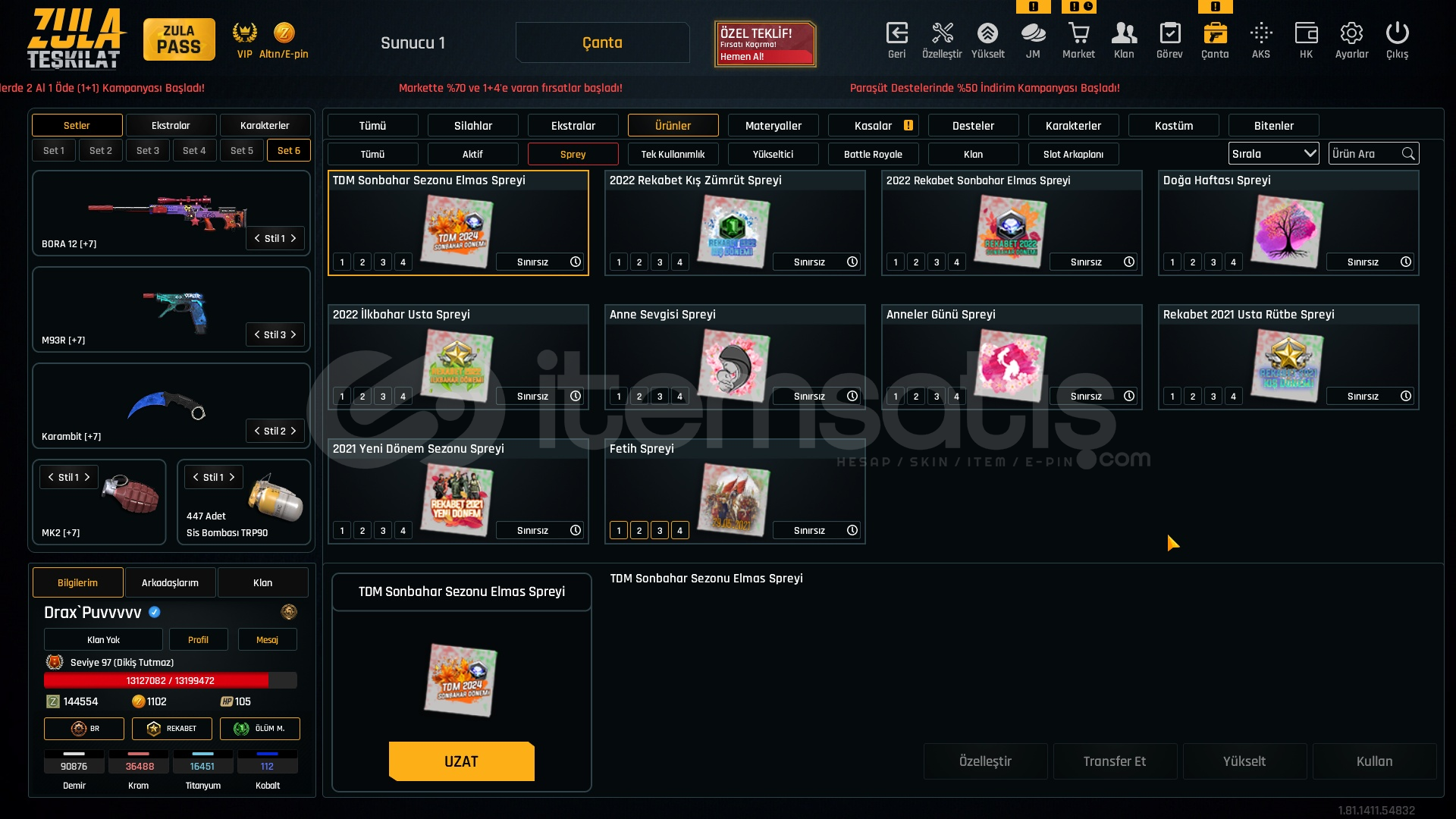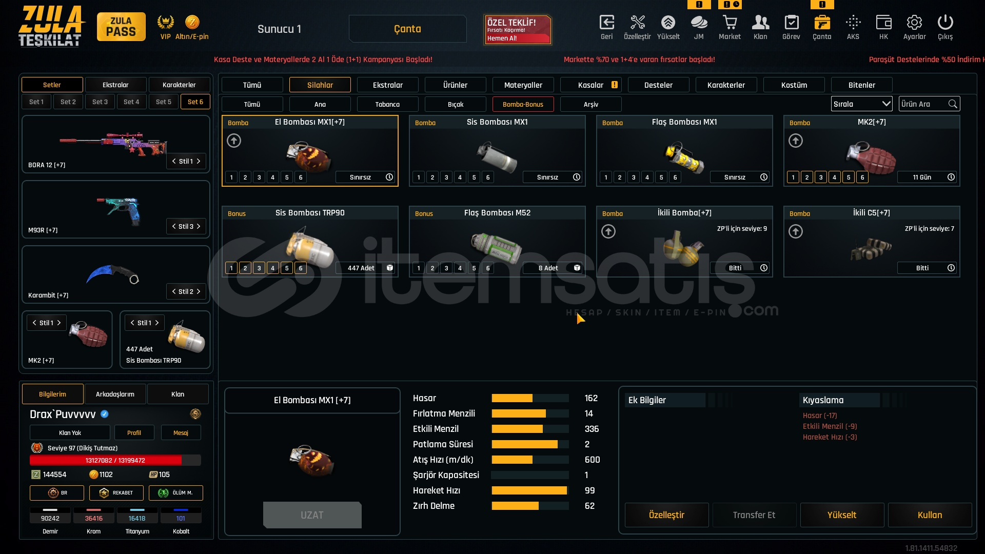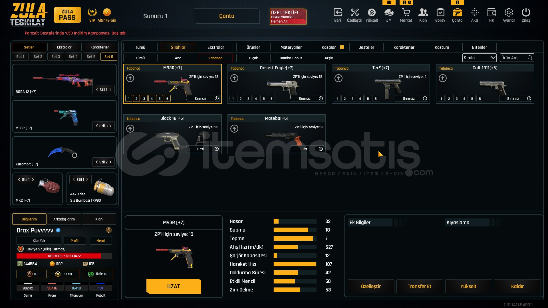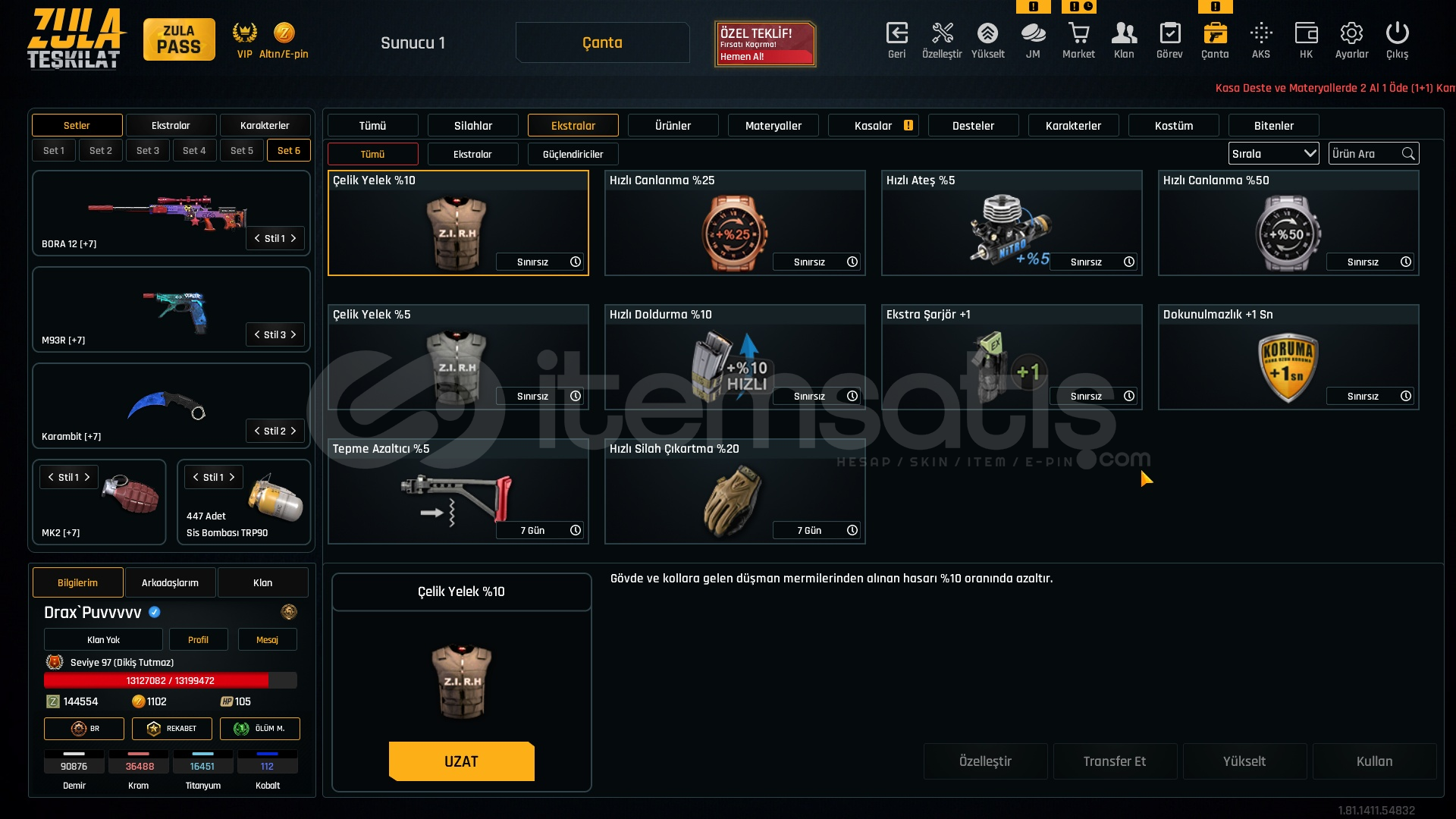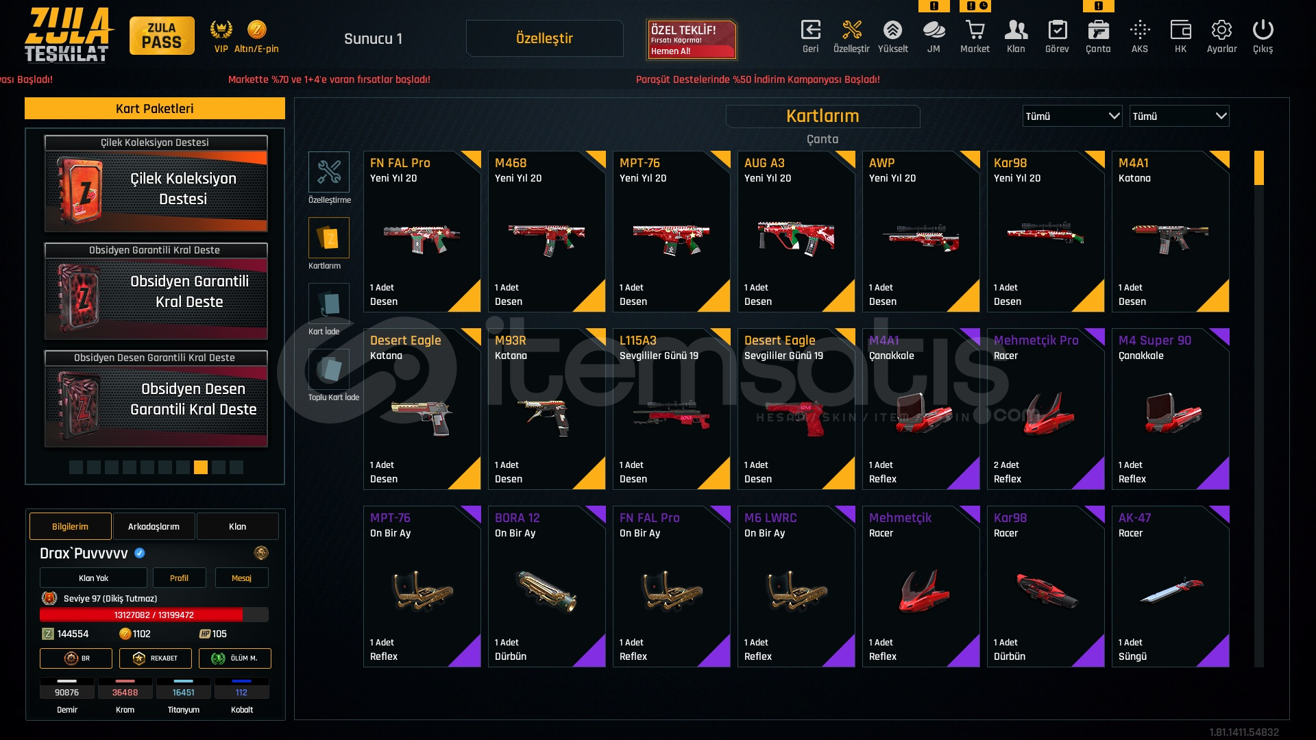Oyunu 3 yıla yakın süredir oynamıyordum dolular dolusu bir hesap özelleştirme olarak quantum , desenler , dürbünler doludur . Alanı üzmeyecek bir hesap . 97 seviyenin sonlarında 2019 yılında açılmıştır. 4 tane istasitik ve isim sıfırlama kartı vardır . Hesapta 90 bin demir 36 bin krom 16 bin titanyum ve 112 tane kobalt vardır dileyen silahlarına + basabilir isteyene detaylı resmi atılır. Hesabın maili tek kullanımlık girilmiştir kimsenin erişimi bulunmamakta herhangi bir sorun çıkarsa kefil olurum telefon numarası ile devredilecektir.