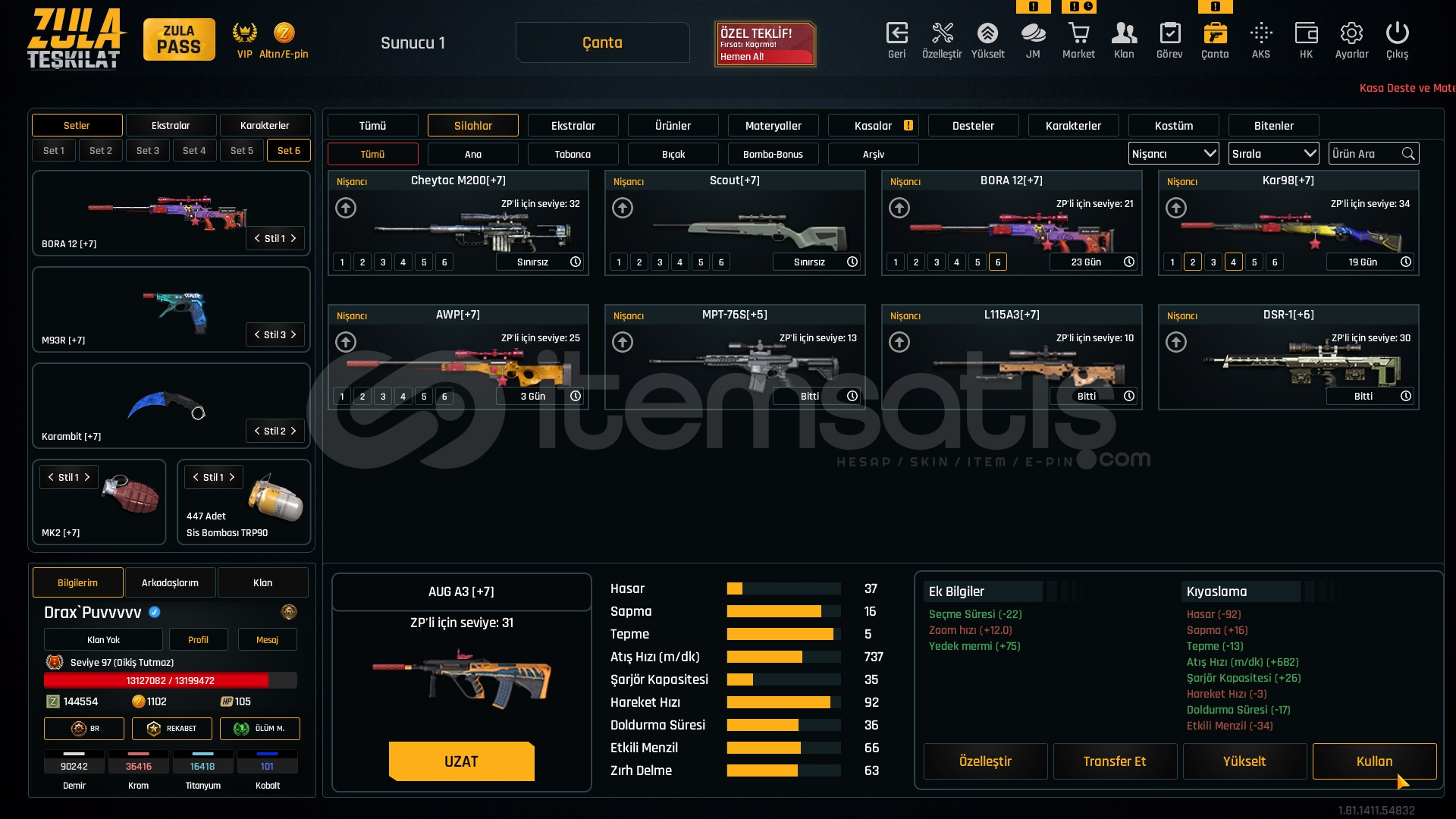 Oyunu 3 yıla yakın süredir oynamıyordum dolular dolusu bir hesap özelleştirme olarak quantum , desenler , dürbünler doludur . Alanı üzmeyecek bir hesap . 97 seviyenin sonlarında 2019 yılında açılmıştır. 4 tane istasitik ve isim sıfırlama kartı vardır . Hesapta 90 bin demir 36 bin krom 16 bin titanyum ve 112 tane kobalt vardır dileyen silahlarına + basabilir isteyene detayl...
