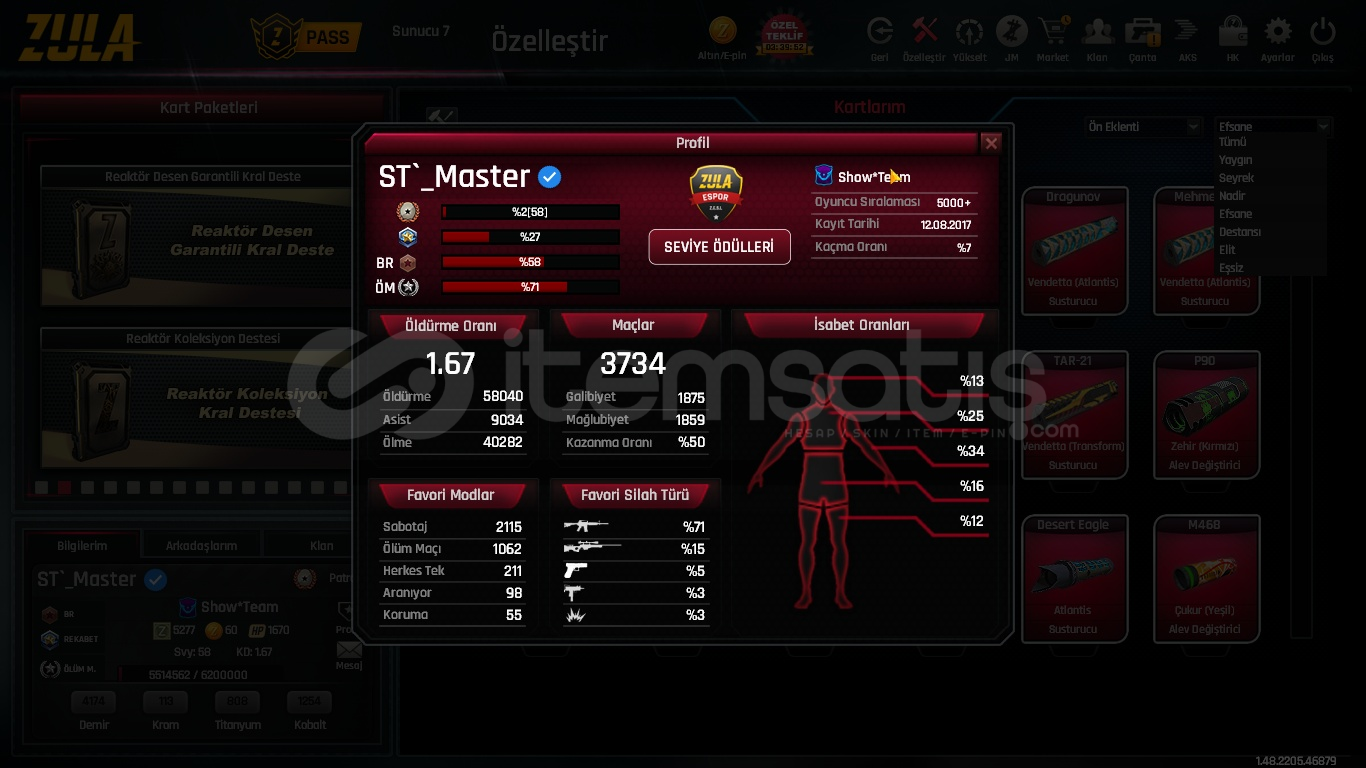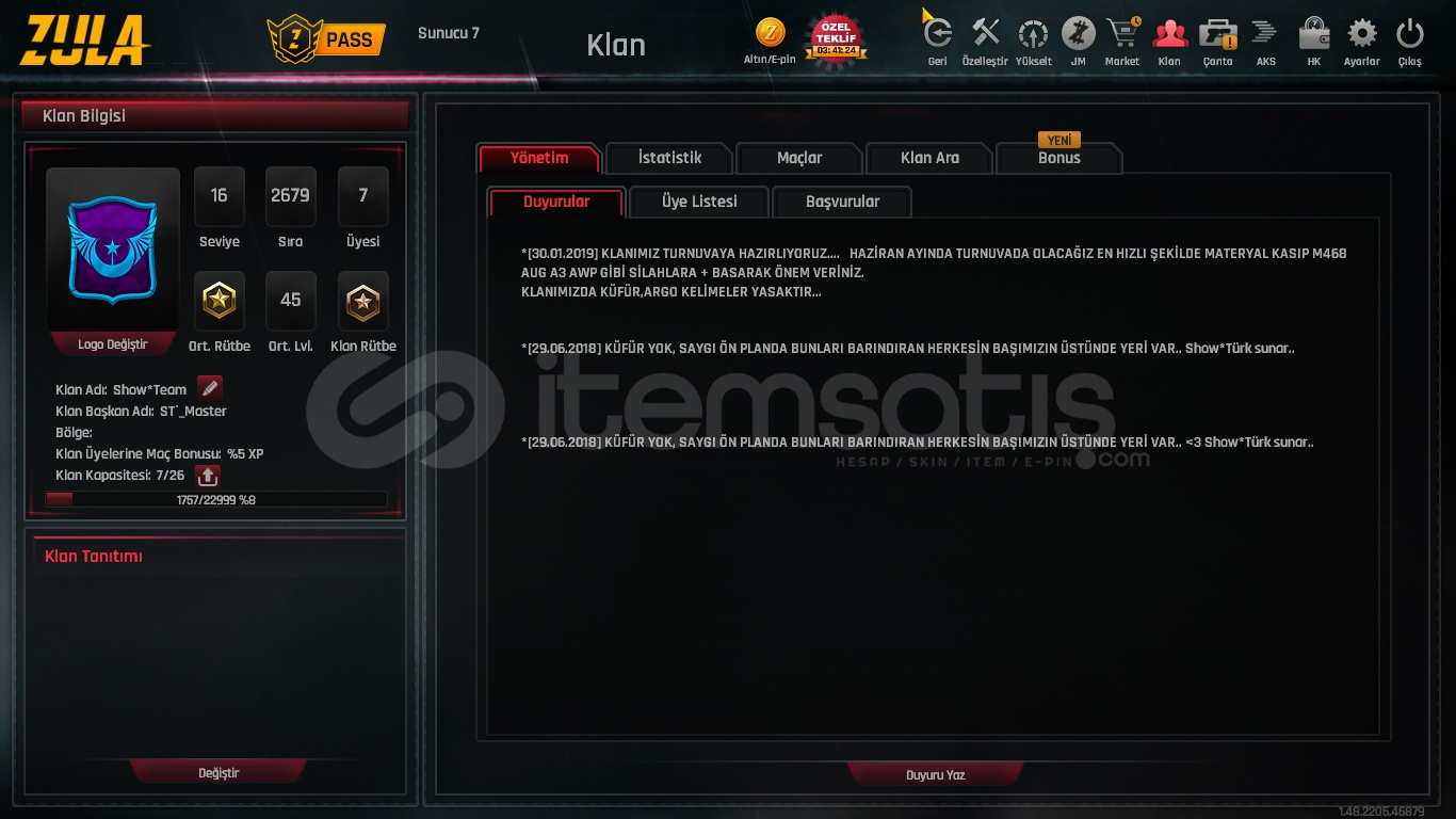SUDAN UCUZ DOLU HESAP KLAN DAHİL HER ŞEY SİZİN Klan Sahibisiniz ! KARTLAR4 eşsiz204 destansı-22 desen-26 üst eklenti-87 ön eklenti 58 QUANTUM491 efsane-137 desen-37 vendetta-76 üst eklentiSINIRSIZLARG36BORA 12MEHMETÇİKYÜKSELTMELERUSTURA +7AUG A3 +6KAR-98 +6M468 +4KARAMBİT +6İKİLİ BOMBA +6GLOCK 18 +6MATERYALLER4174 demir113 krom808 titanyum1254 kobaltÜRÜNLER5 takma ad değiştirici4 istatistik s...