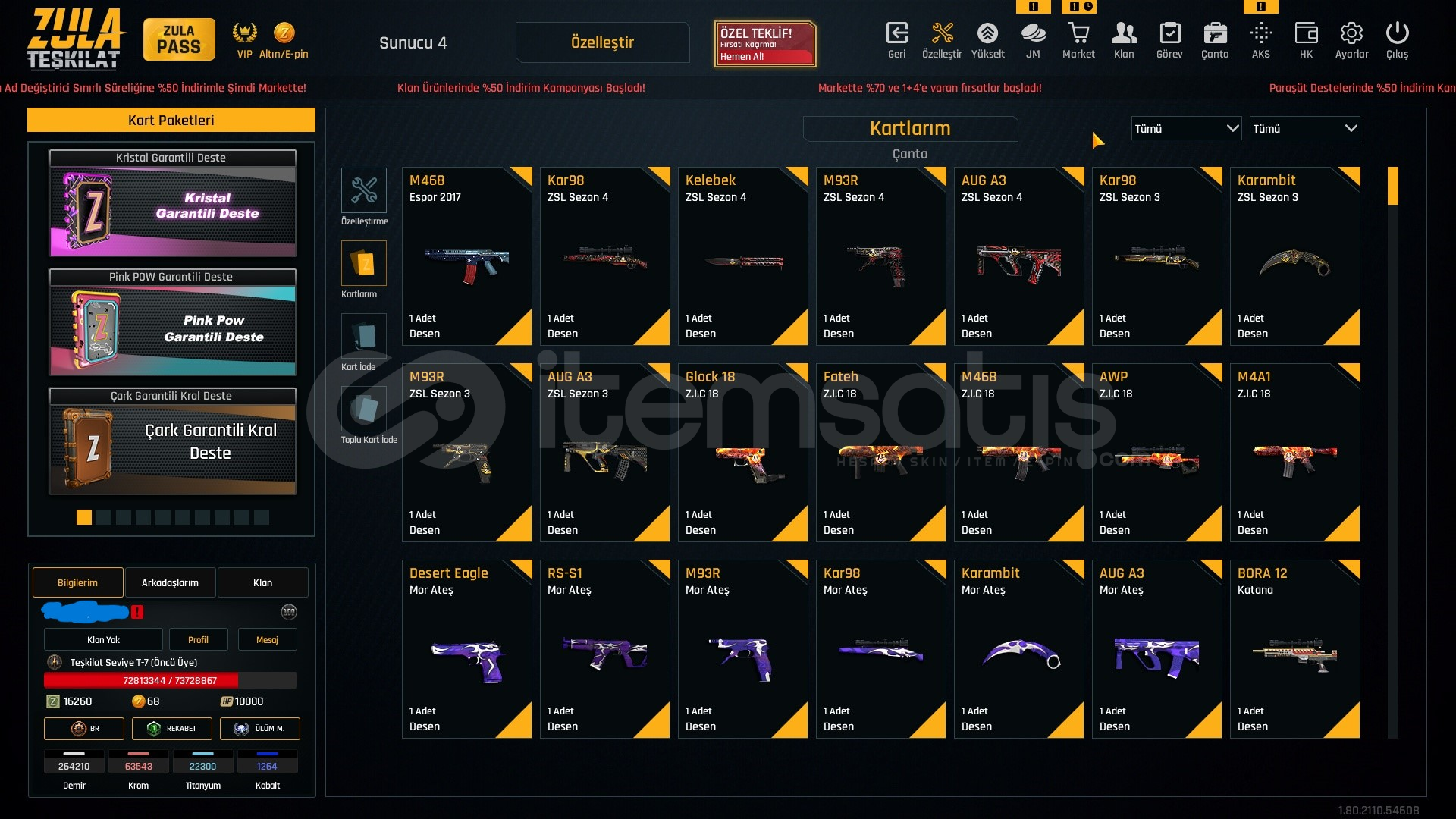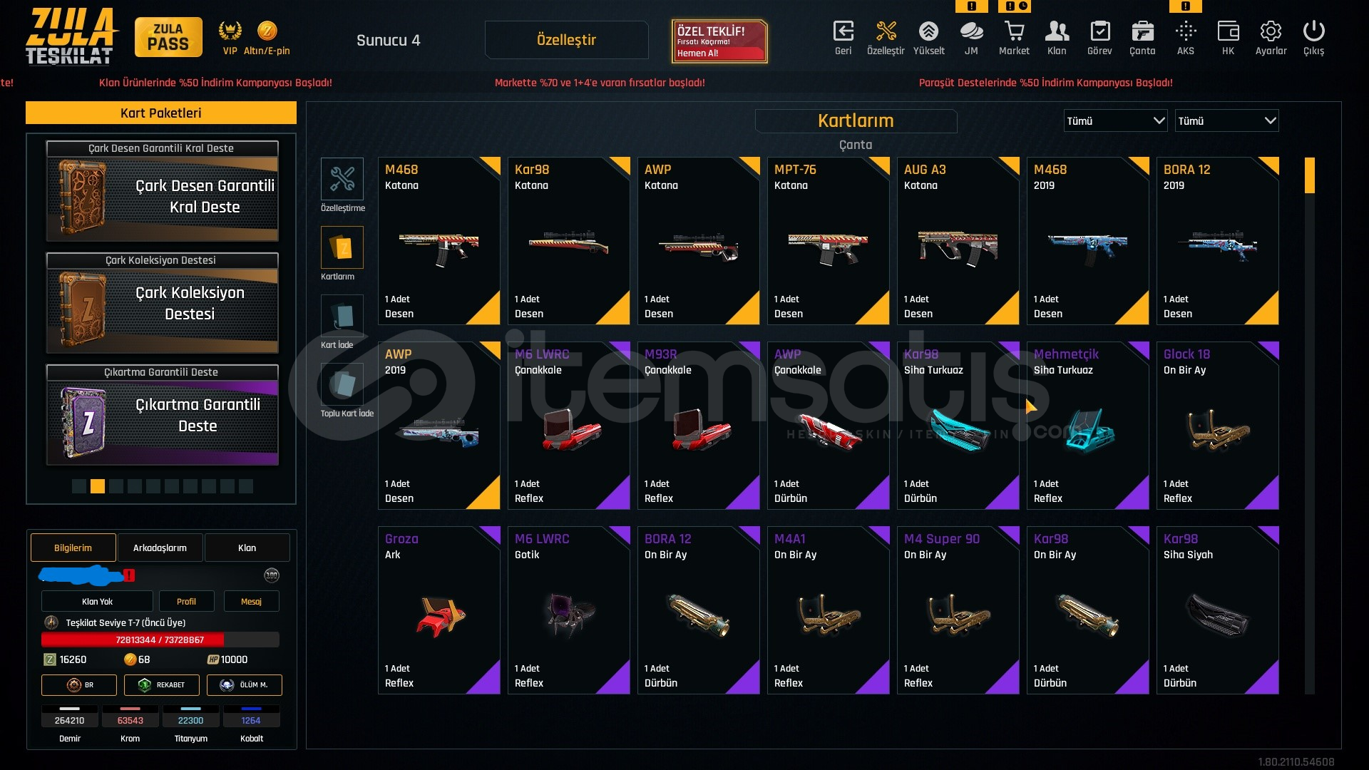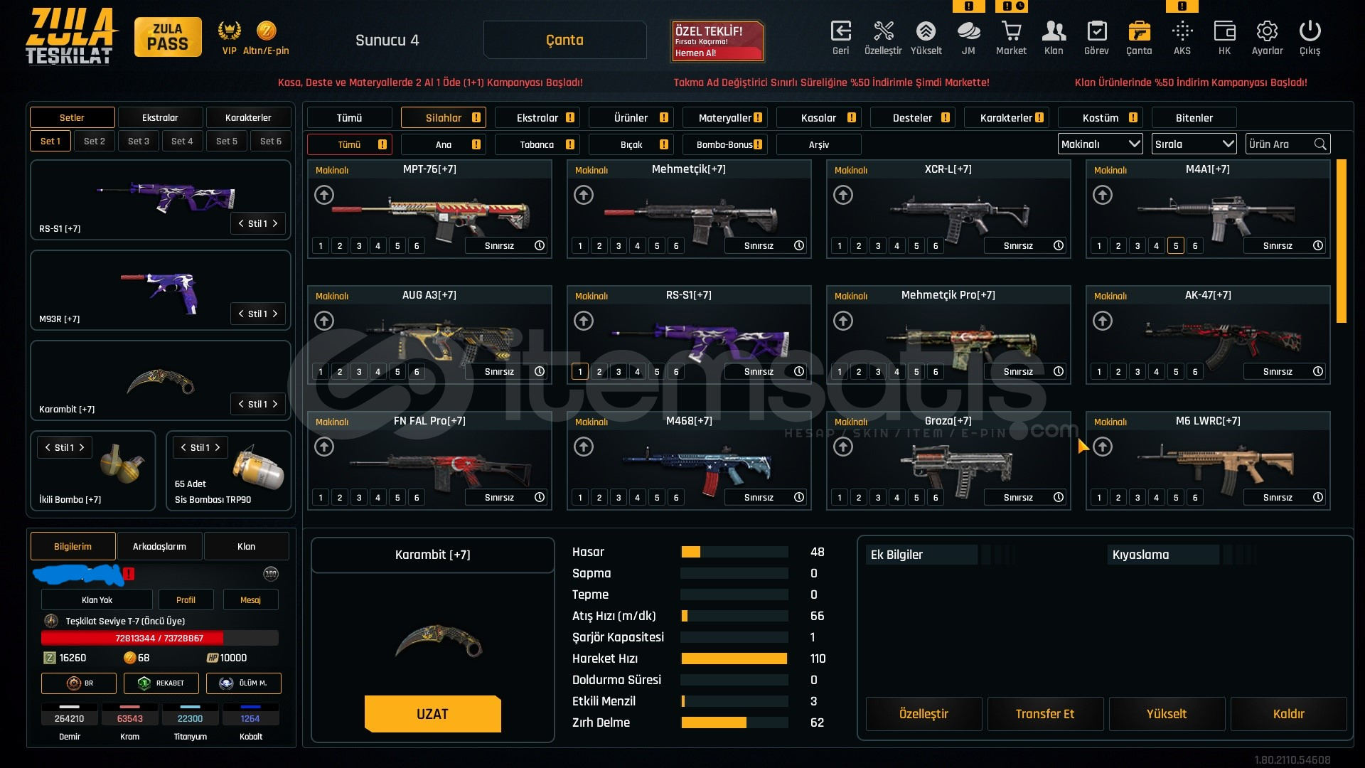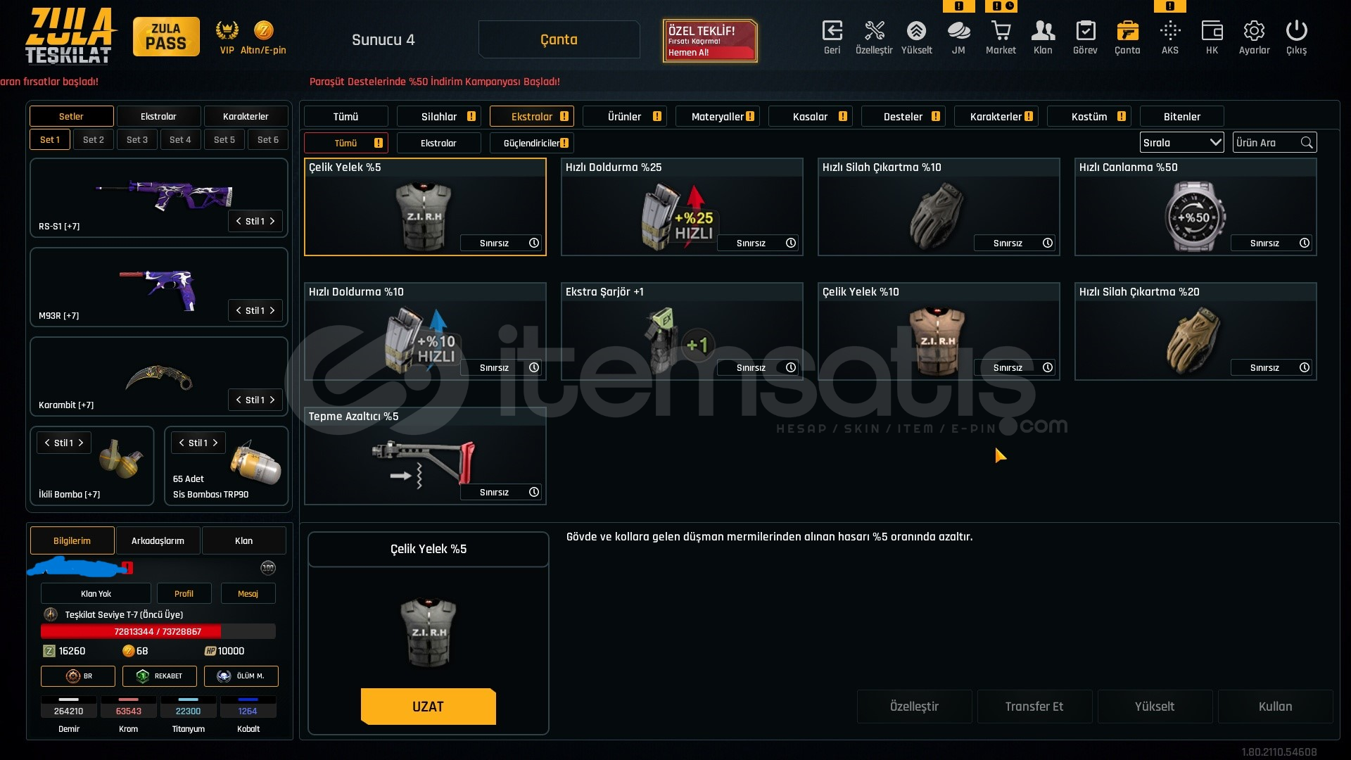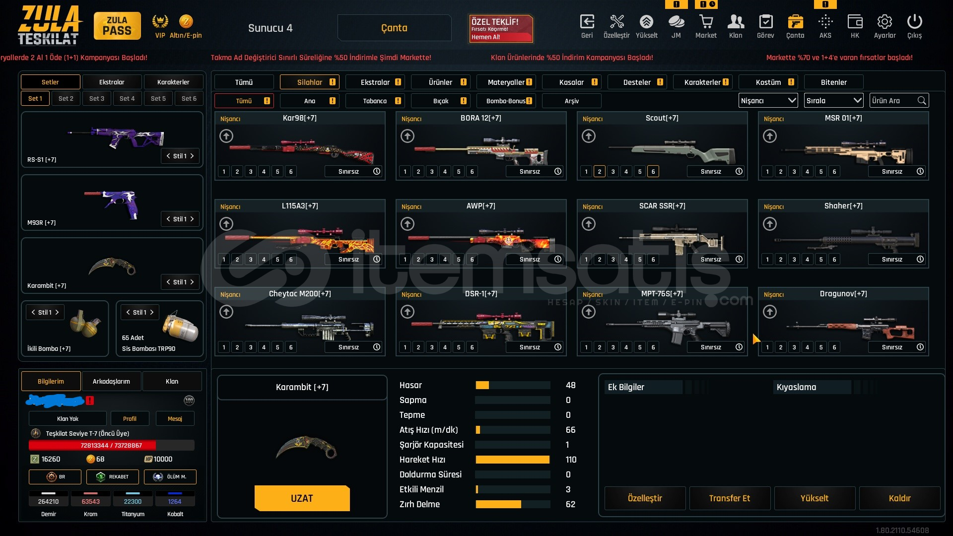 🔥 ZULA TR – FULL + FULL + NADİR SKİNLERLİ KOLEKSİYONLUK HESAP 🔥🟢 T7 Seviye🟢 16260+ ZP🟢 80 Adet Sınırsız +7 Silah💰 Fiyat: ₺8500💬 NOTLAR:🟢 Mail ve telefon doğruluğu yok → Satın aldıktan sonra kendi bilgilerinizi tanımlayabilirsiniz.🟢 Hiçbir susturma / ceza yoktur.🟢 Pazarlık yapılabilir – ancak hesap içeriğiyl...