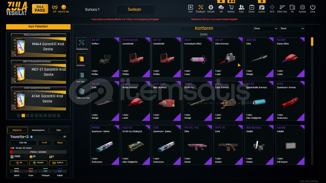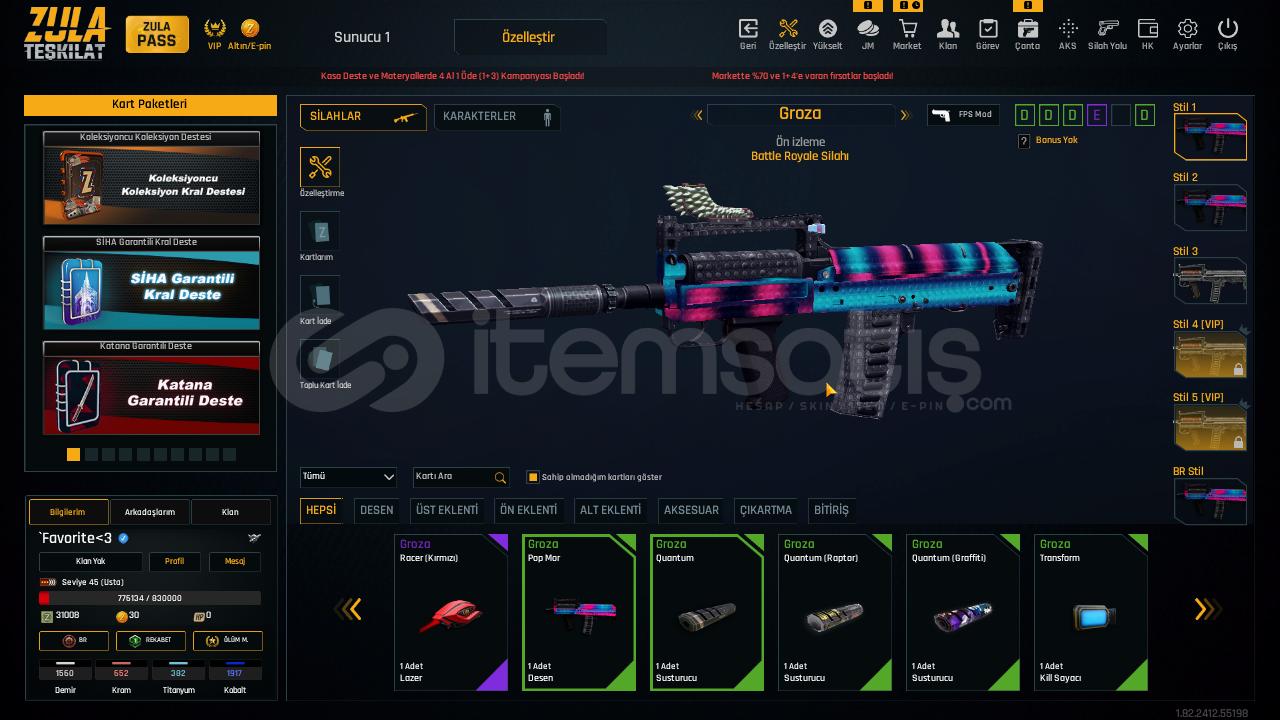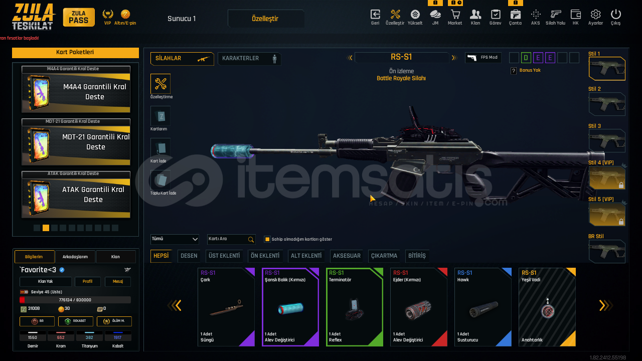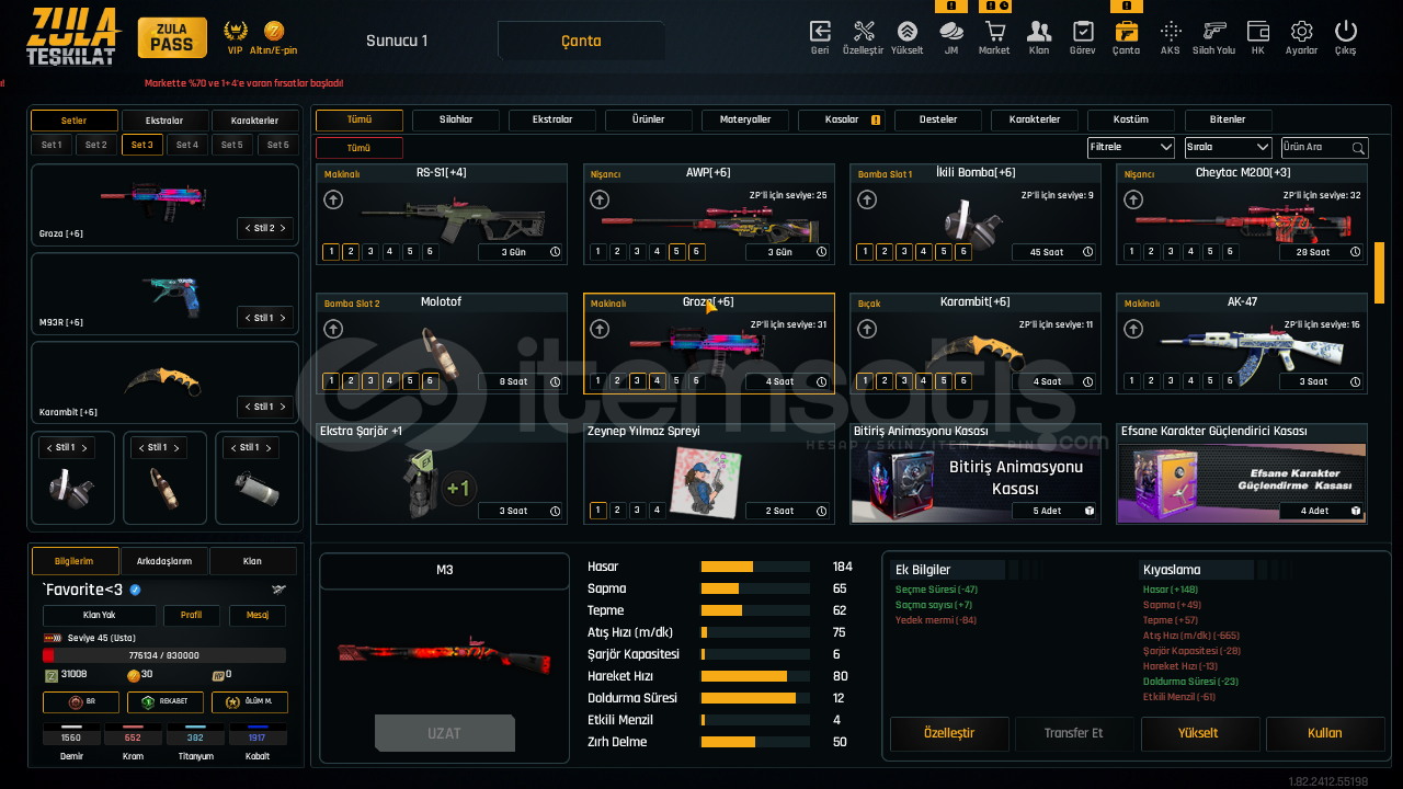 Yükseltmeler sizin için önemliyse gayet güzel bir hesap fiyat performans hesabıGroza +6Awp+6Rs s1+4Kar98+5İkili bomba +6Pp-2000+5Mpt76+5Trx+5Gölge +5M93r+6M4 super 90+6Tommy gun+6L115a3+1Karambit +6Ustura+6Atak+1Msr01+1P90+4Spas-12+4Mk3+6Cheytac m200+3