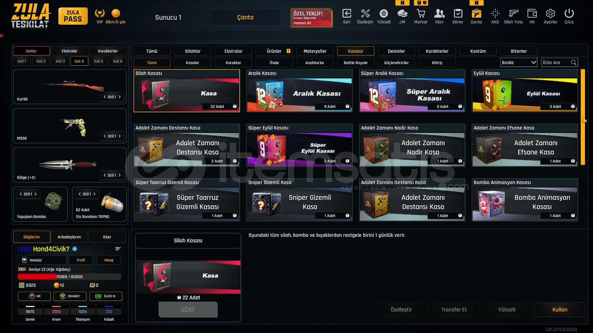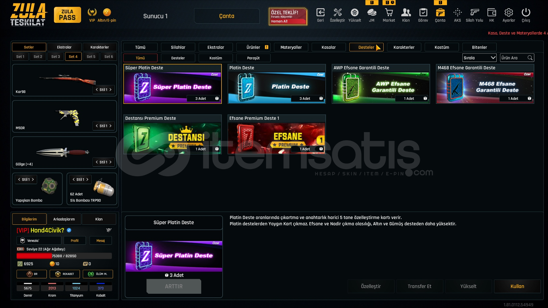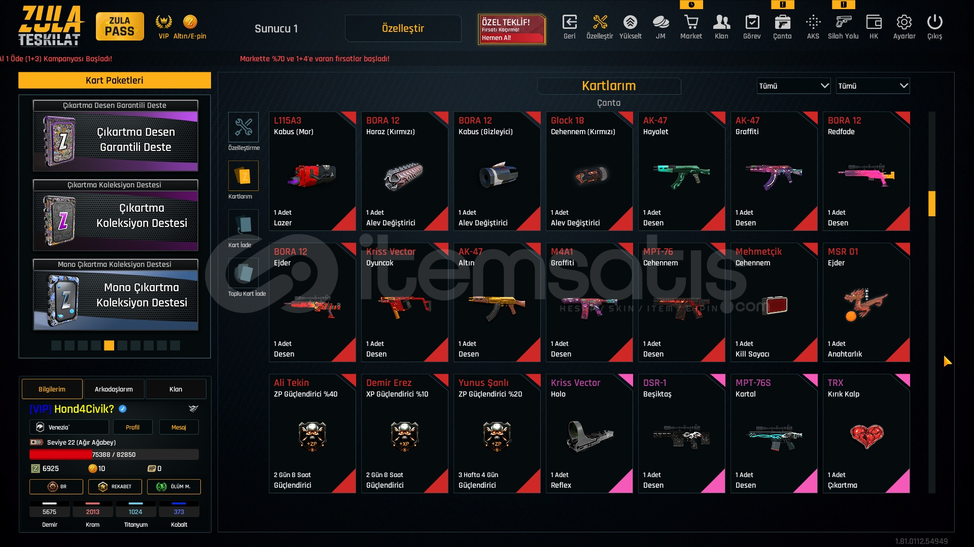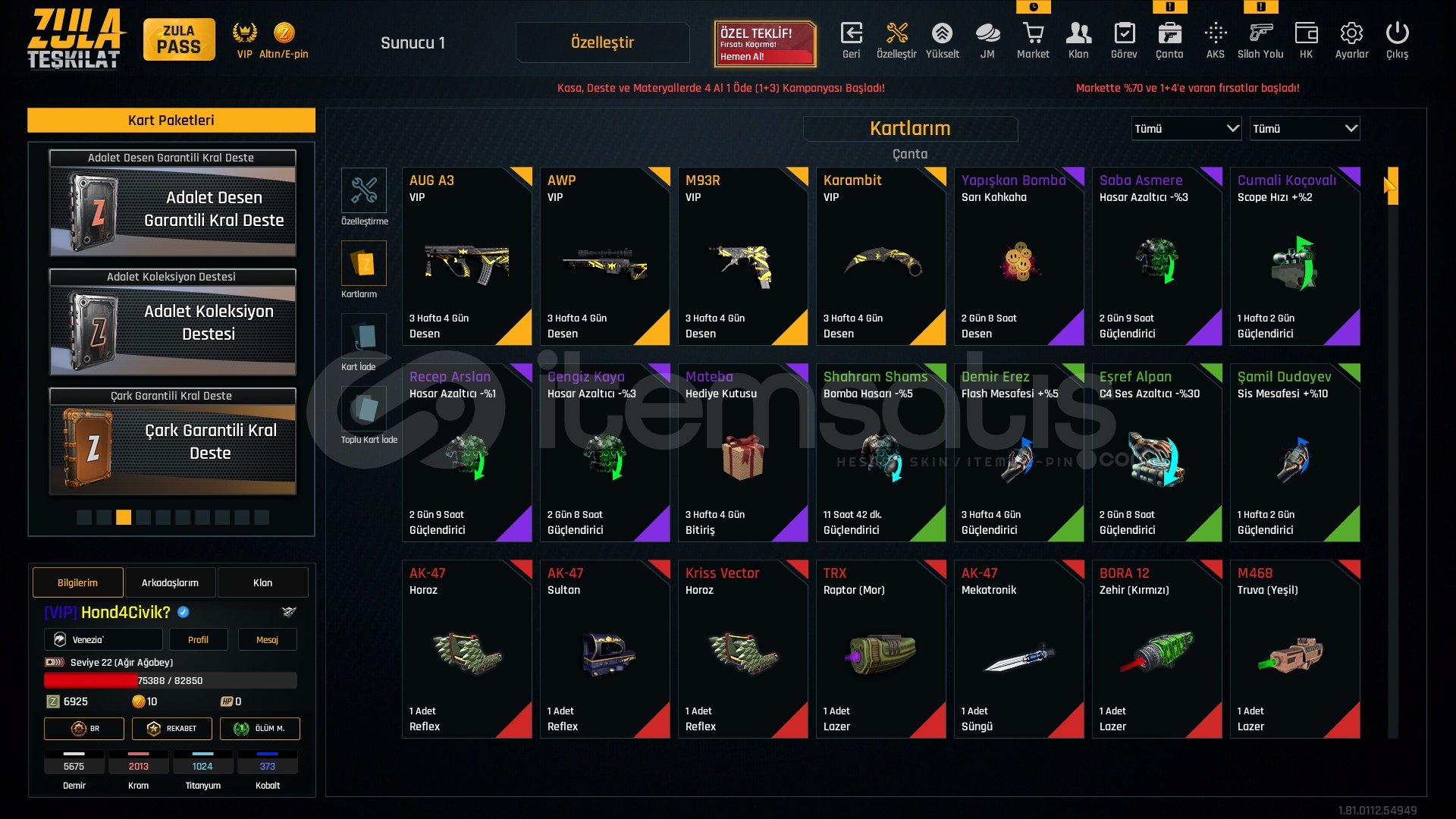 VIP Bitiş Tarihi 01.01.2026Rekabet Modu AçıkZula Pass Ücretsiz 41 Seviye57 Adet Kasa10 Adet Deste163 Adet Adalet Zamanı Jetonu32 Günlük M93R29 Günlük KARAMBİT26 Günlük AUG25 Günlük AWP5675 ADET DEMİR2013 KROM1024 TİTANYUM37?.. KOBALTKARAMBİT +1GÖLGE +4MPT 76 +5CHEYTAC +4M4SUPER 90 +4TOMMYGUN +3MK3 +345 ADET ODADAN ATMA62 ADET TRPYÜZDE 50 BAŞARI ARTTIRICIHESAP BAĞLARI TEMİZ