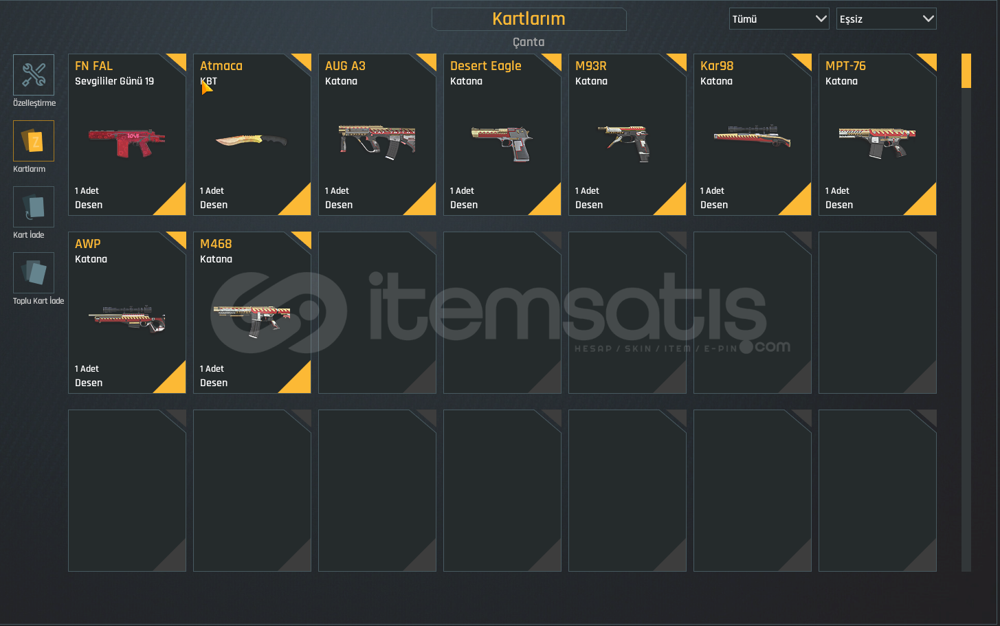 ⚡HESAP P-3 SEVİYEDİR.⚡. . .❗21 ADET SINIRSIZ ❗. . .❗2014 KURULUMLU MÜKEMMEL HESAP KAÇIRMAYIN❗. . .SKİNLER ;🔥ATMACA KBT DESEN🔥KATANA DESENLERİ🔥SEVGİLİLER GÜNÜ DESENLERİ🔥ALTUN USTASI DESENLERİ🔥SON SAMURAY DESENLERİ🔥ÇANAKKALE DESENLERİ🔥RACER DESENLERİ🔥ON BİR AY DESENLERİ🔥TROPİK DESENLERİ...
