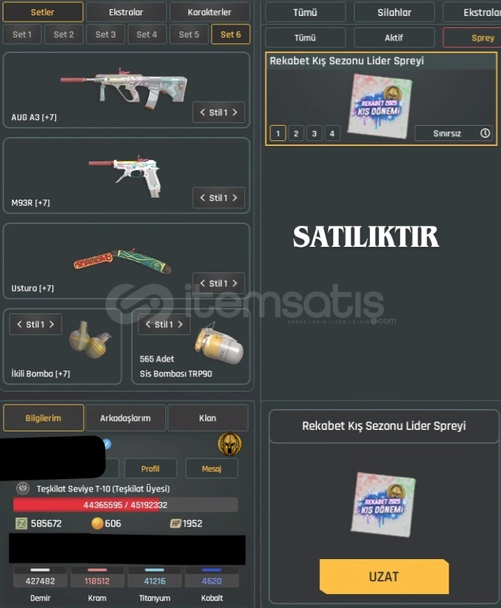 Lider spreyiRekabet şampiyon spreyi2x tdm şampiyon spreyiRekabet tdm efsane spreyler Ustura 2018Meta silahlar +7Meta silahlar özelleştirme fullZeynep Yılmaz güçlendirici fullElena güçlendirici full600k zp bulunur