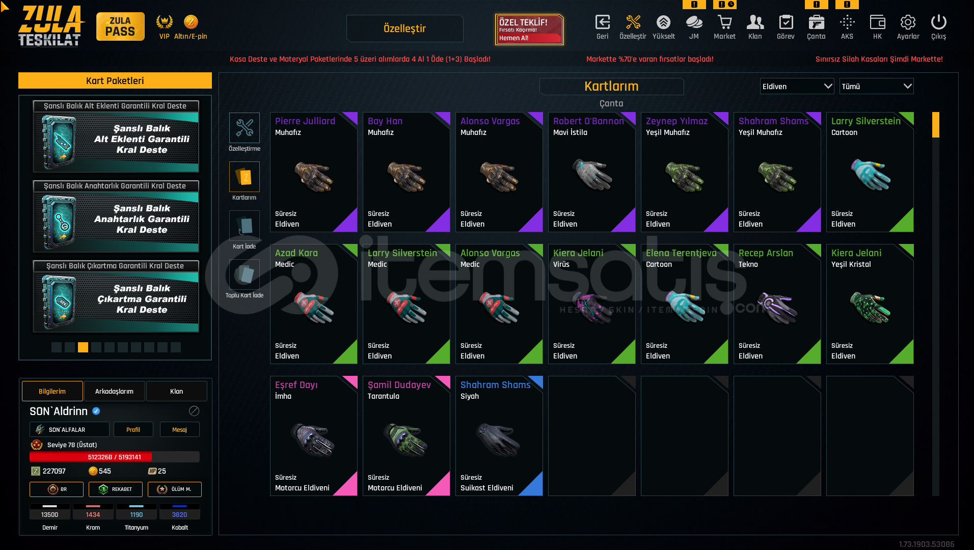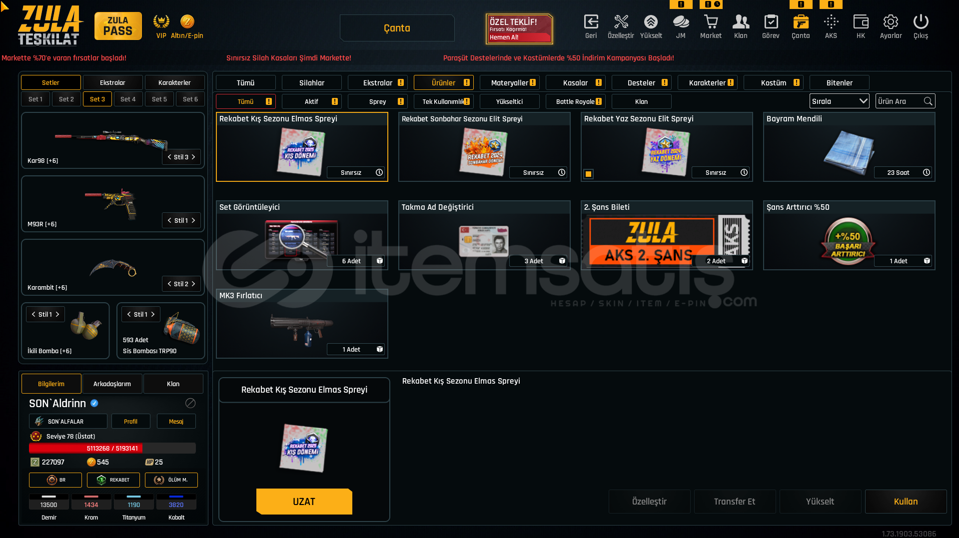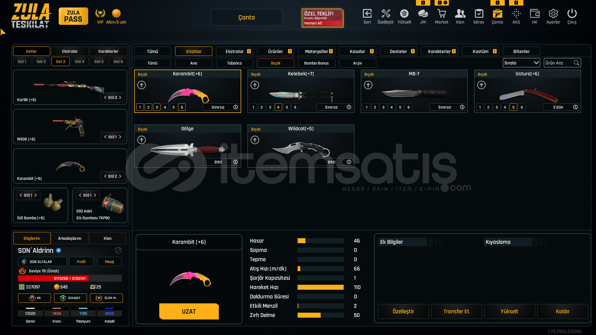 +6 kar98(quantum susturucu 3 adet)+6 m93r(siyah quantum 1 adet) +6 SINIRSIZ karambit+6 ikili bomba+6 aug a3(quantum susturucu 9 adet)+5 awp(quantum susturucu 1 adet)+4 mpt 76(quantum susturucu 1 adet)+6 l115a3(quantum susturucu 5 adet)+6 ustura +6 glock18(quantum susturucu 2 adet)+4 m468(quantum susturucu 1 adet)+7 SINIRSIZ kelebek SINIRSIZ Çelik yelek %10,SINIRSIZ Hızlı Canlanma %25,SINIRSIZÇelik Yelek %5,SINIRSIZ Ekstra Şarjör+2,SINIRSIZ Dokunul...