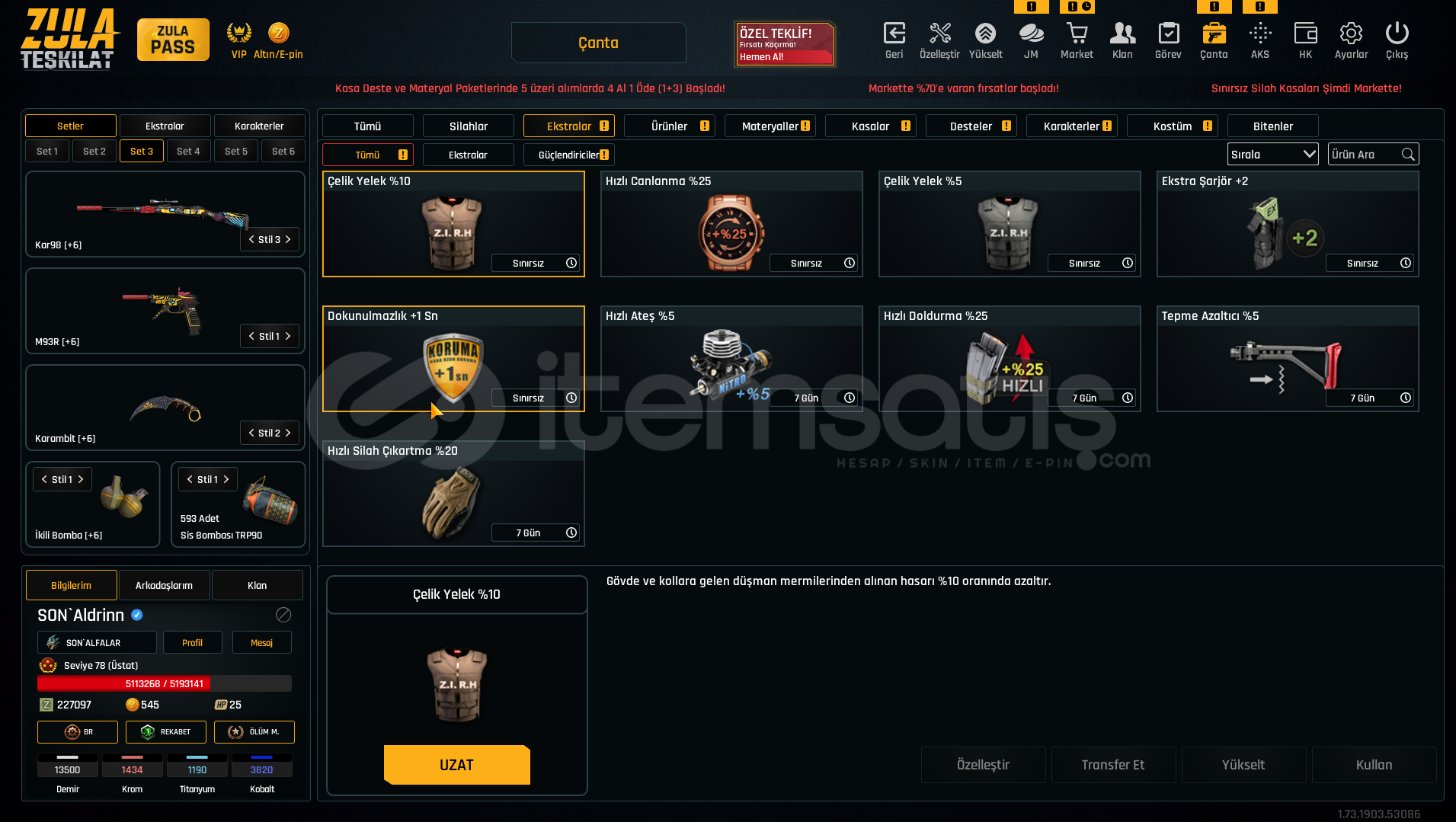 SINIRSIZÇelik Yelek %5,SINIRSIZ Ekstra Şarjör+2,SINIRSIZ Dokunulmazlık +1